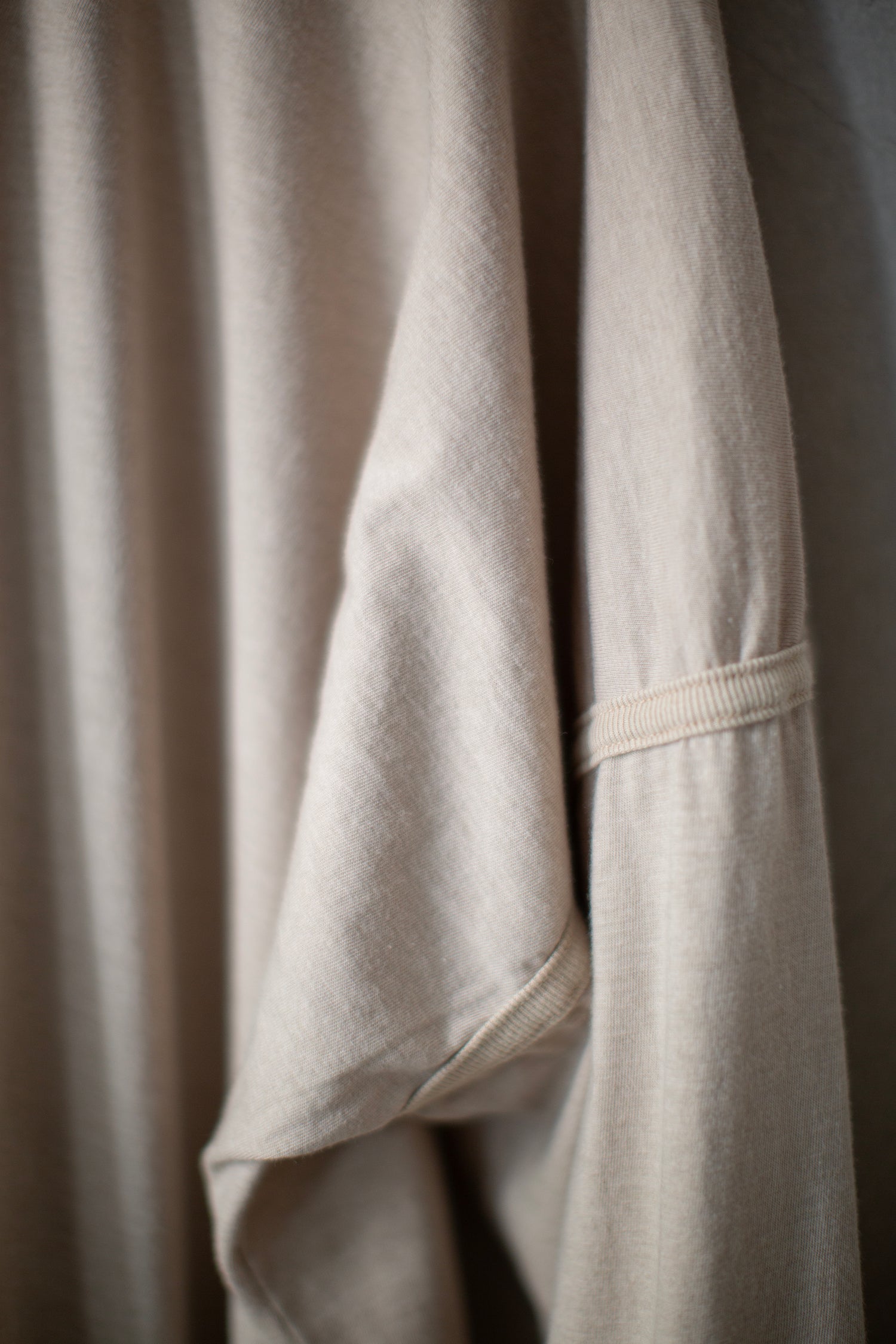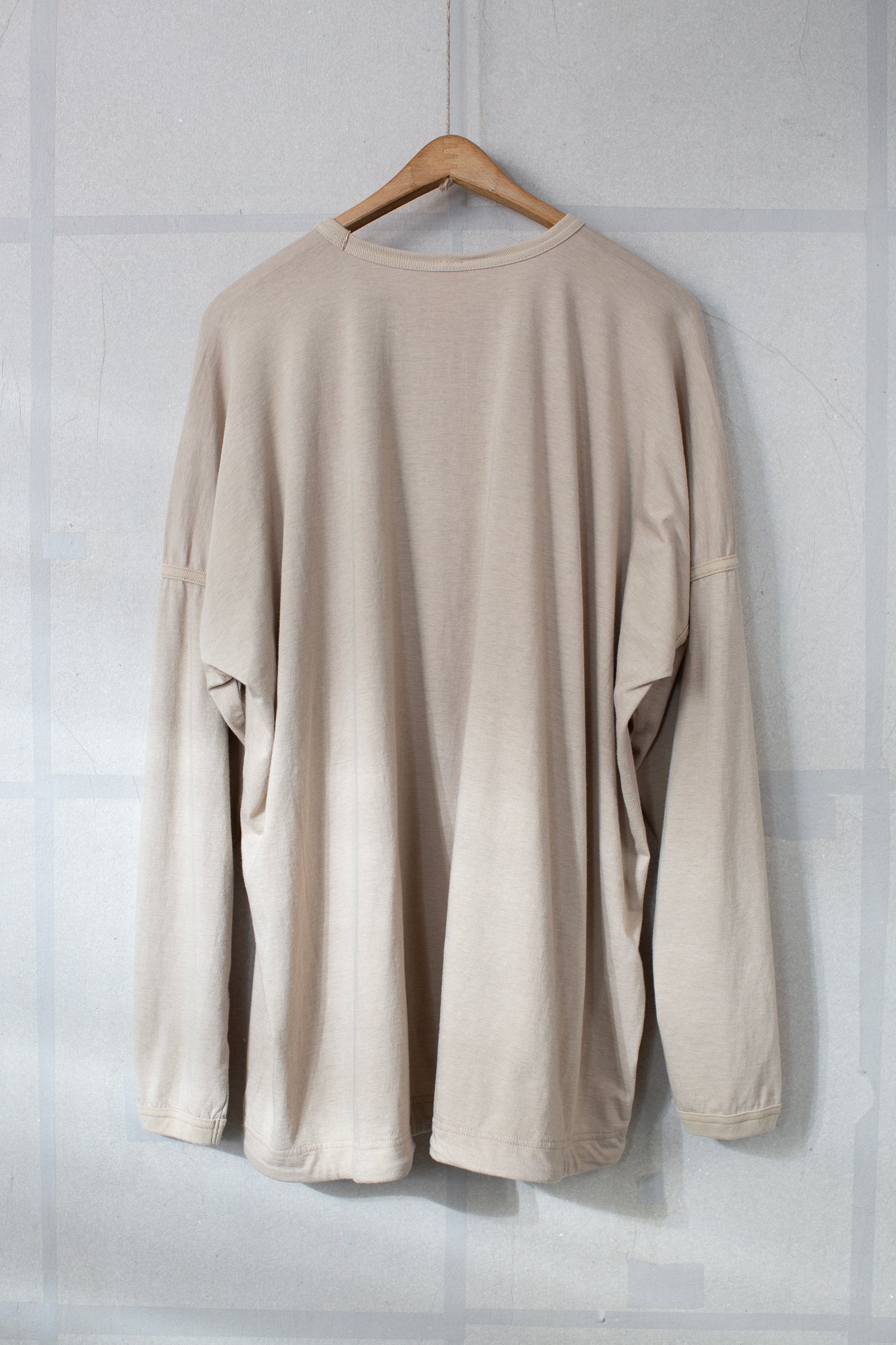 Long sleeve crewneck balloon tee in ash sand cotton wool jersey with taped seams and brand staple natural white drawstring in waist.