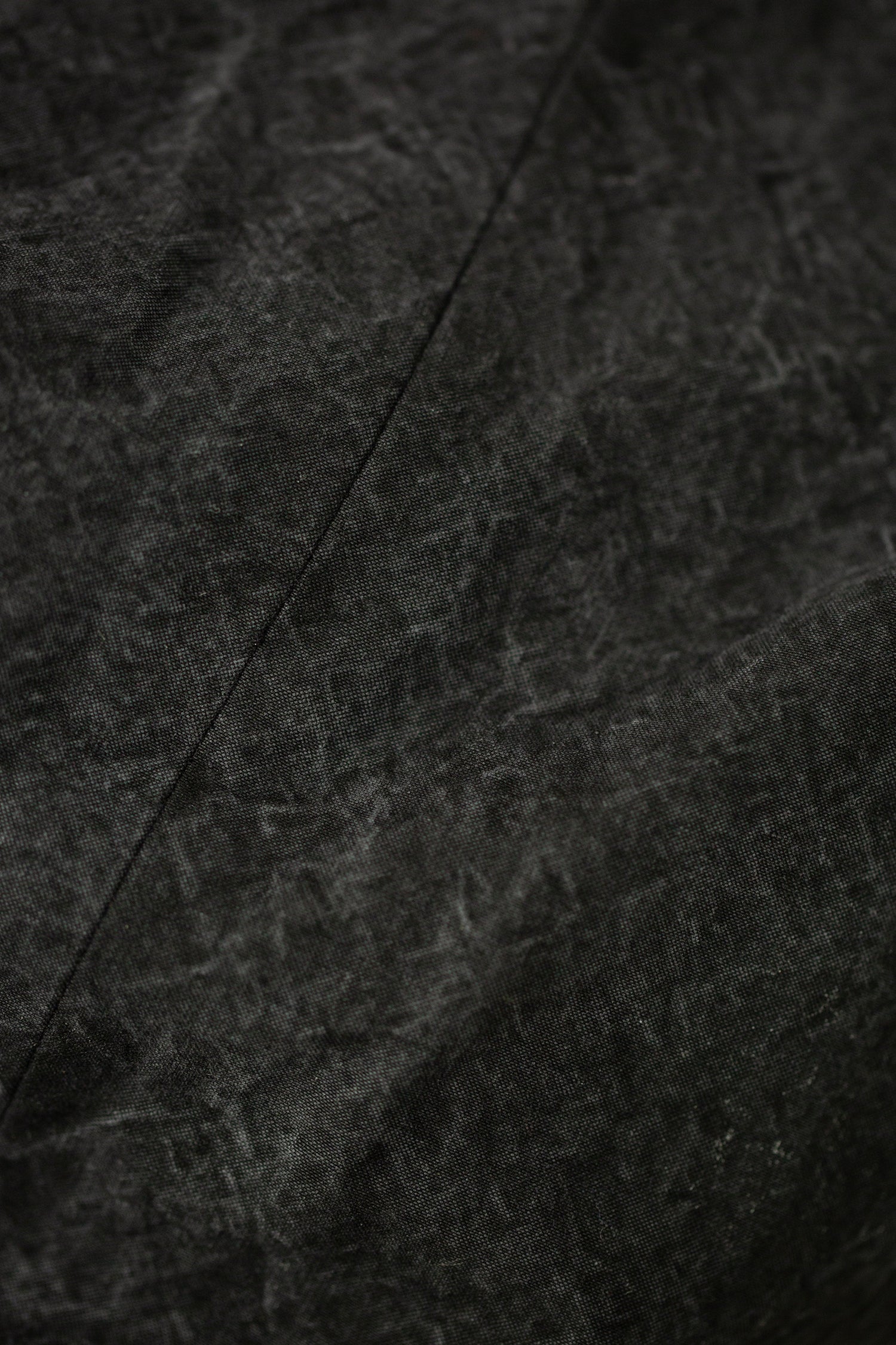THIS WATER RESISTANT FABRIC HAS BEEN SLOWLY WASHED IN OLD INDUSTRIAL MACHINES FOR 24 HOURS, RESULTING IN A WATER RESISTANT CANVAS WITH A WAXY DENSITY. THE VISIBLE WRINKLES LEAN TOWARDS A NUANCED BLACK AND GREY TONE.