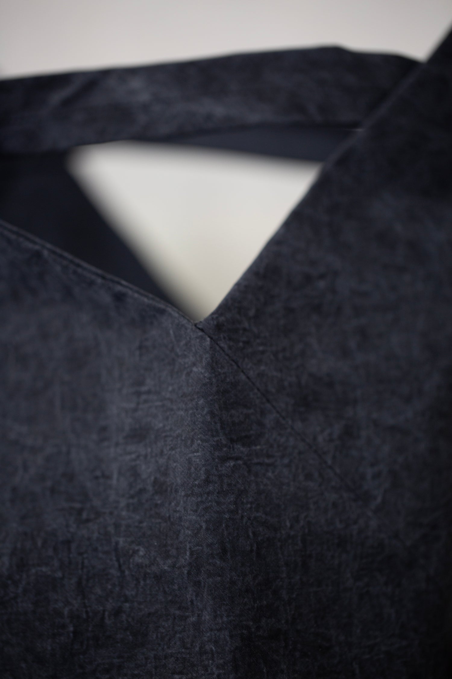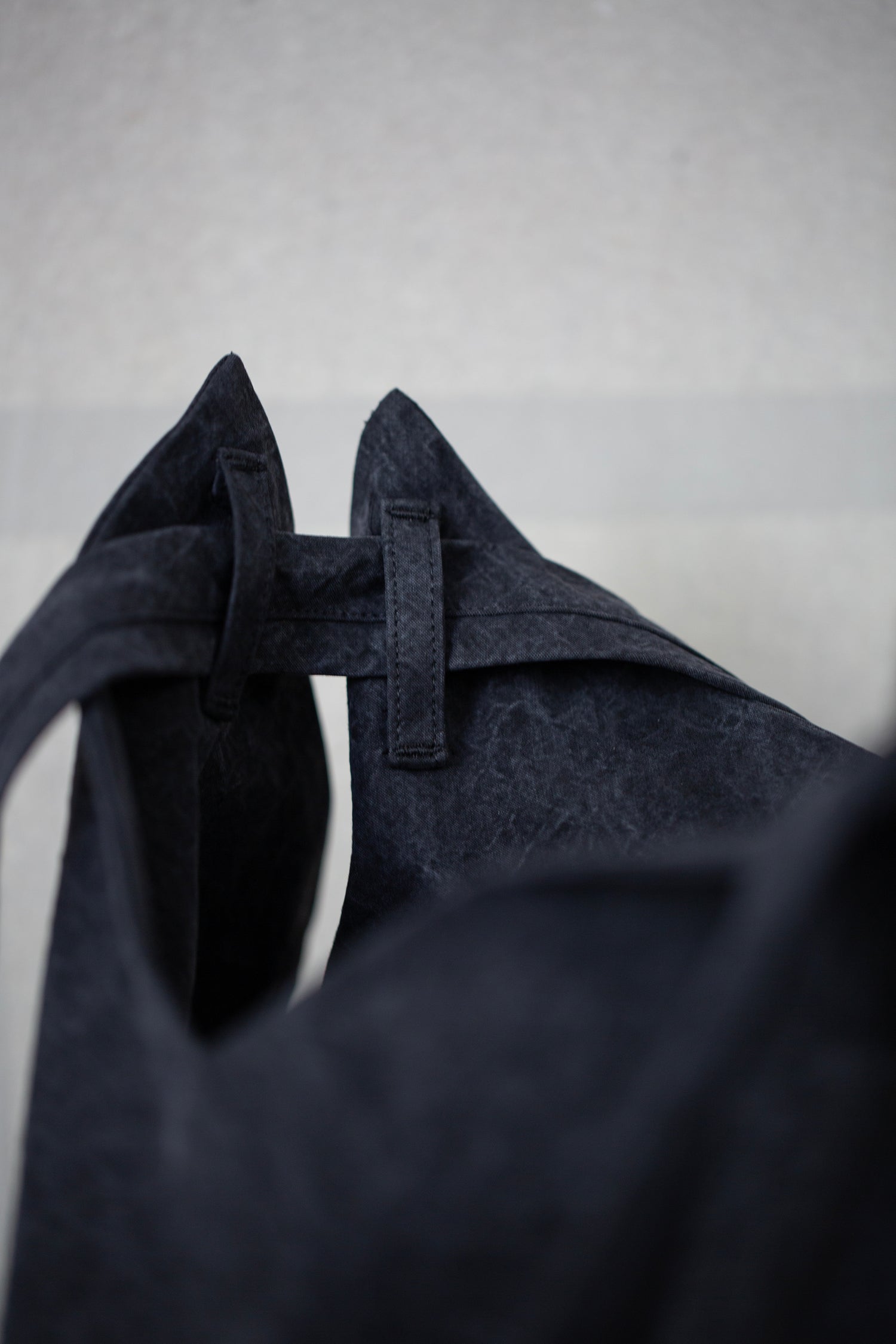 THIS WATER RESISTANT FABRIC HAS BEEN SLOWLY WASHED IN OLD INDUSTRIAL MACHINES FOR 24 HOURS, RESULTING IN A WATER RESISTANT CANVAS WITH A WAXY DENSITY. THE VISIBLE WRINKLES LEAN TOWARDS A NUANCED BLACK AND GREY TONE.