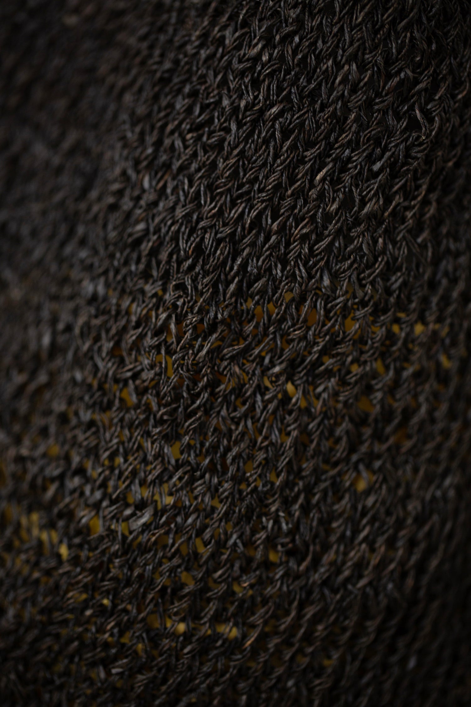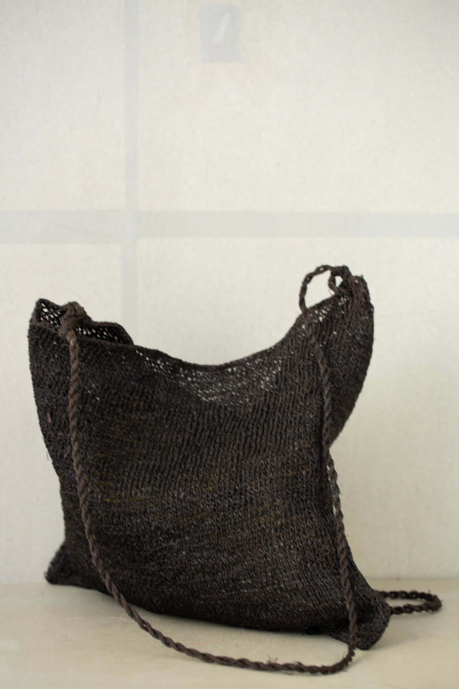 This bag is hand knitted with raw hemp grown by the Hmong tribe in Northern Thailand. It is dyed in Japan and Singapore with kaki shibu, using persimmons grown in the mountains of Kyoto. It is dyed and aged under the sun for a period of time. It might feel a little stiff initially but it will soften after time and use. Please hand wash it gently in warm water, using mild detergent. Be aware of acidic substances such as vinegar or citrus fruits as they may cause discoloration.