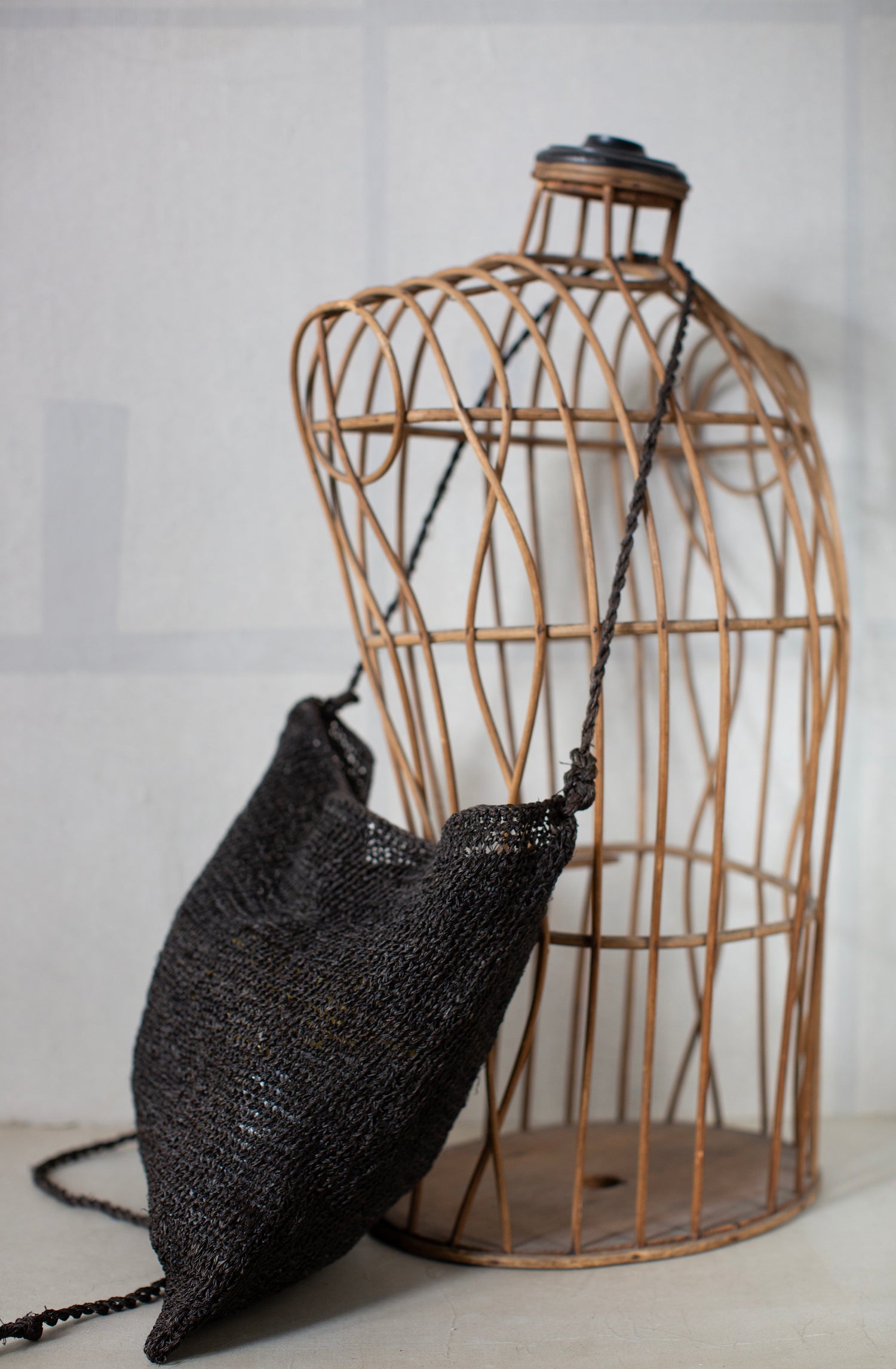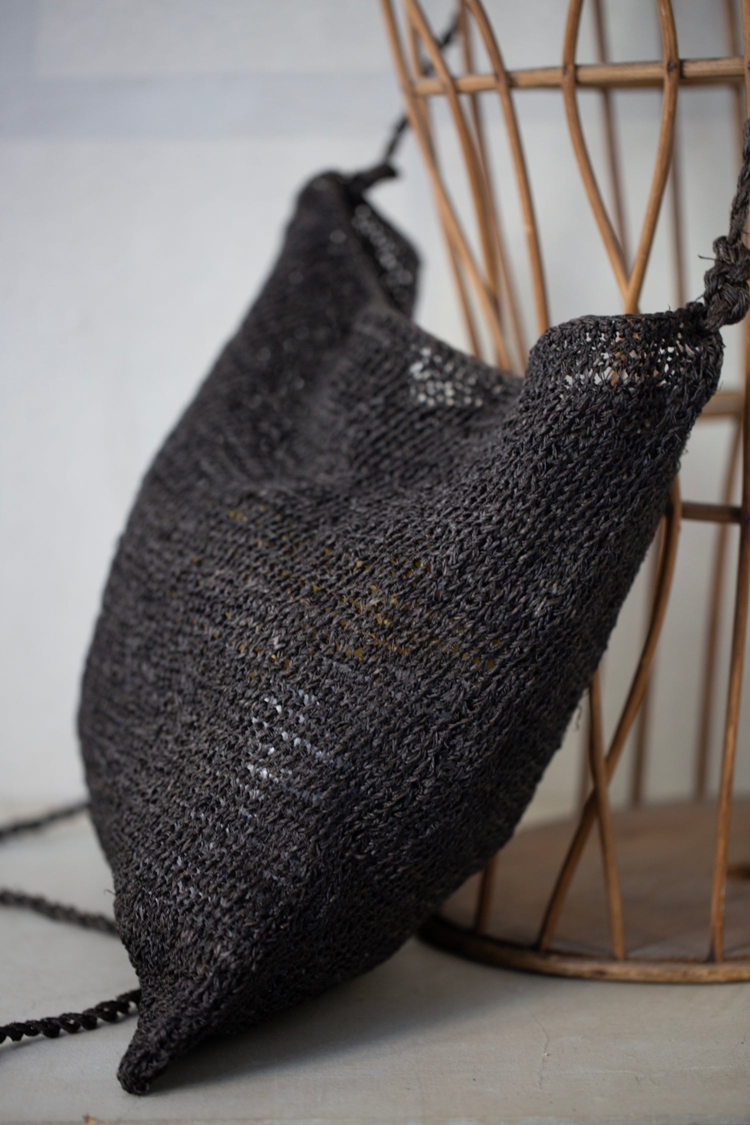 This bag is hand knitted with raw hemp grown by the Hmong tribe in Northern Thailand. It is dyed in Japan and Singapore with kaki shibu, using persimmons grown in the mountains of Kyoto. It is dyed and aged under the sun for a period of time. It might feel a little stiff initially but it will soften after time and use.
