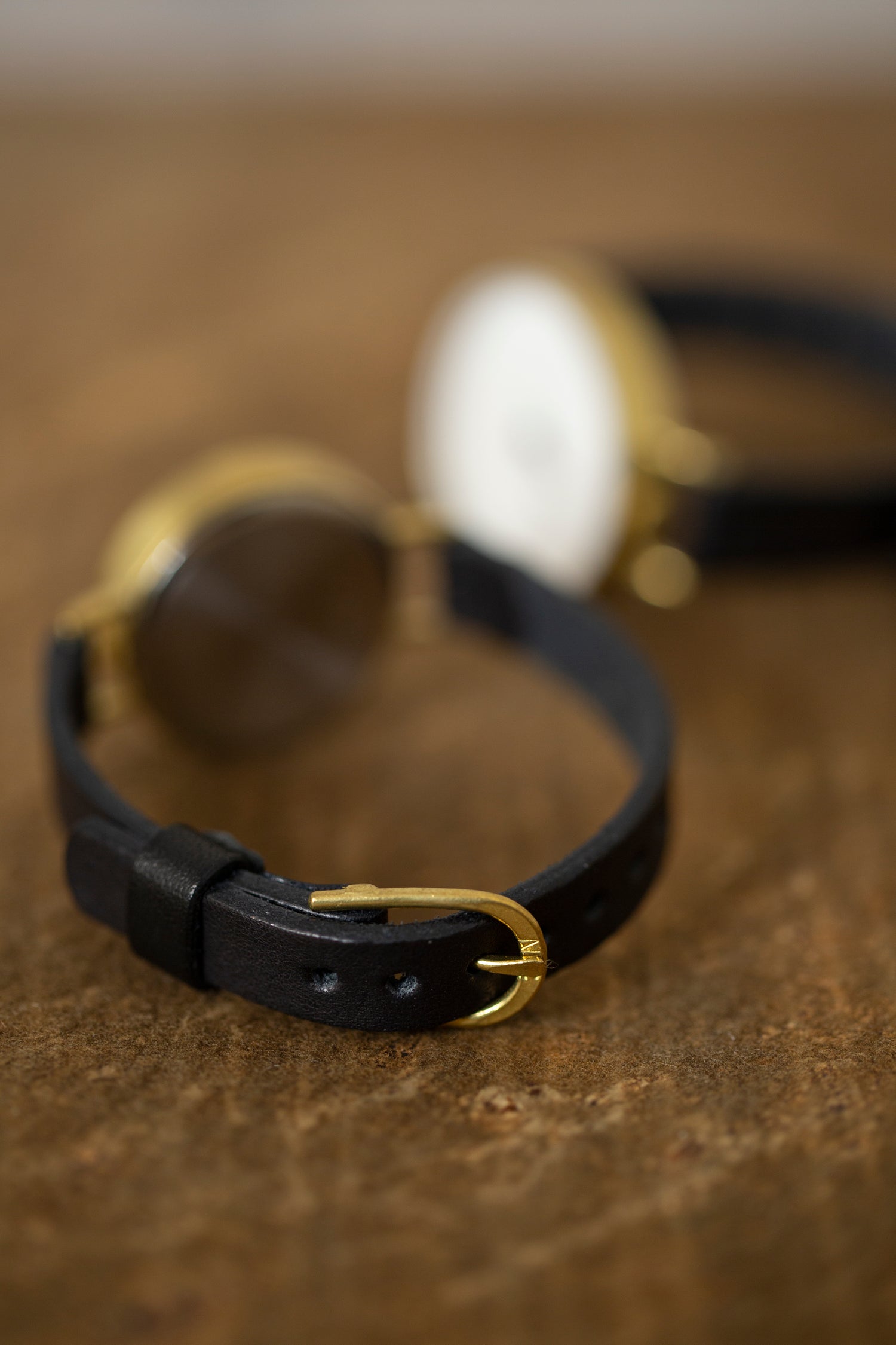 Handmade watch with leather bracelet and brass case and buckle.