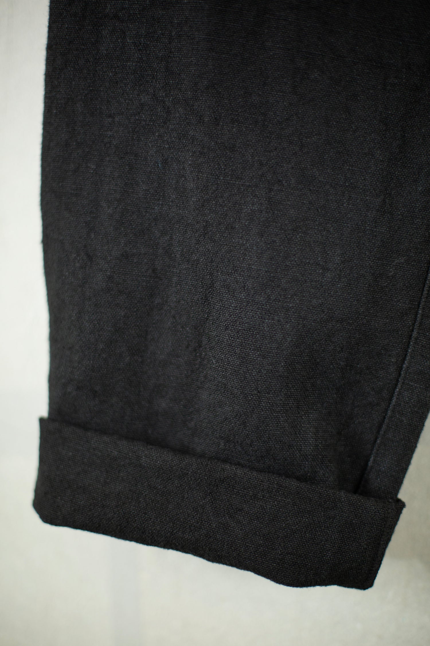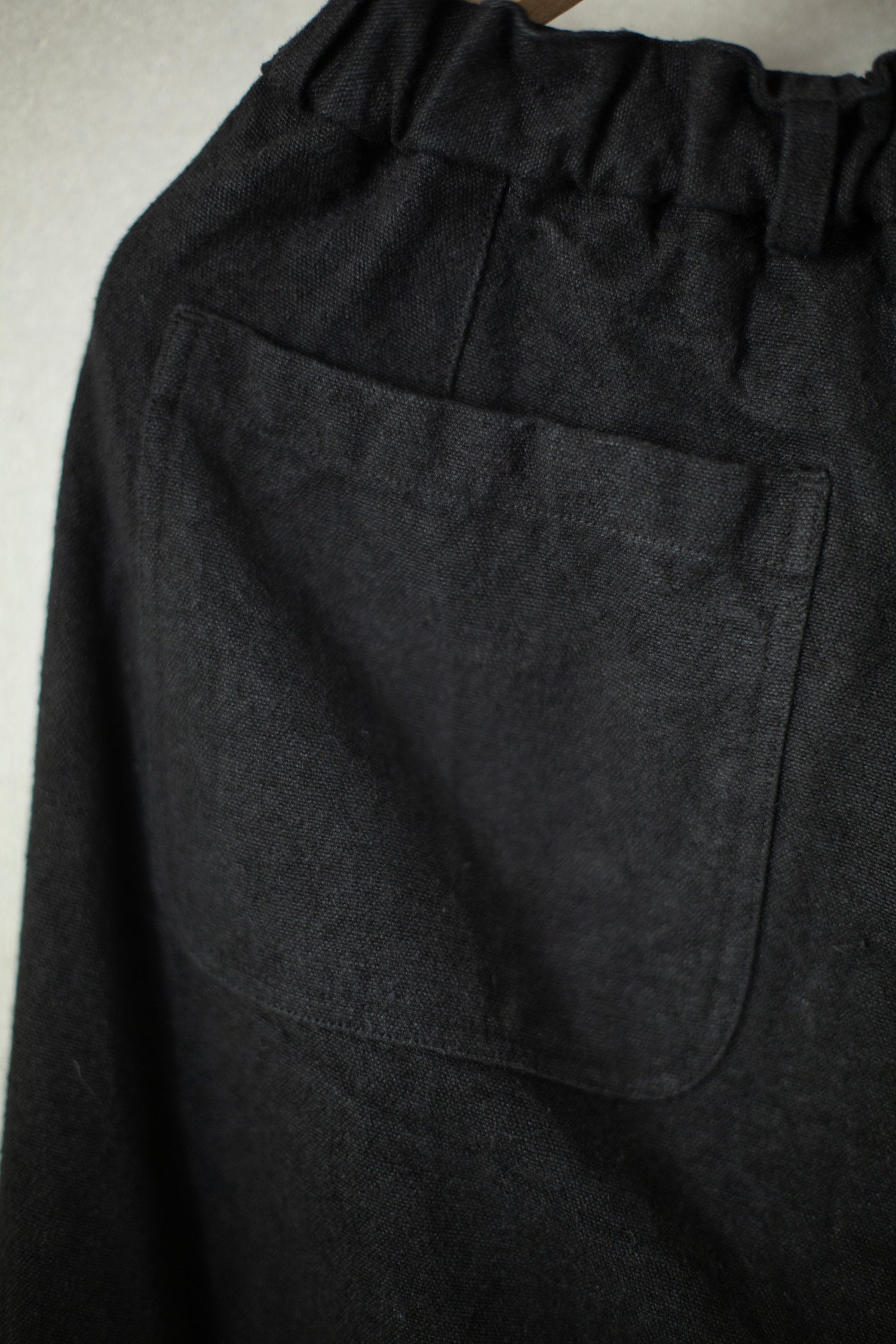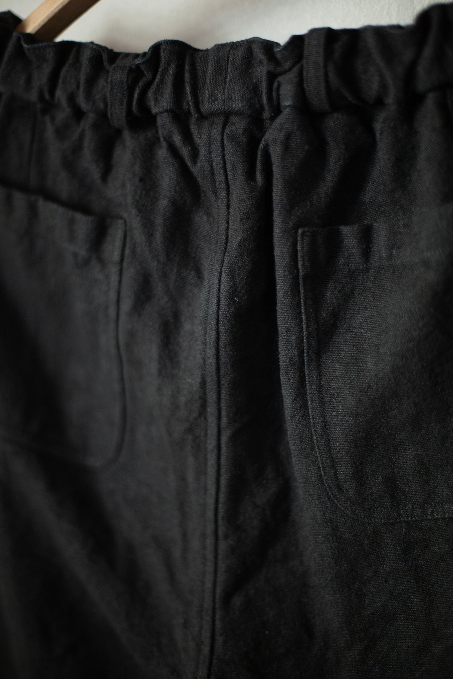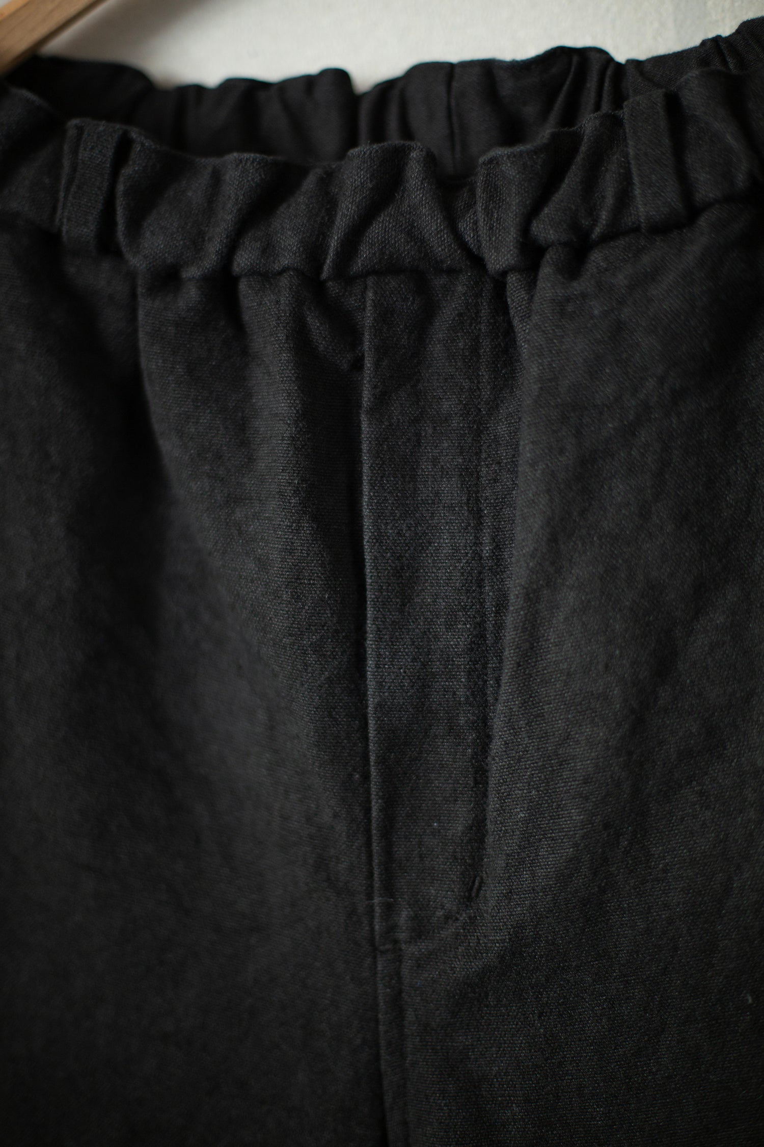 Slim trousers by Mittan in black brushed linen/ramie with elastic waist band, inner drawstring and side pockets.