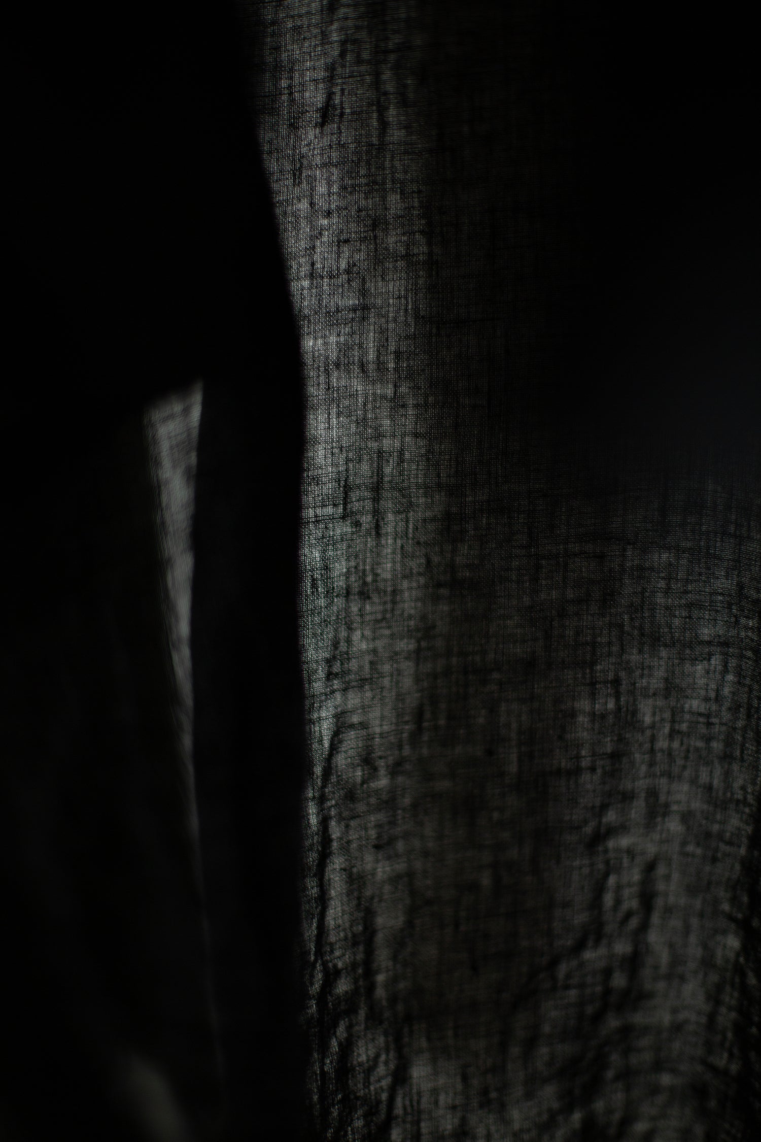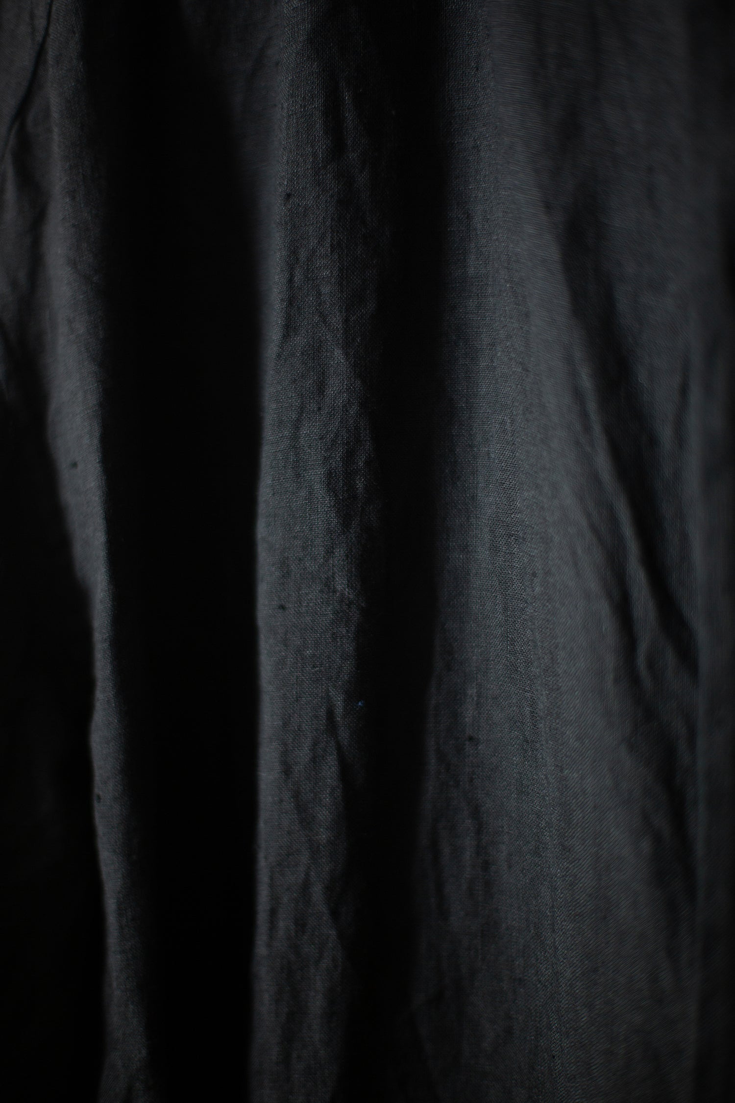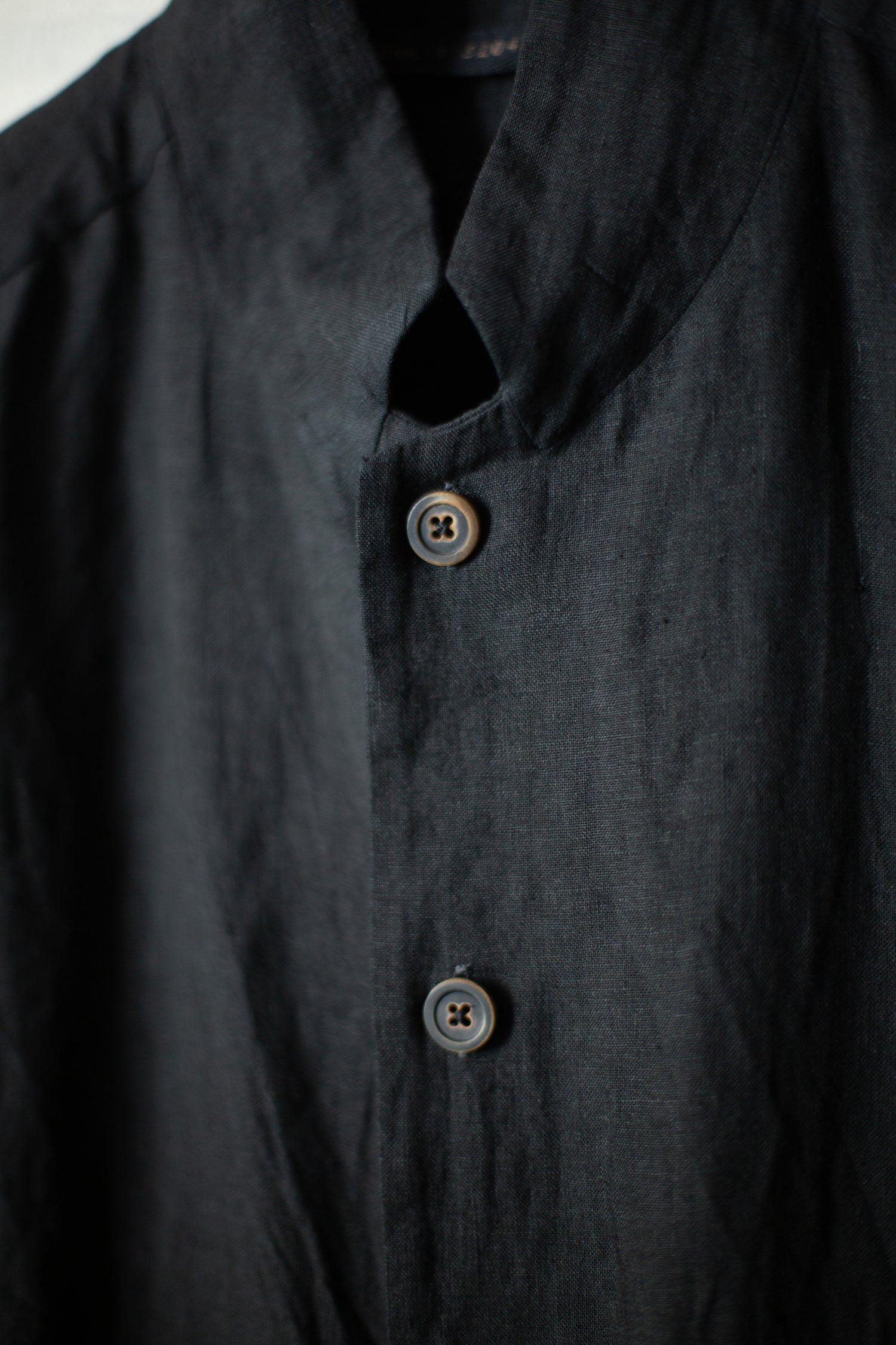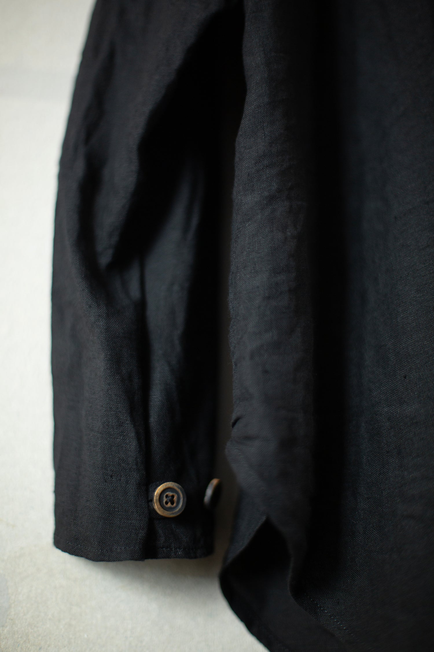 Loose fit black guru shirt by Forme D'Expression in linen with standing collar, front patch pocket and adjustable sleeve cuffs.