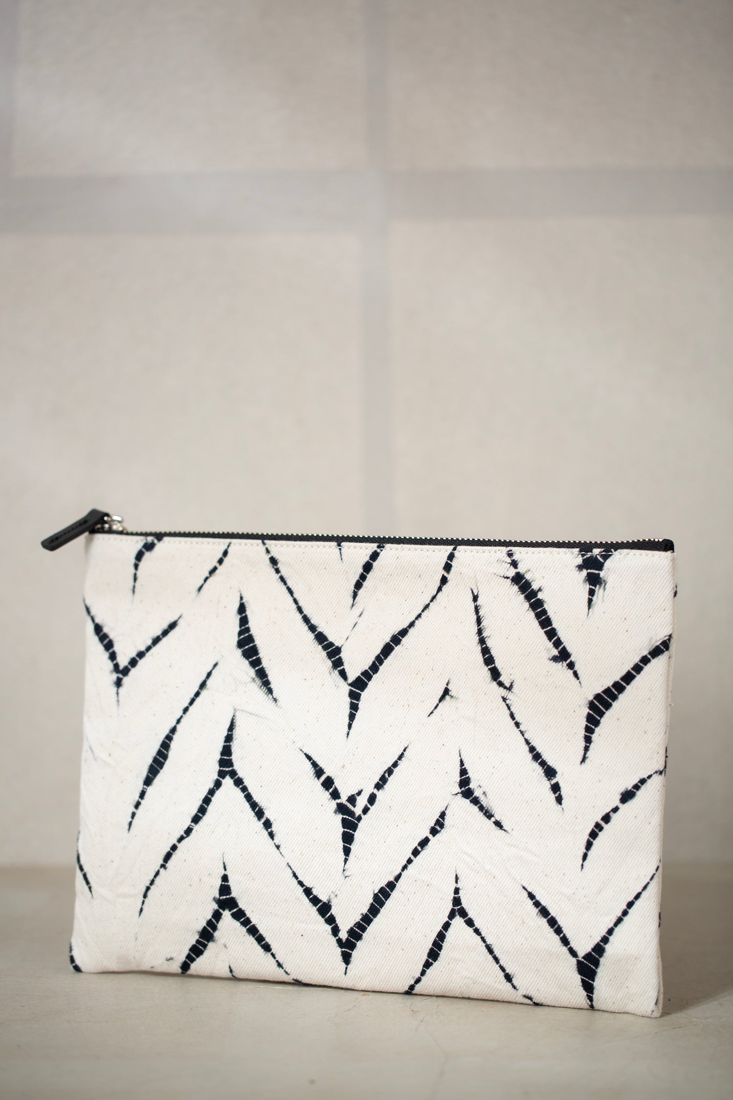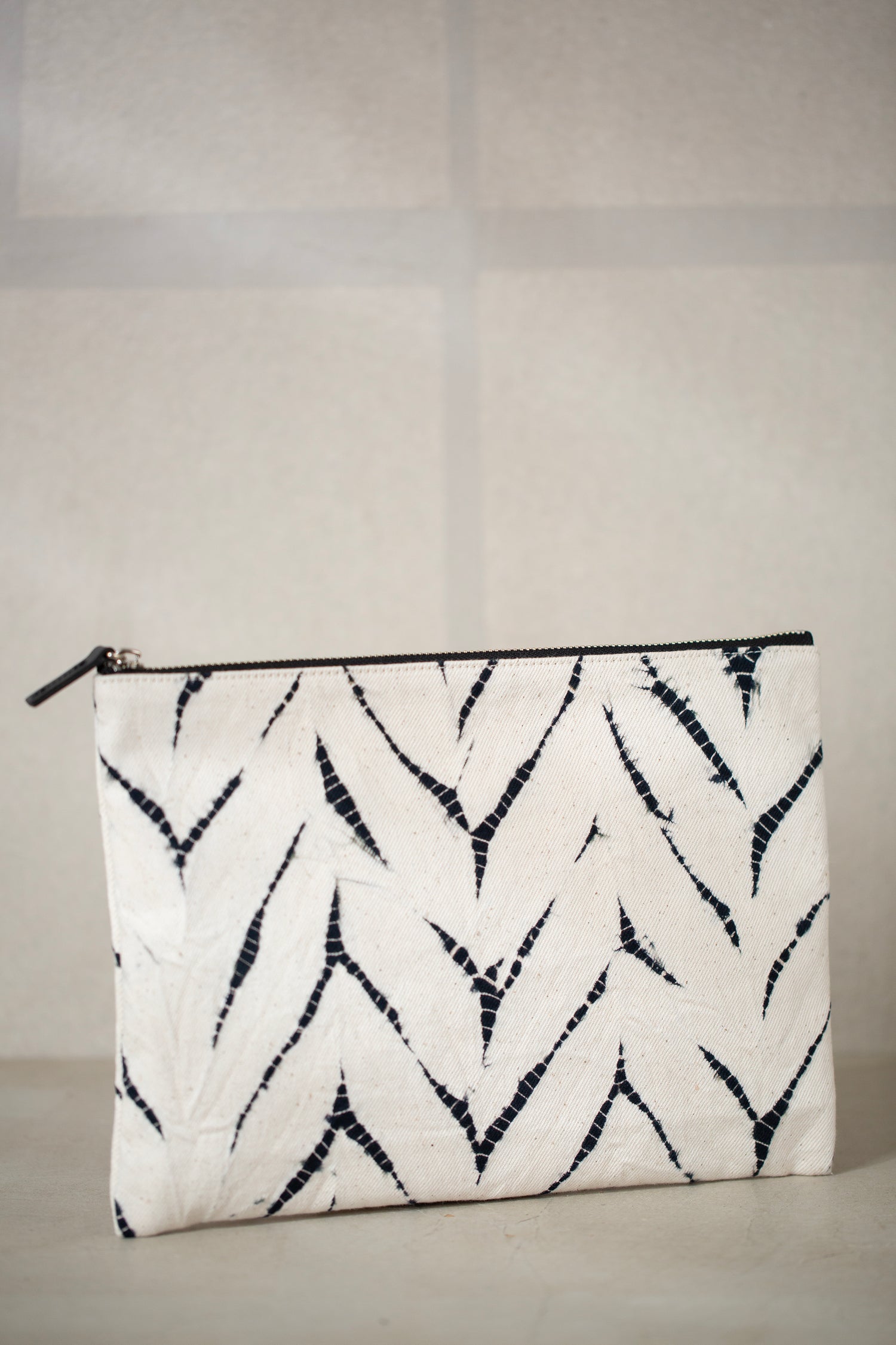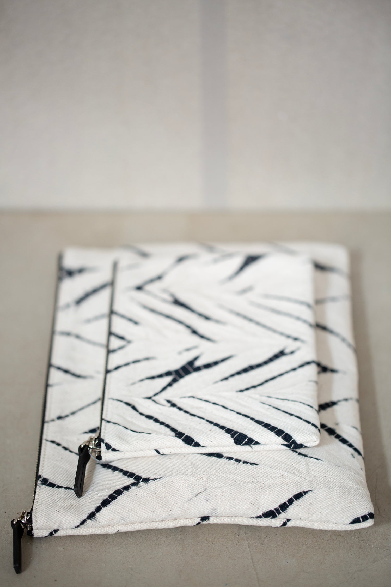 black / ivory organic cotton pouch M with shibori dyed pattern