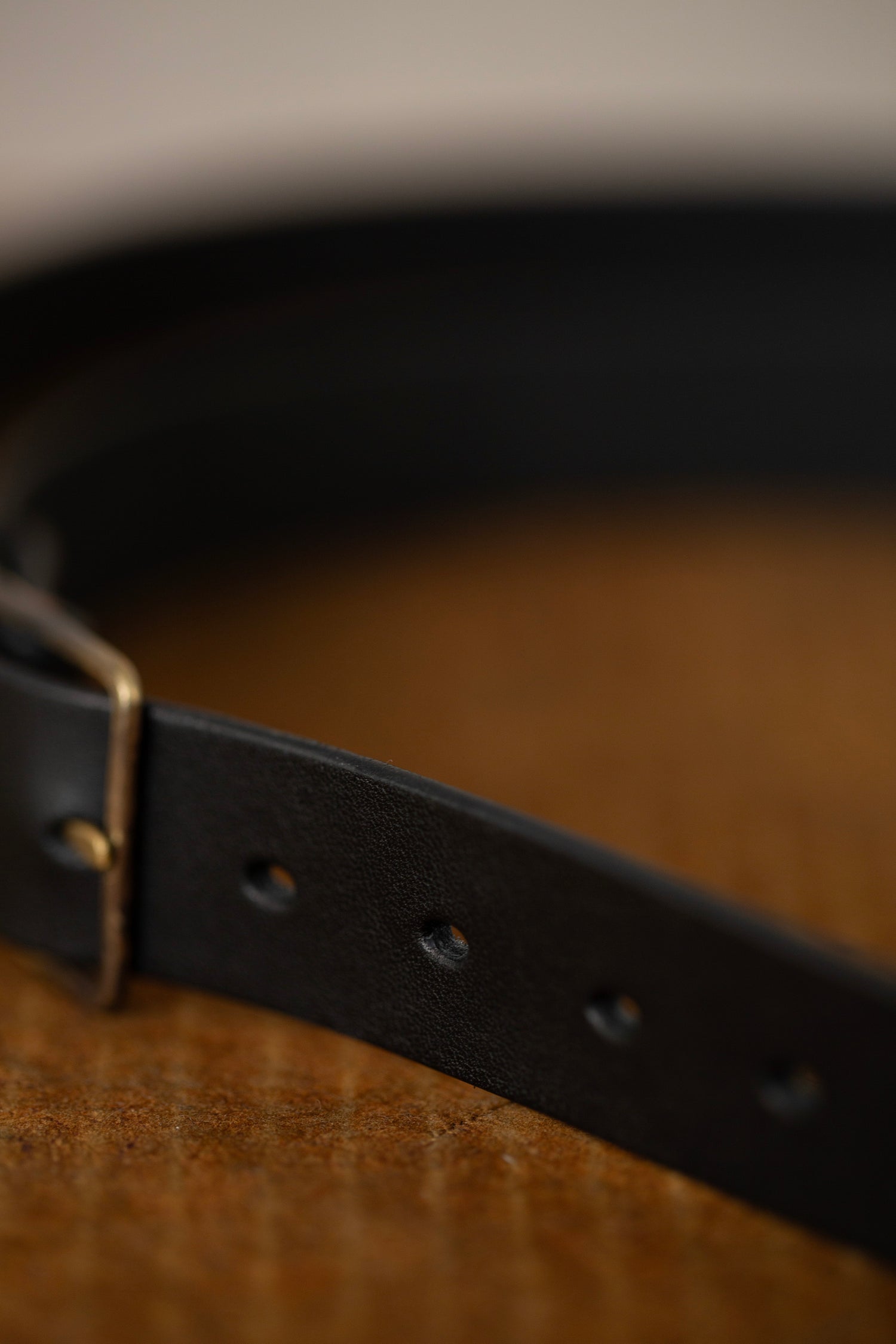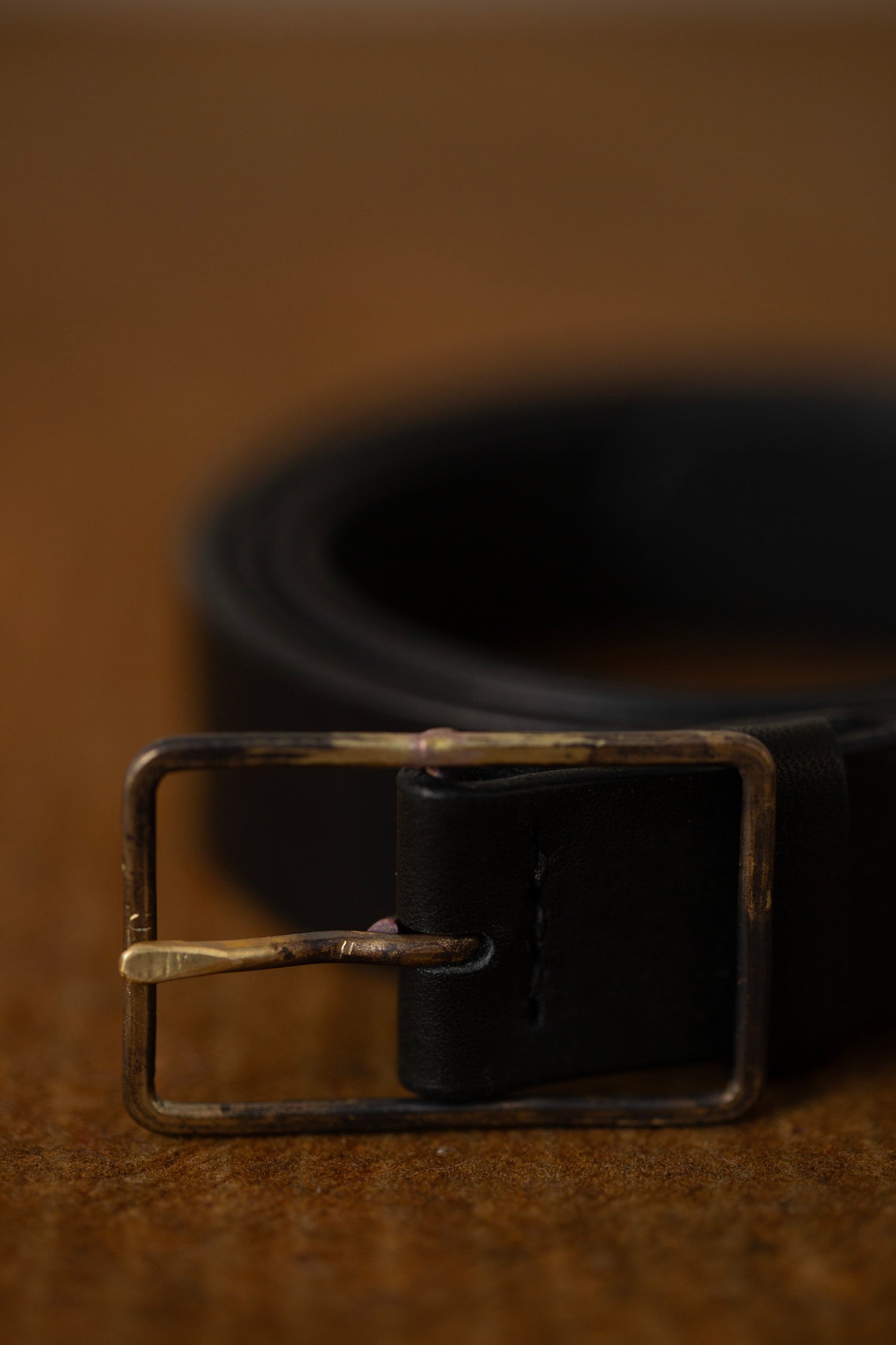 Black vegetable tanned leather belt with hand forged rectangular shape brass buckle by Nejicommu.