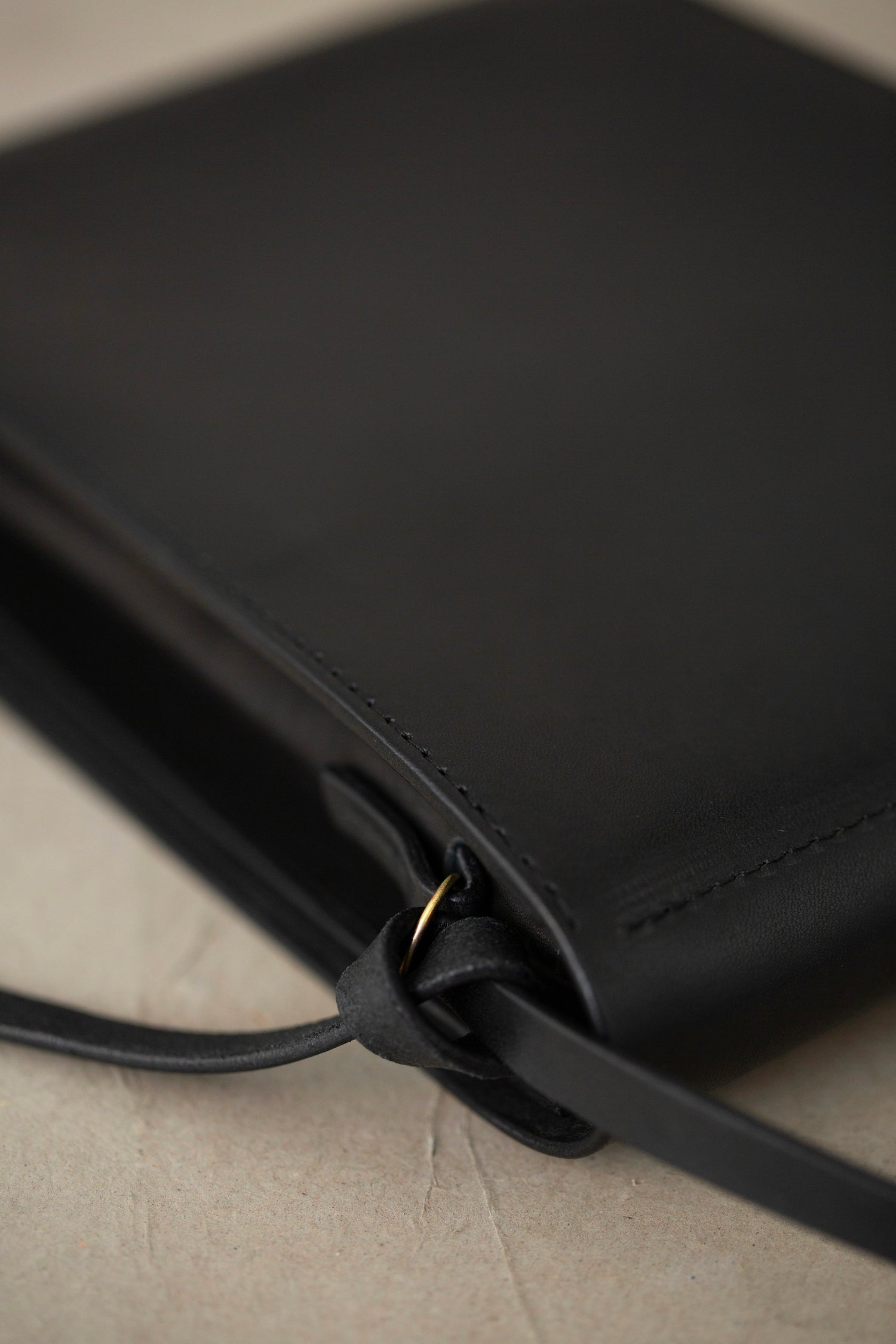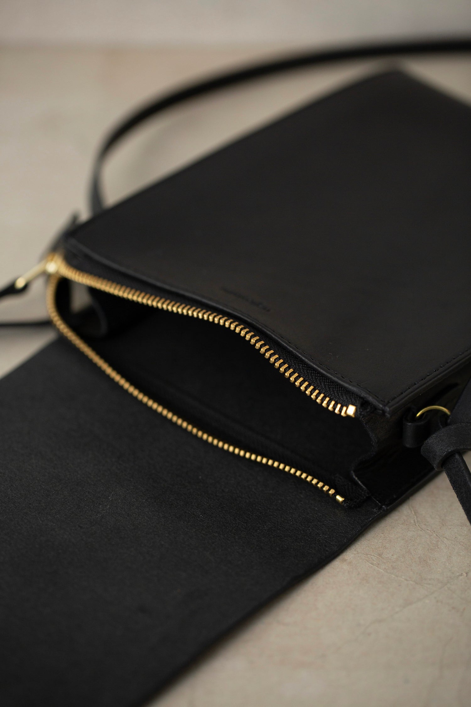 Black leather flap courier bag hand made by Nejicommu with a zipper closure and adjjustale belt strap by knotting.