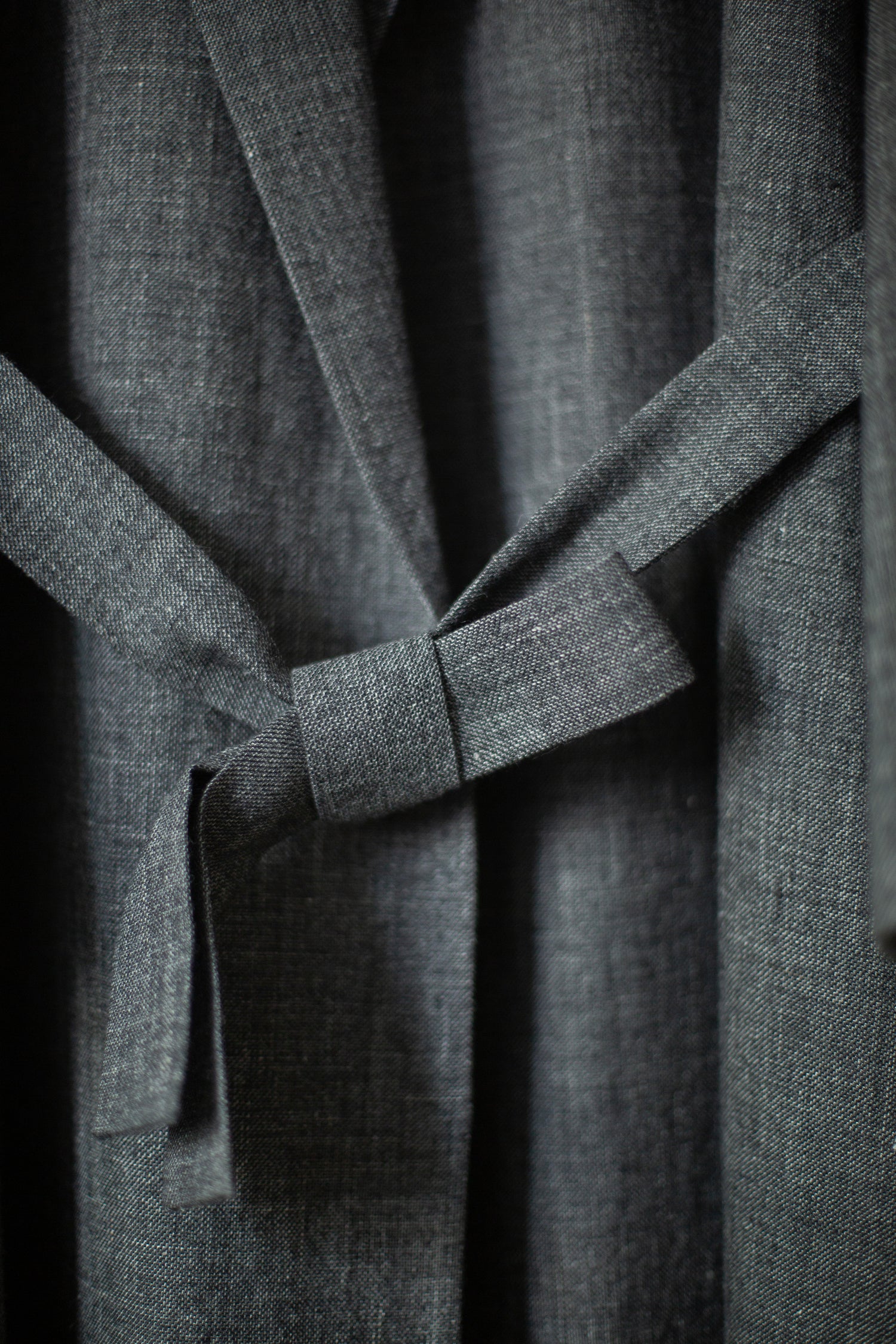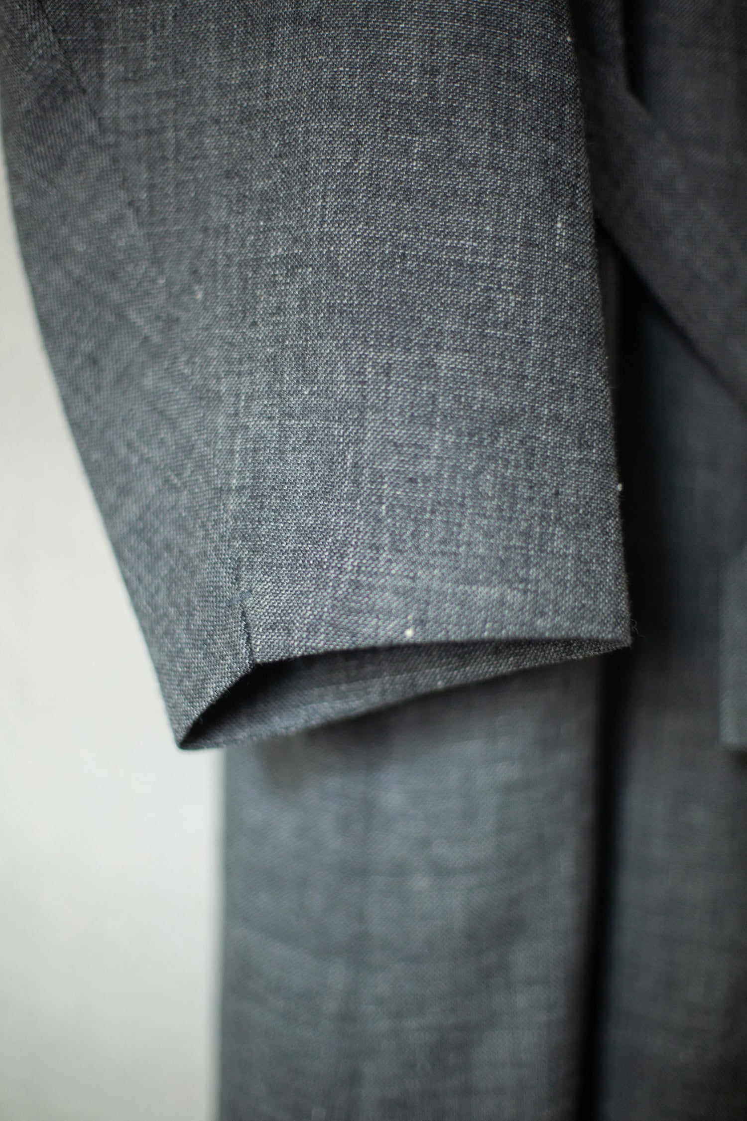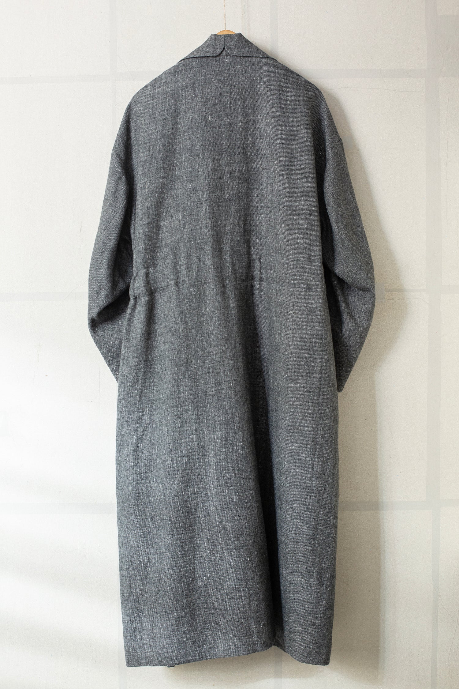 Black melange coat by Cosmic Wonder with belt through tunnel in back, rounded lapel, small splits in sleeve cuffs and inseam side pockets.