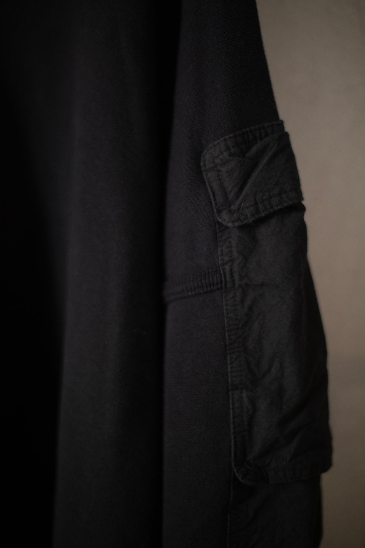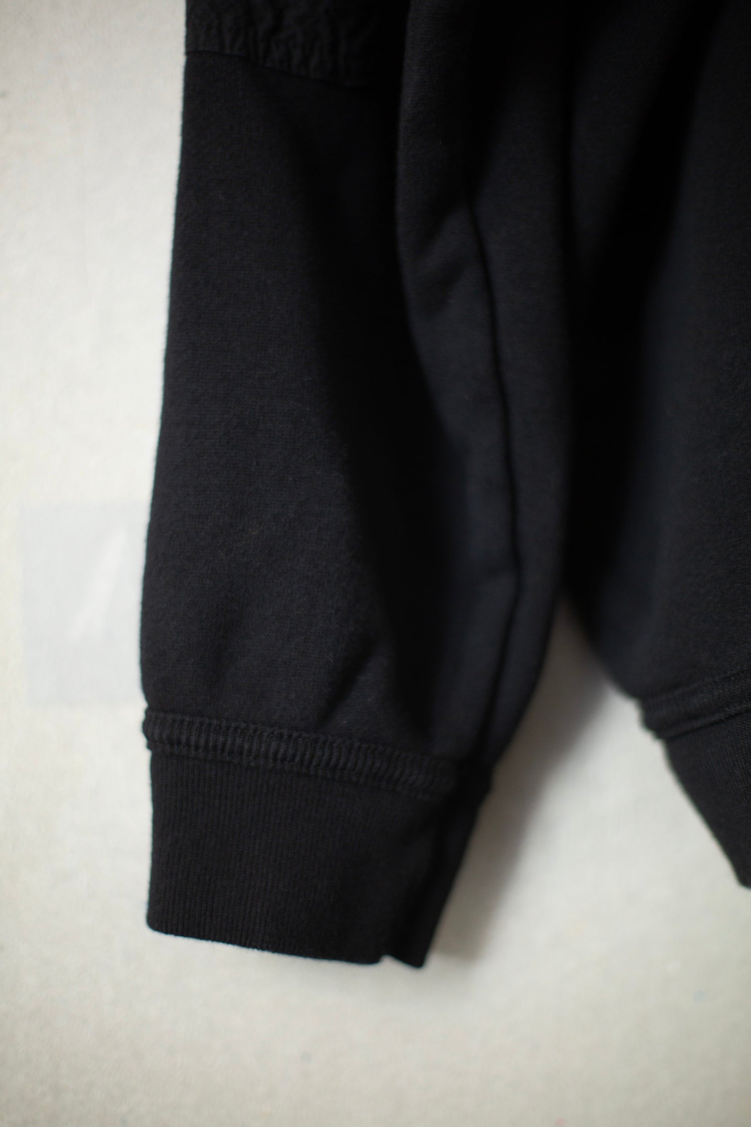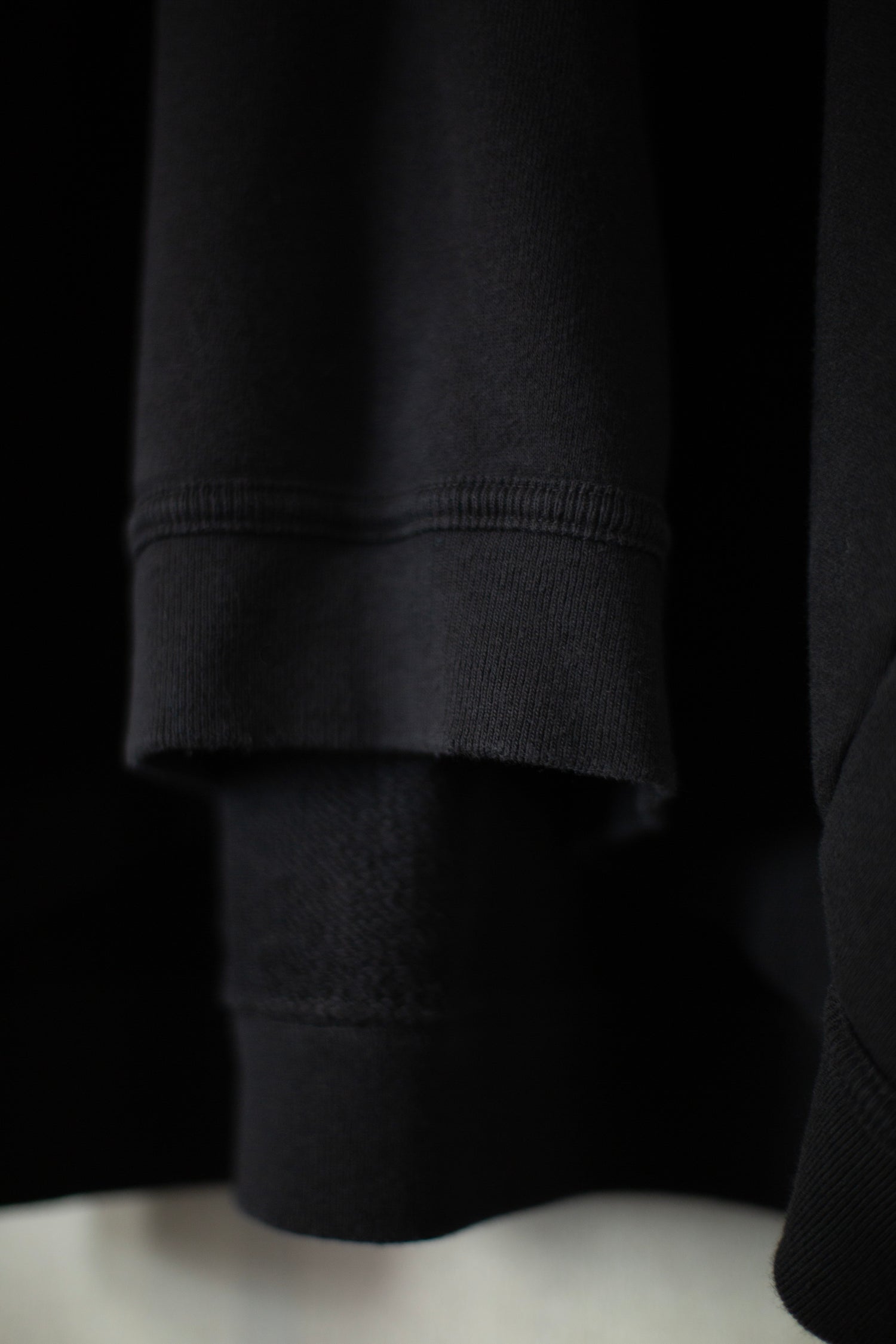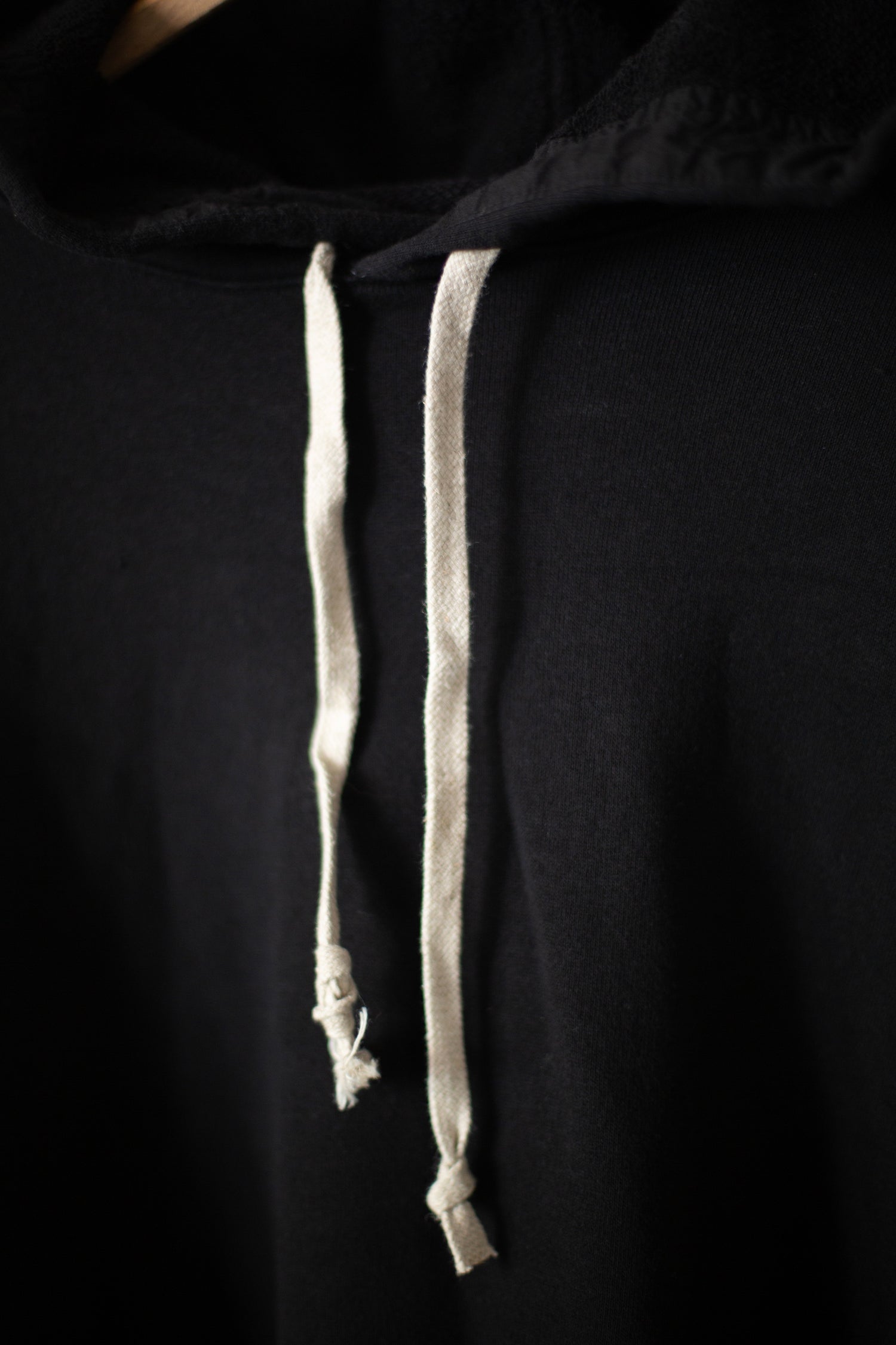 Loose fit hooded sweat in black loopwheel cotton sweat with two woven washed dense cloth button closure patch pockets on each sleeve, brand staple natural white ribbon, taped seams and back longer than front.