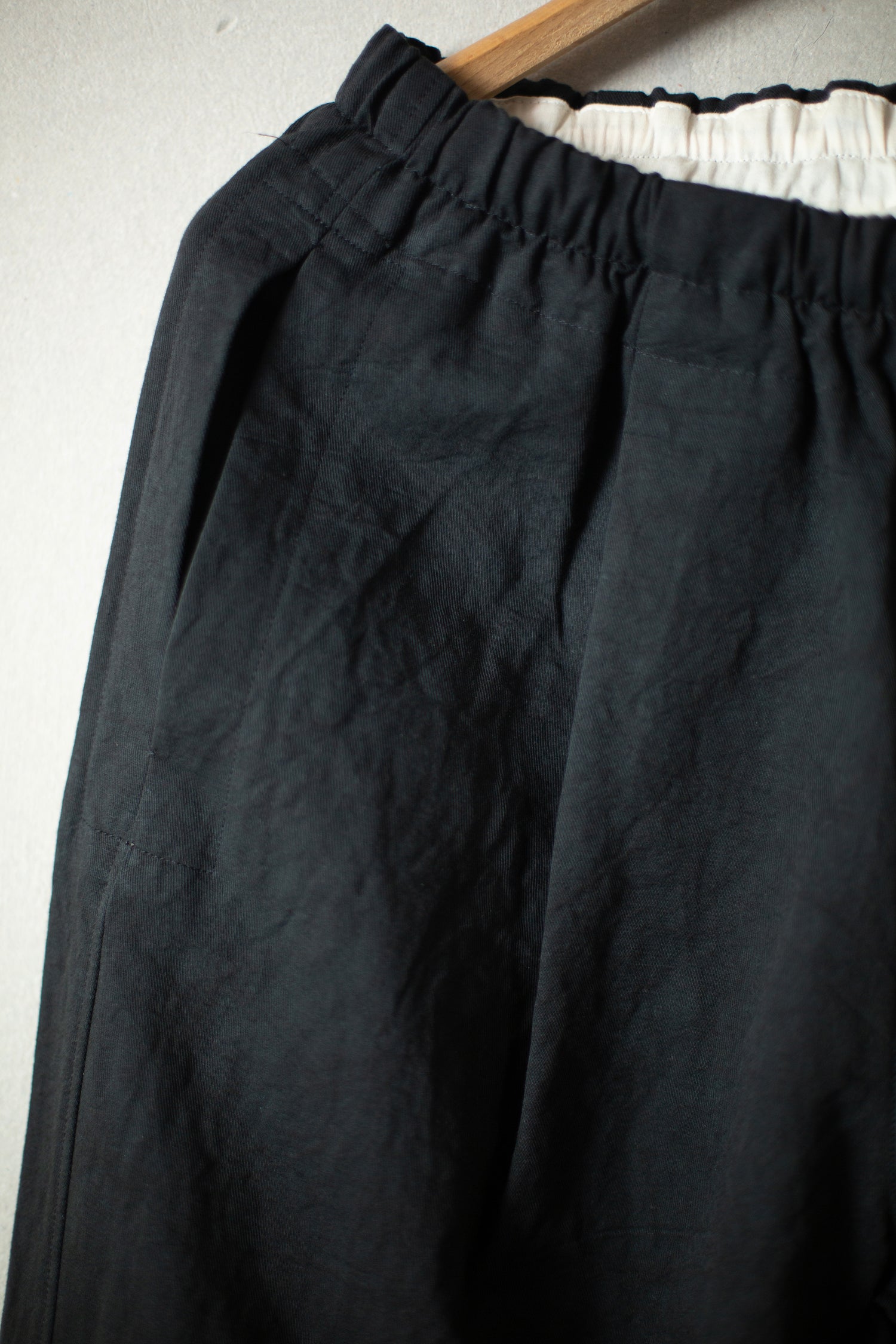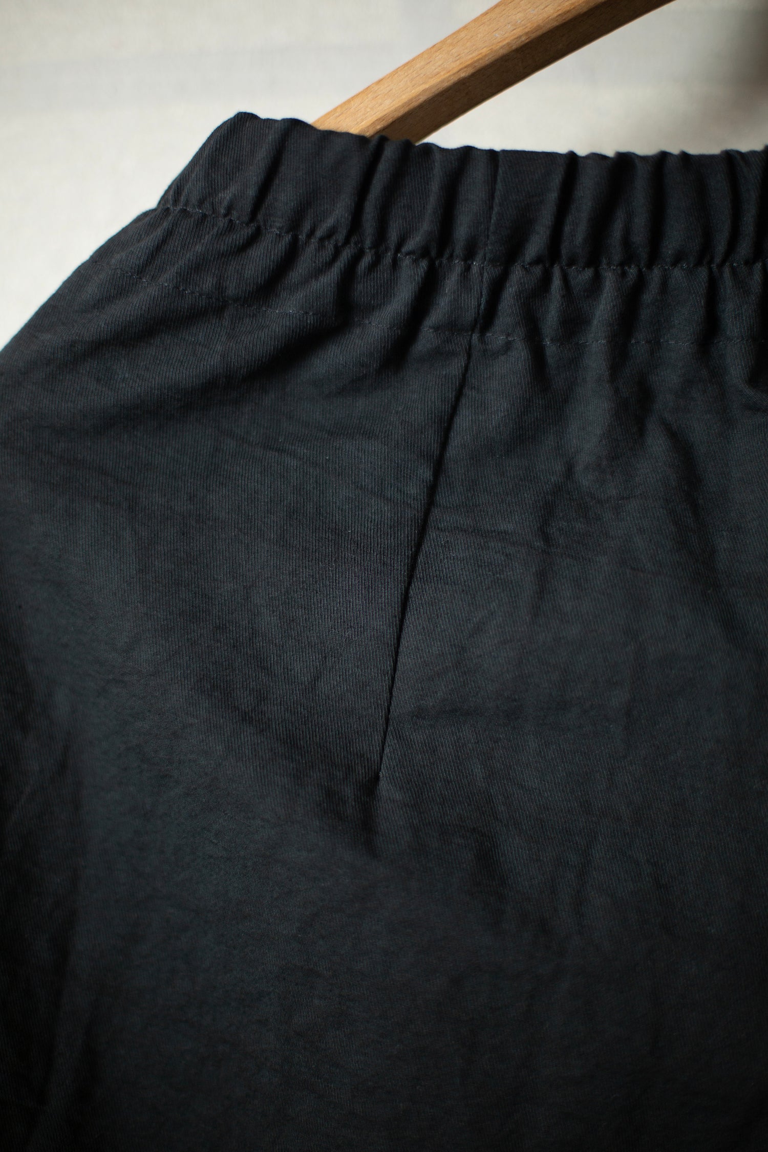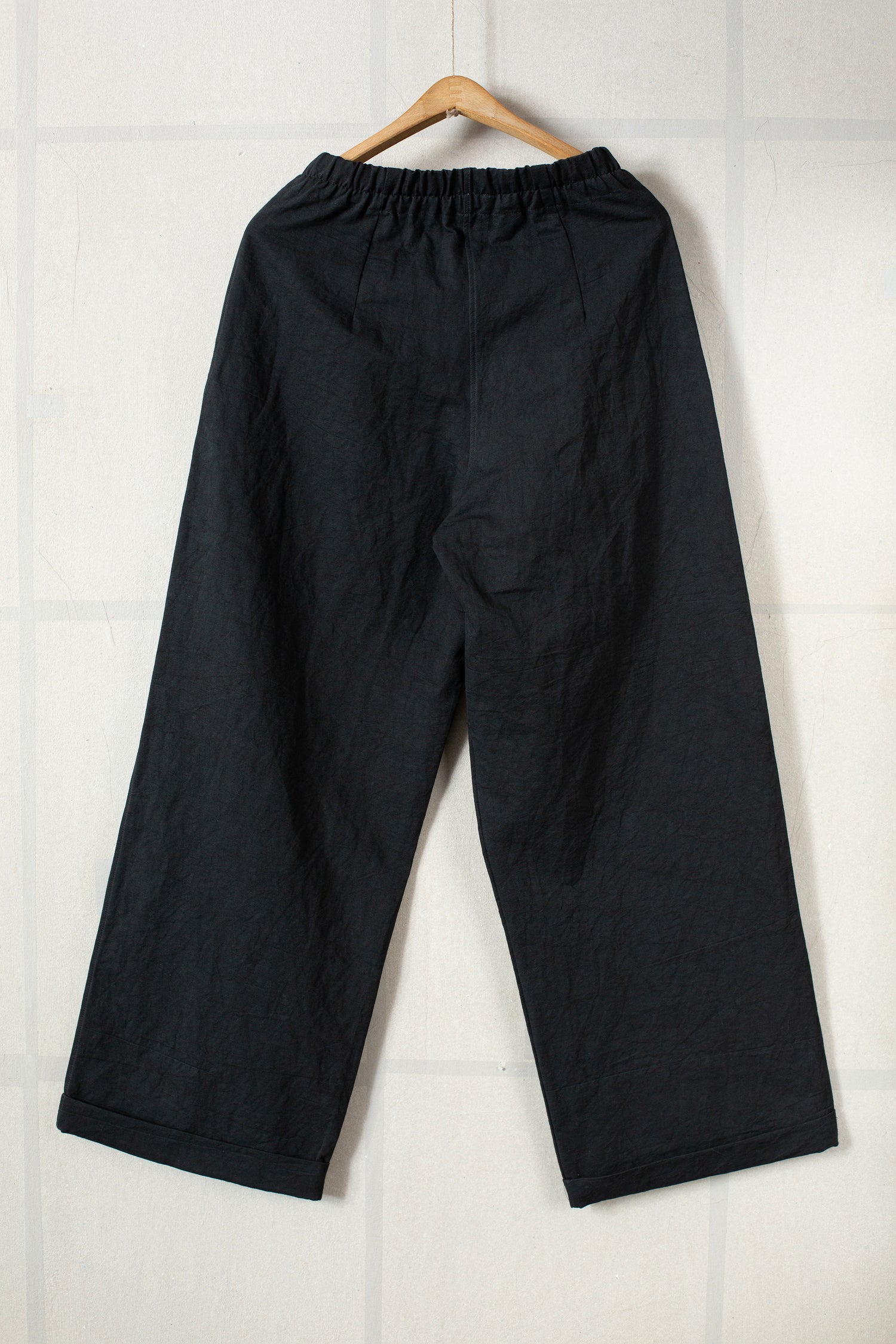 With single pleat, elasticated waistband, ribbon in waist, side pockets and fixed folded cuffs.