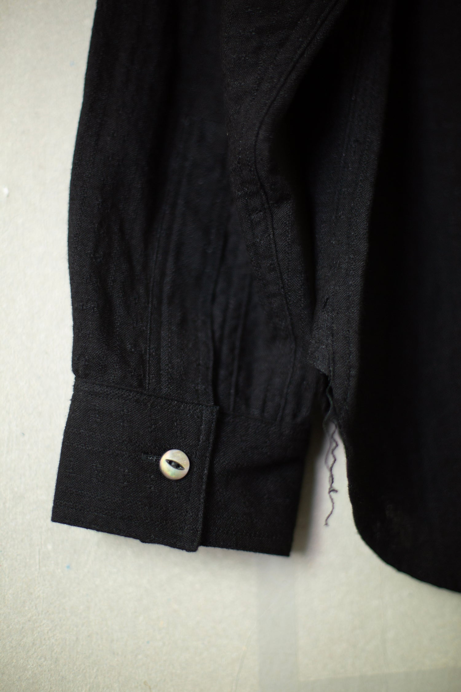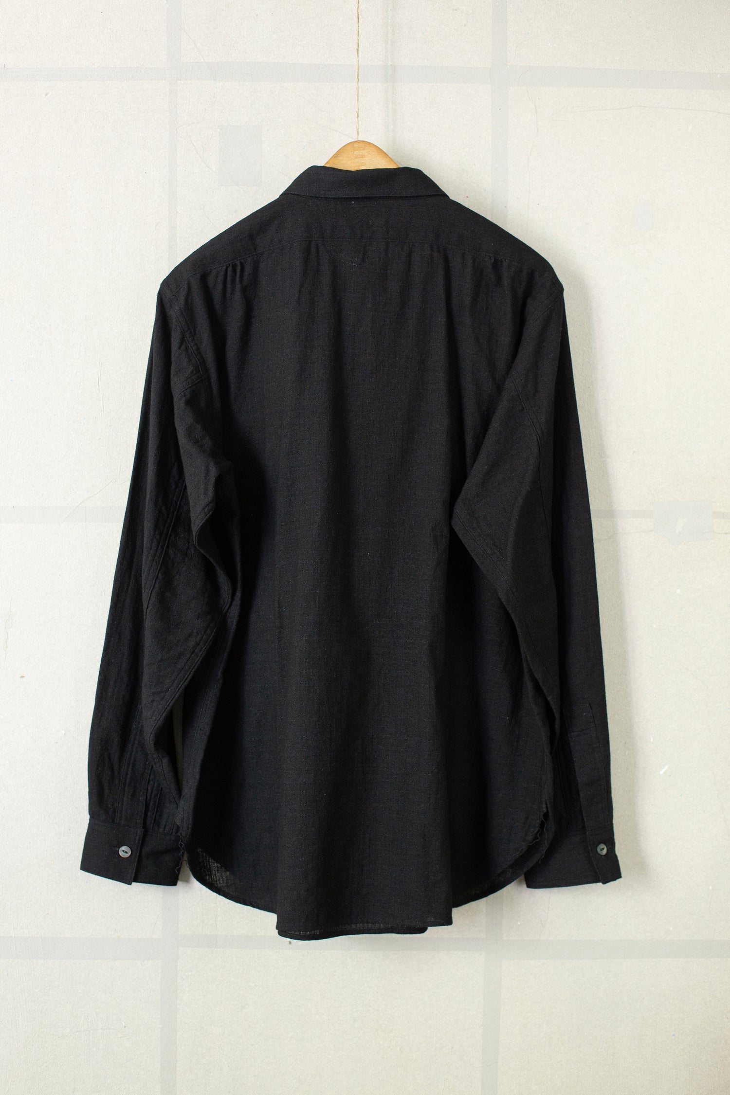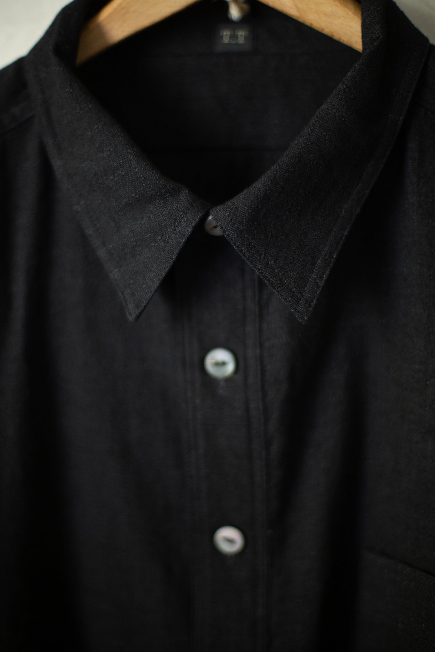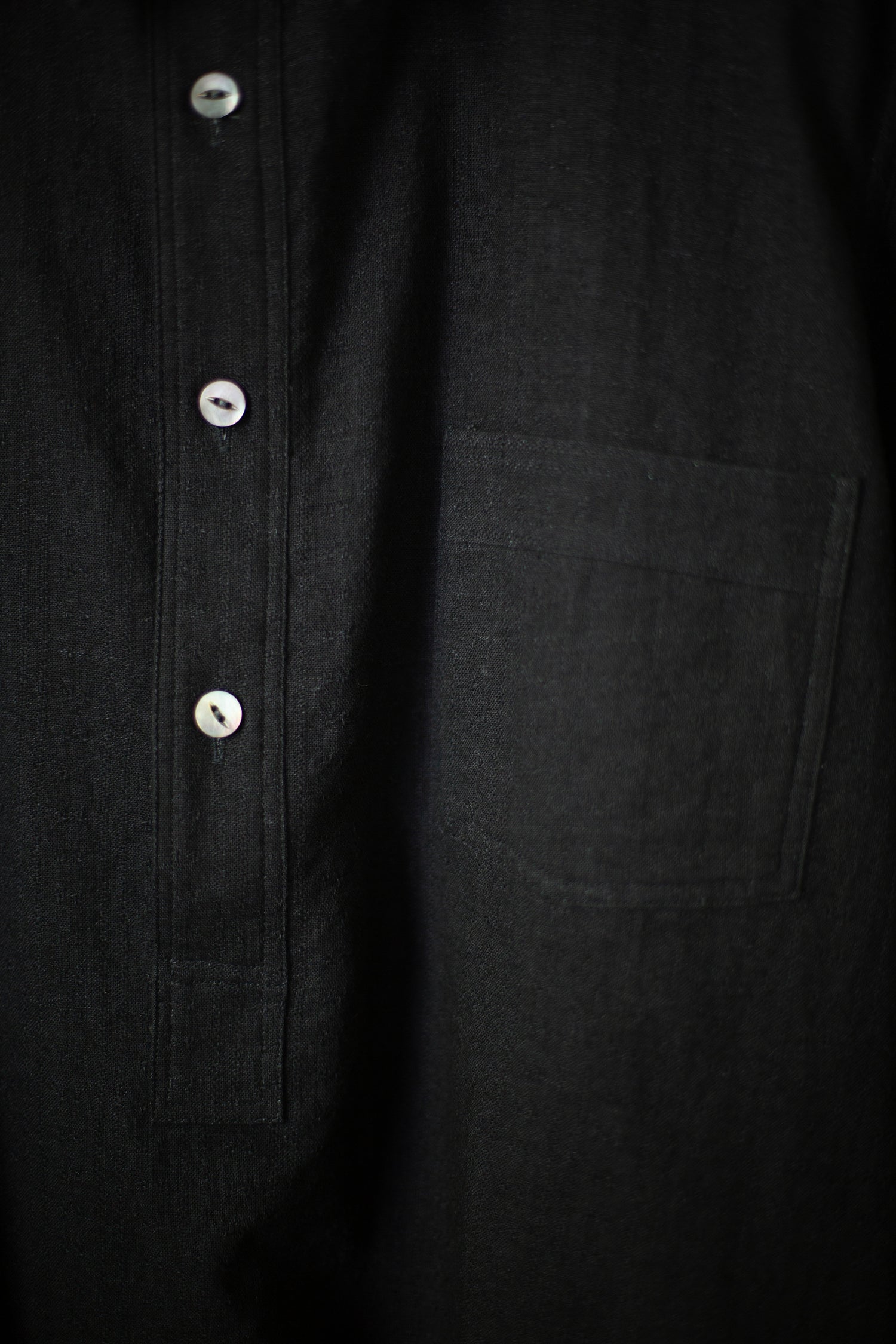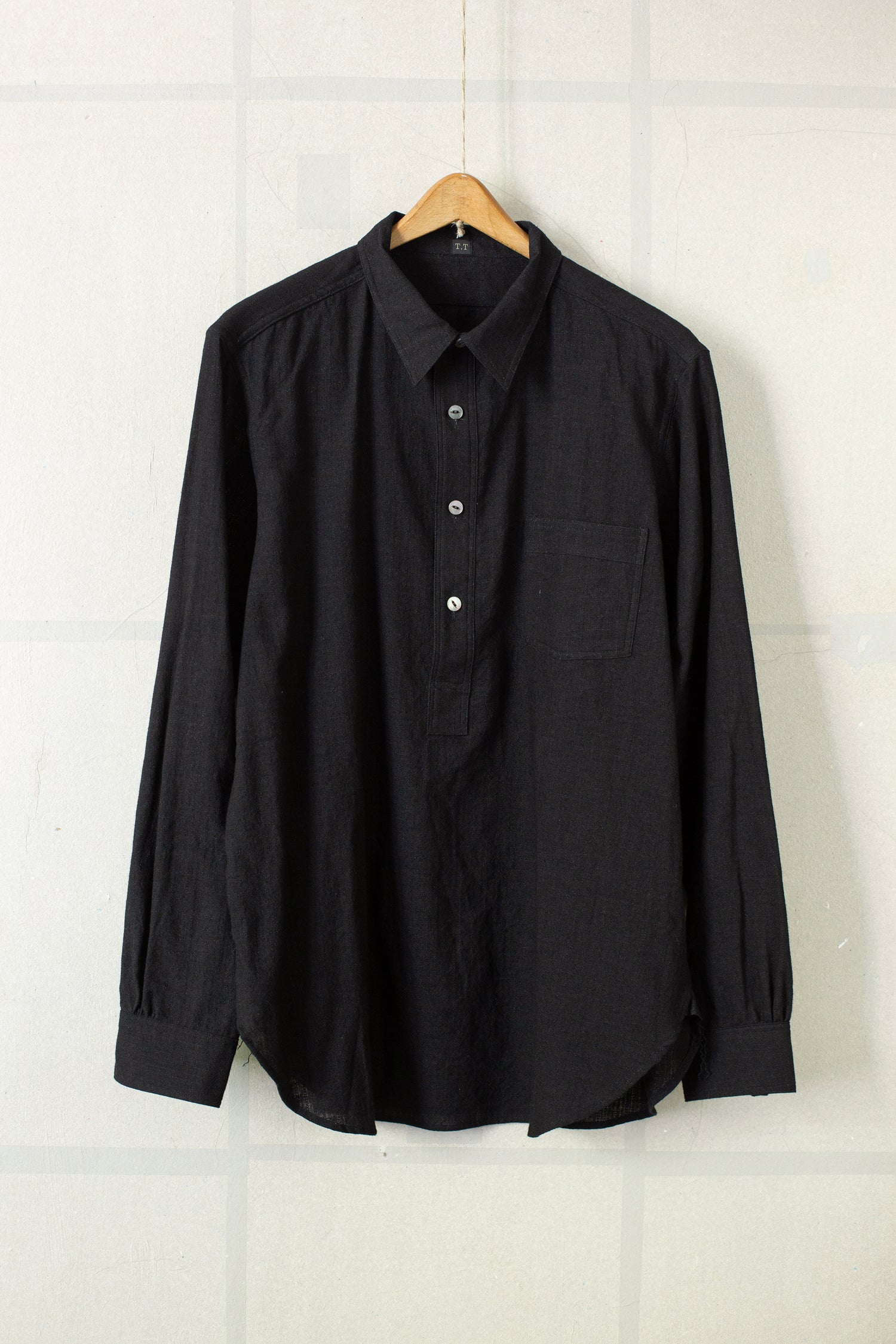 Black pullover work shirt by Taiga Takahashi with patch chest pocket, mother of pearl buttons and round hem.
