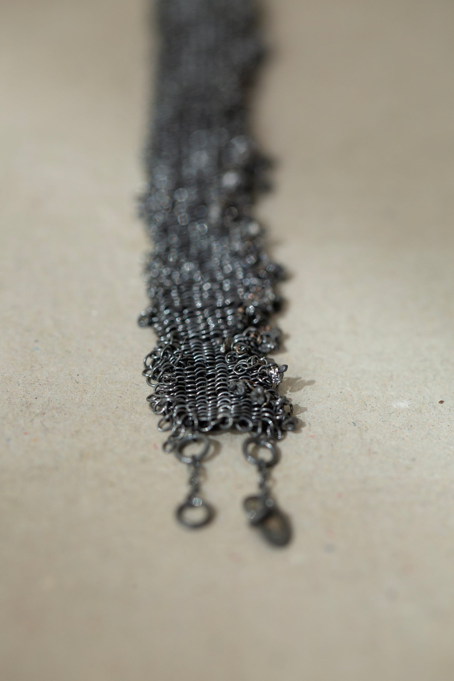 Beautiful hand woven bracelet in oxidized 925 sterling silver chains with anthracite silk yarn and series of raw black diamonds from '17' by Stephanie Schneider.