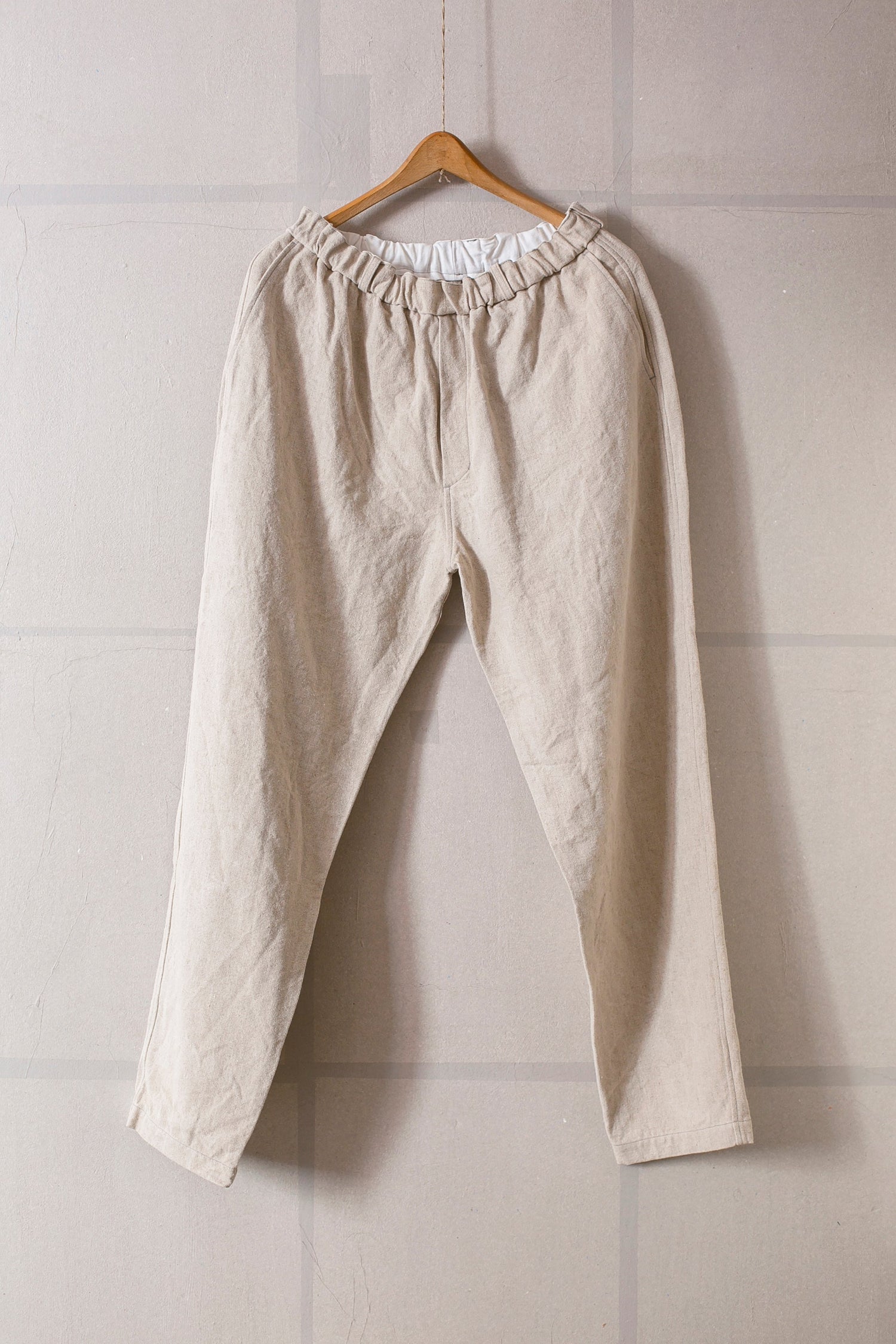 Long trousers by Mittan in natural color brushed linen/ramie with elastic waist band, inner drawstring and side pockets.
