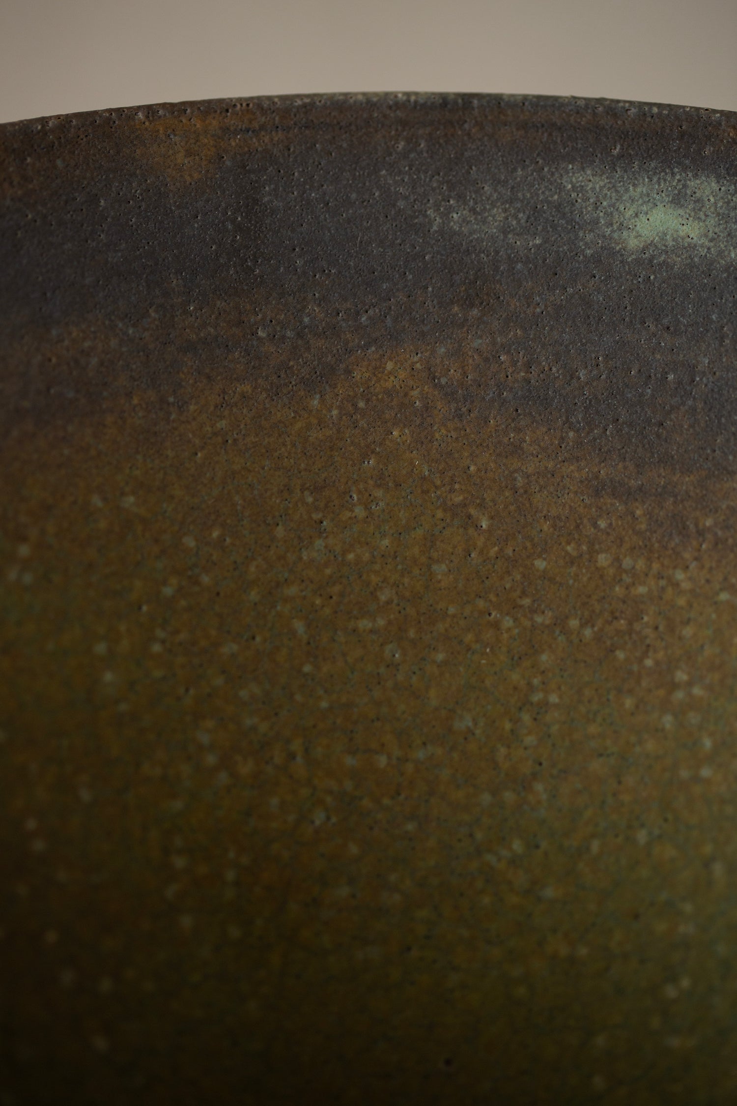 An elegant large ceramic bowl by Ciprian Tocu hand turned in sandstone with structures resembling hammering work and usage of various glazing techniques.
