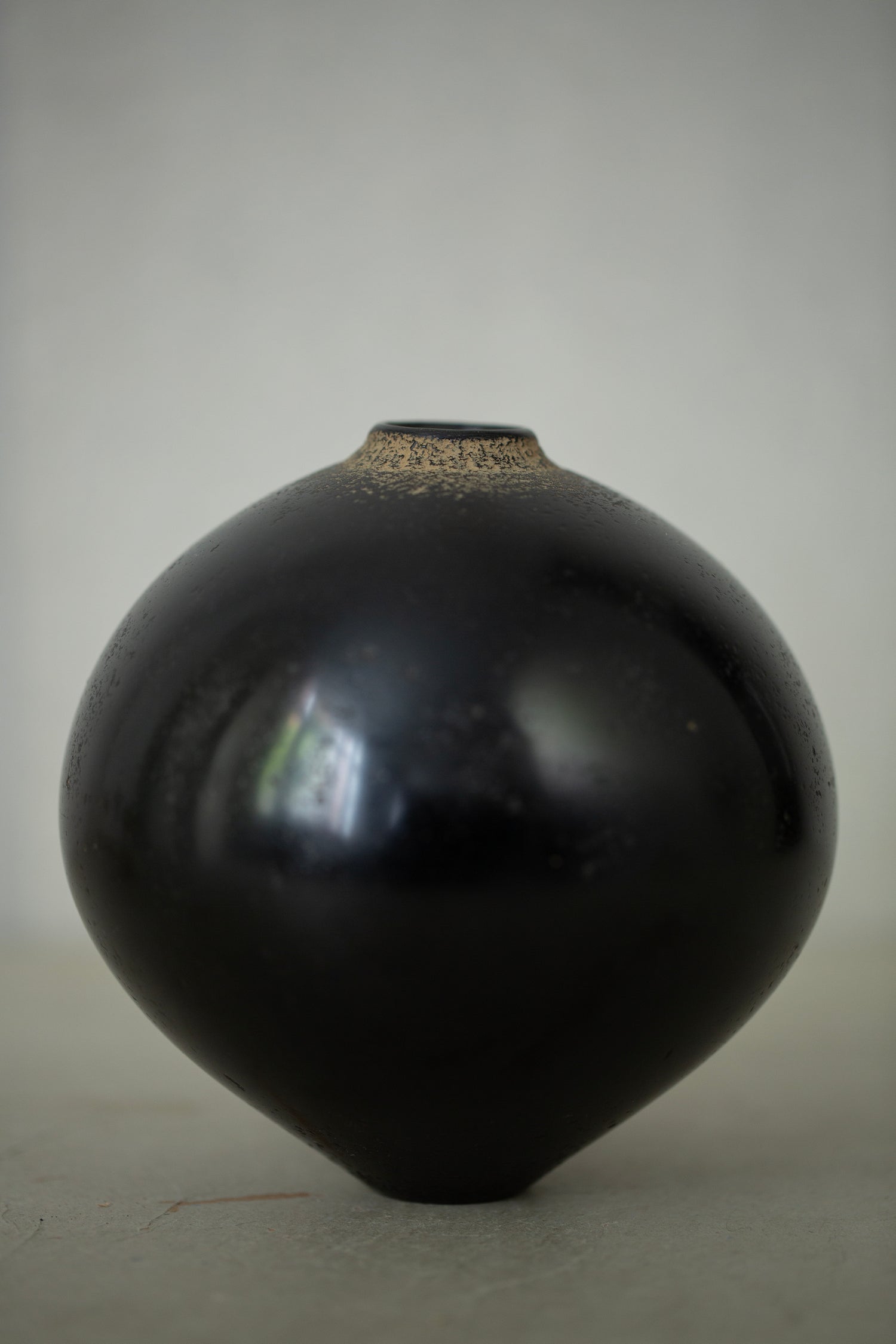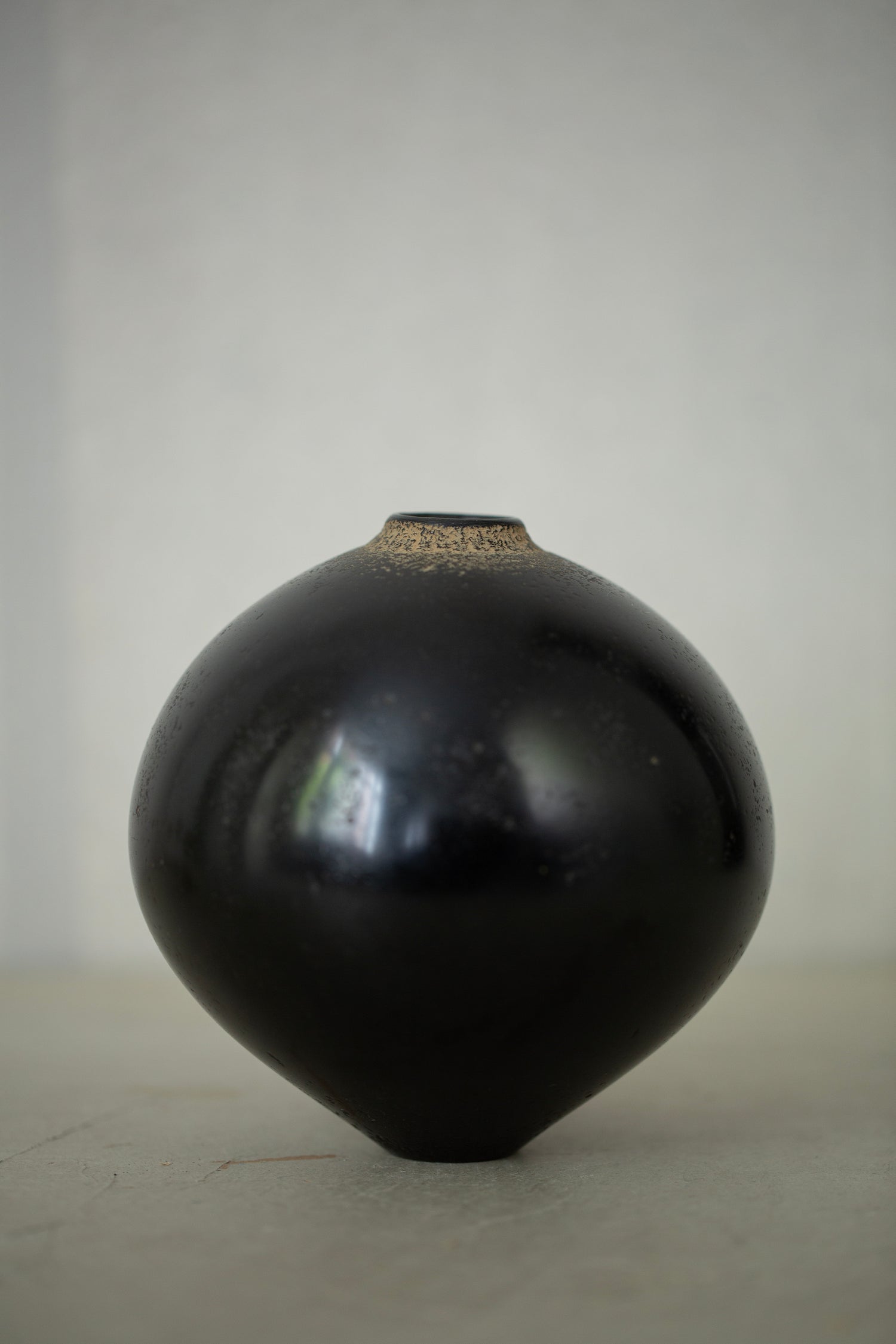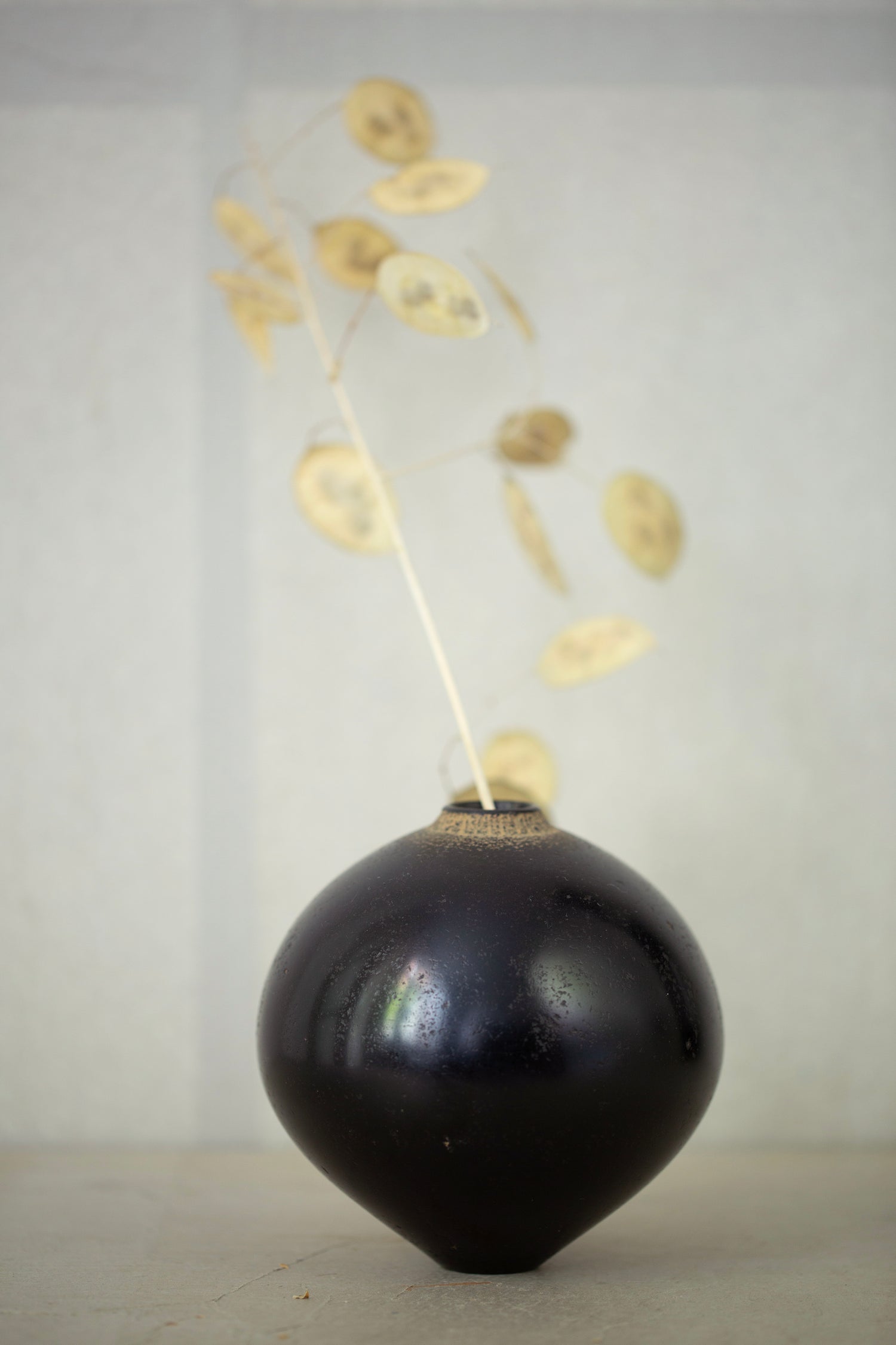 A elegant vase by Kenta Anzai in porcelain, covered with a black glaze of urushi lacquer - a more than 5000 year old Jomon technique, using a natural Japanese lacquer from tree sap. Simple shapes of his ceramics contrast their refined aged surfaces, obtained through a intense lengthy process of sandpapering and polishing.