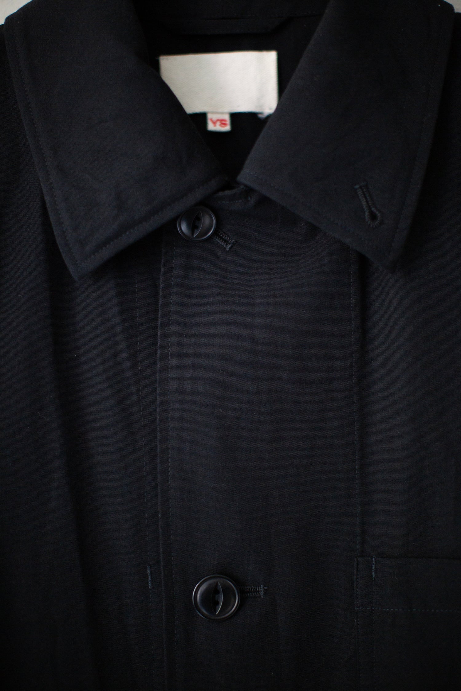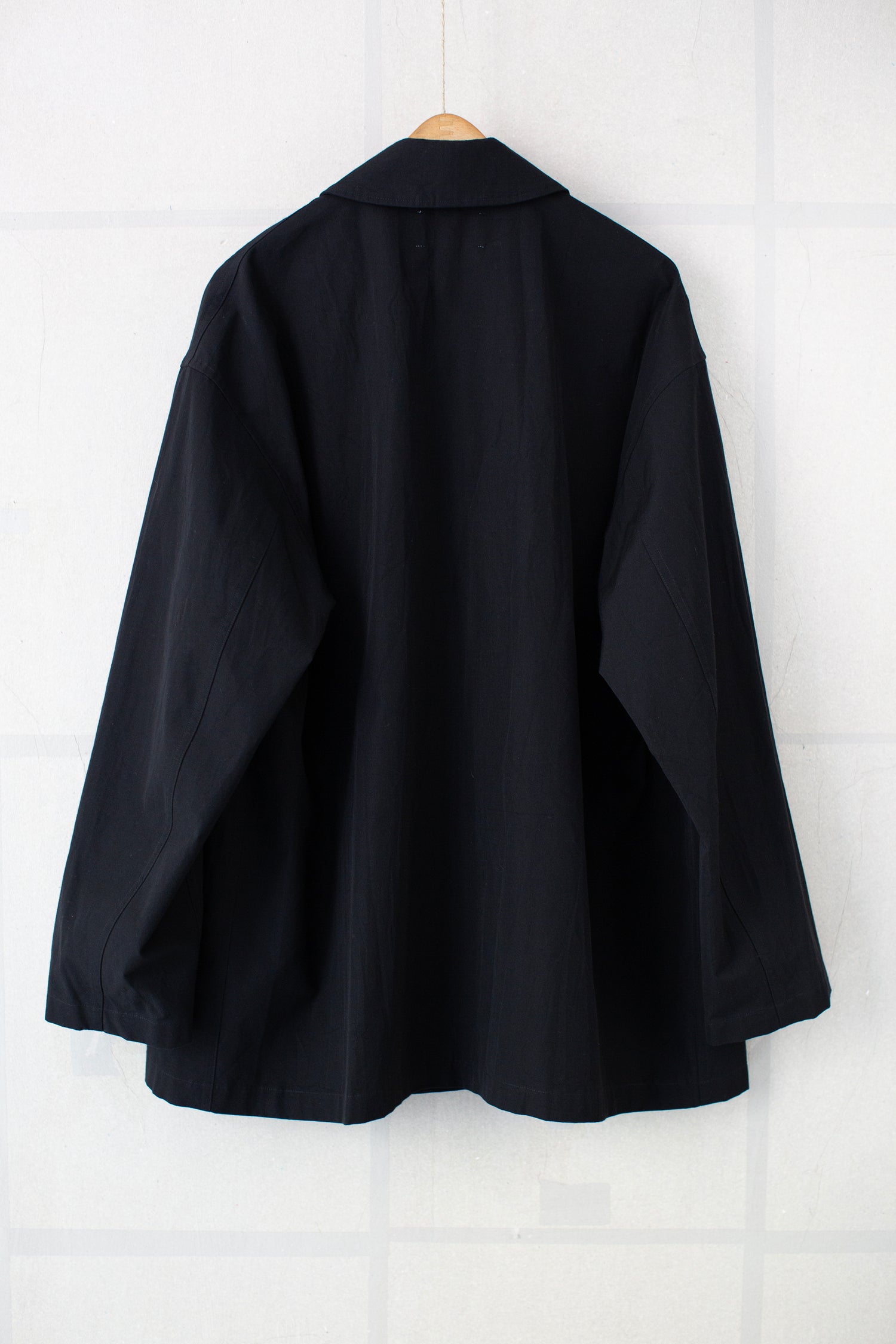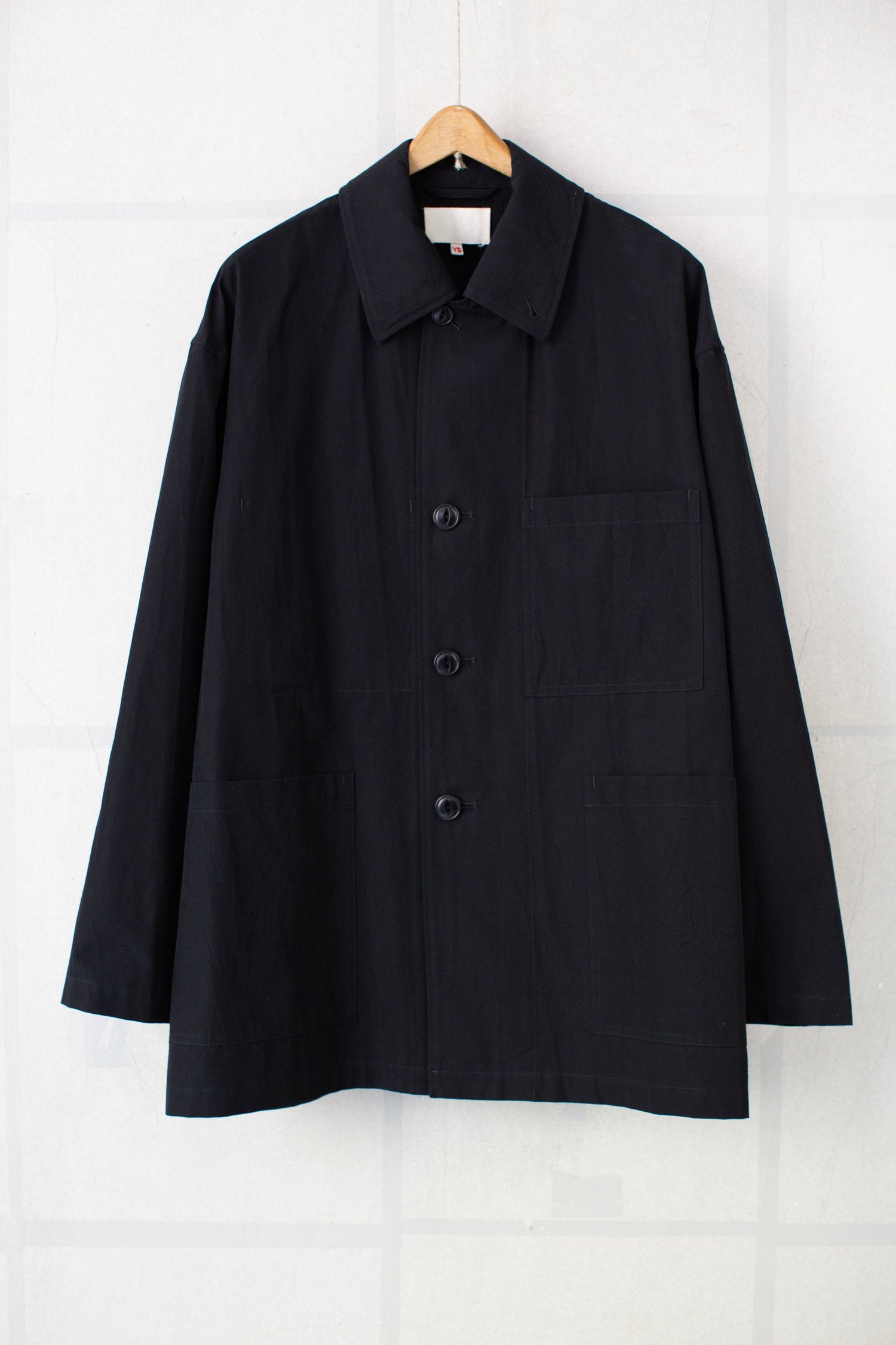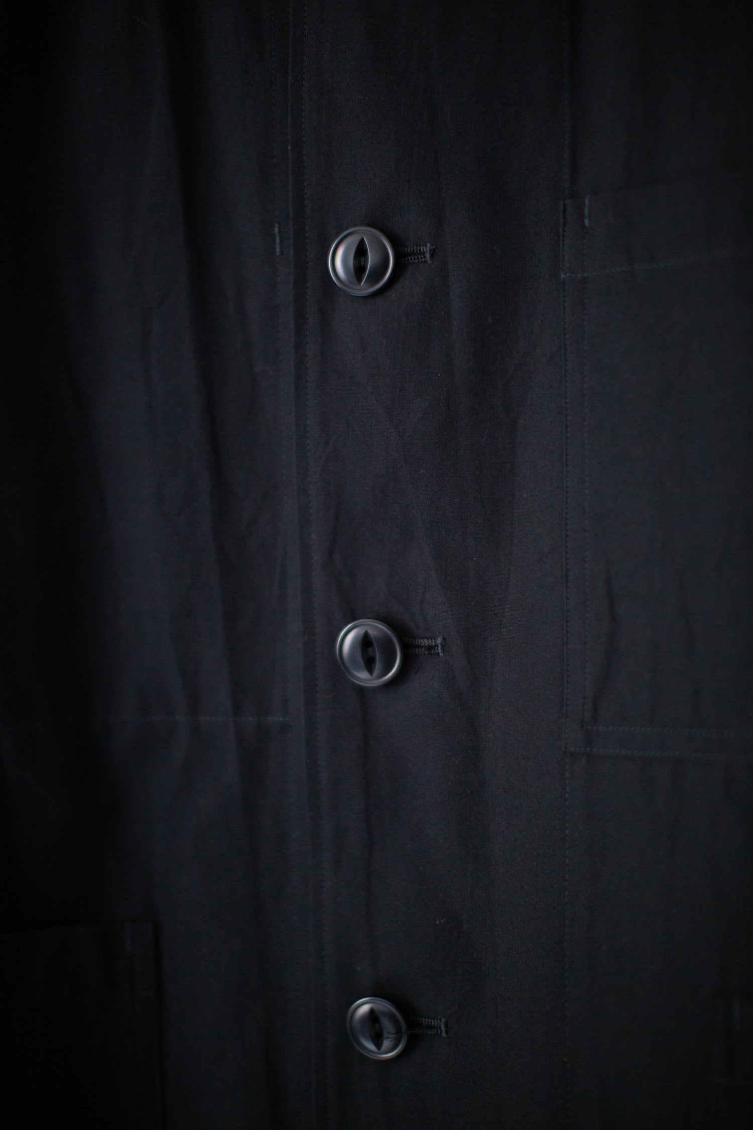Chore jacket by Yoko Sakamoto in black max high count cotton canvas with classic workwear inspired design, stand-up collar, three generously sized patched front pockets and inside chest pocket.