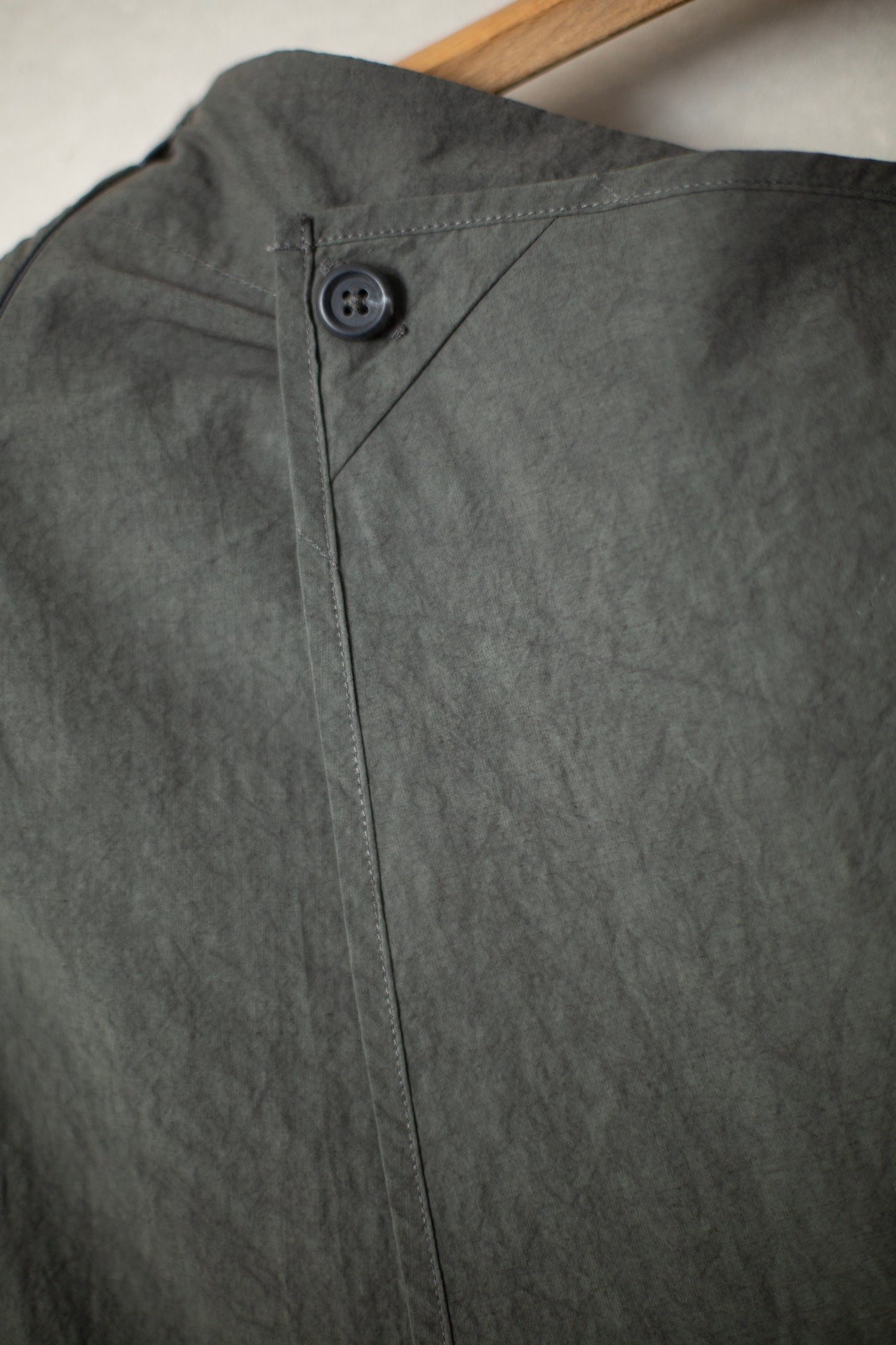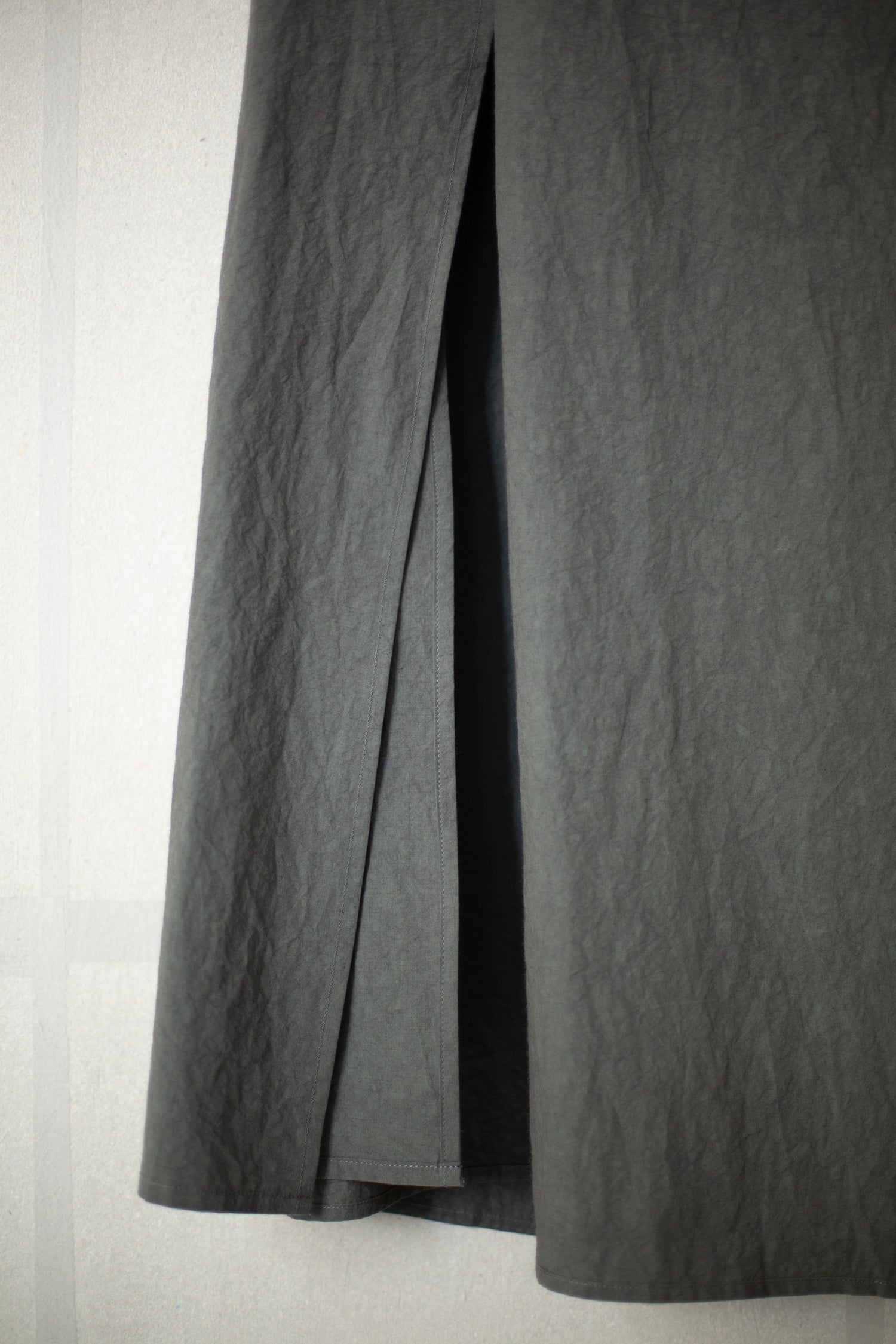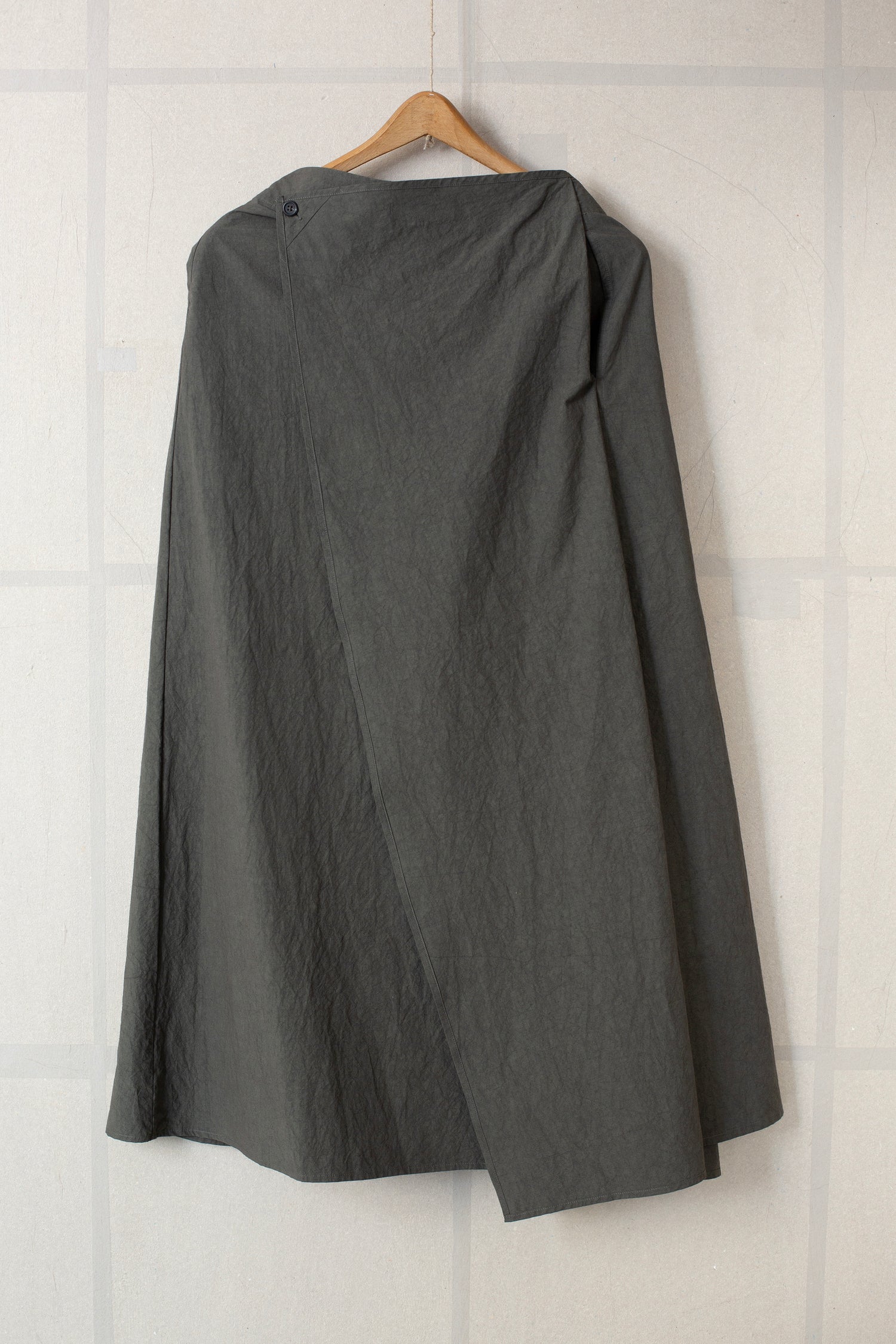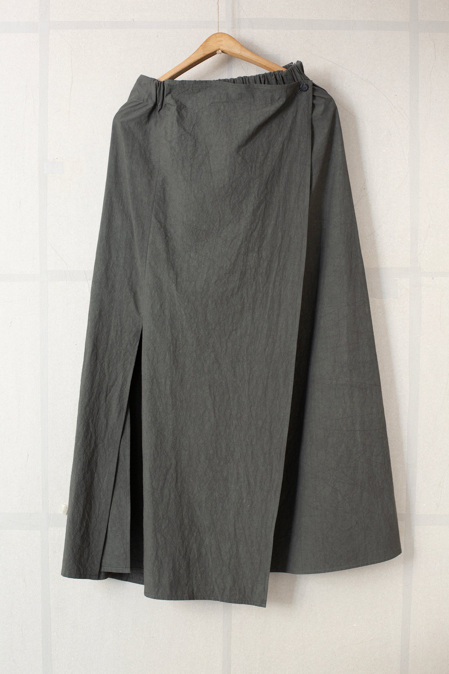 With adjustable drapes with buttonhole, splits on one side; elasticated waist in back and zipper on the side.