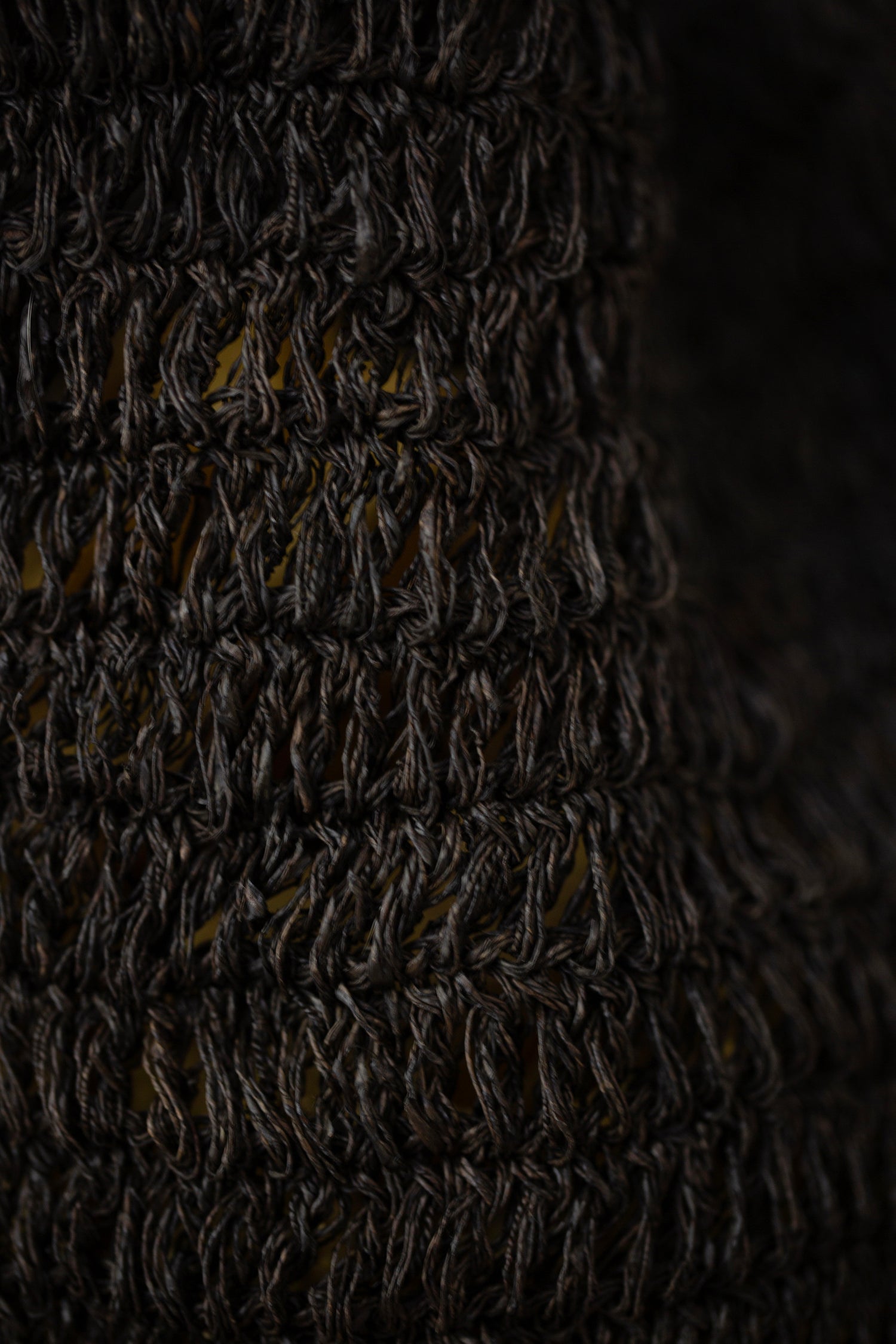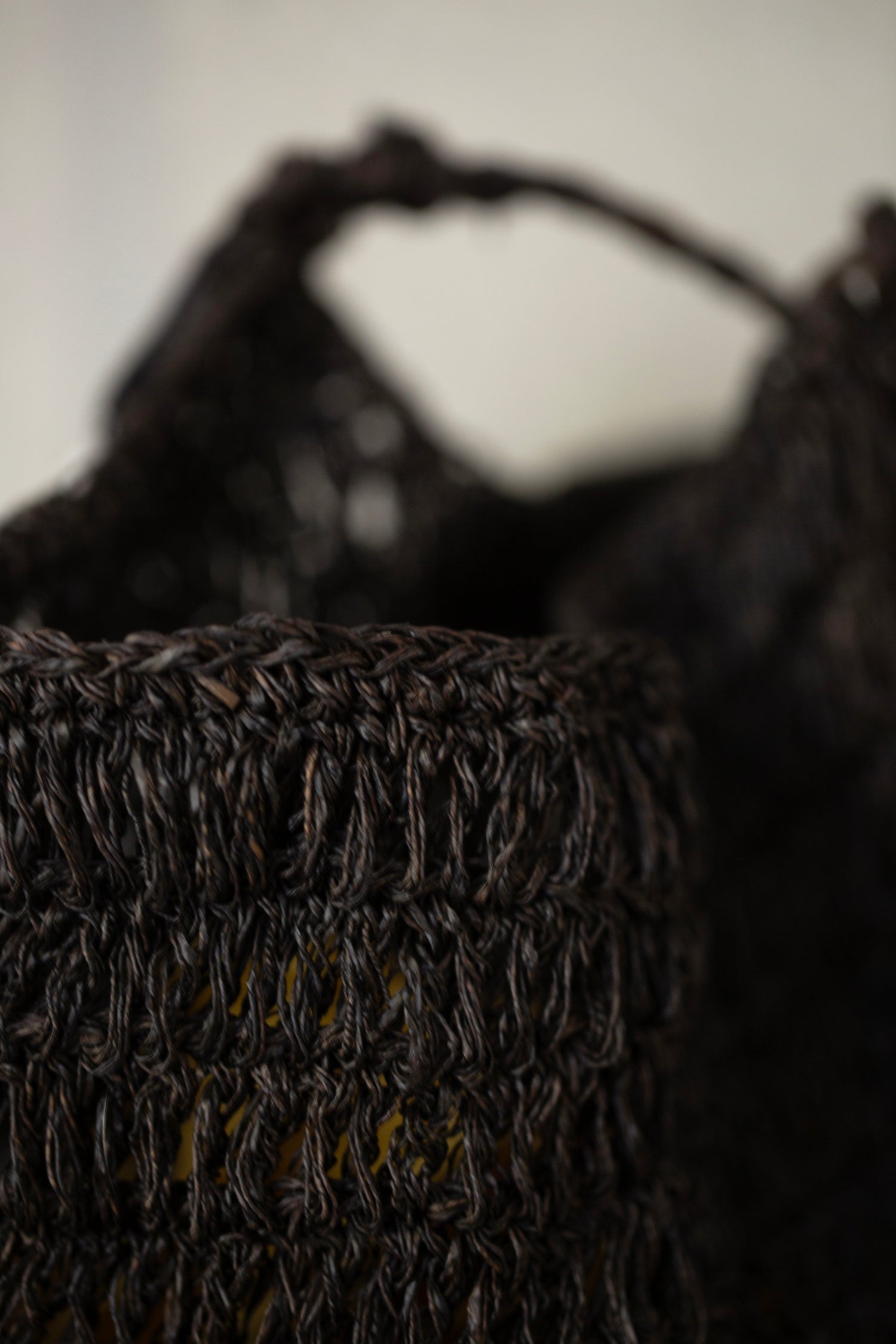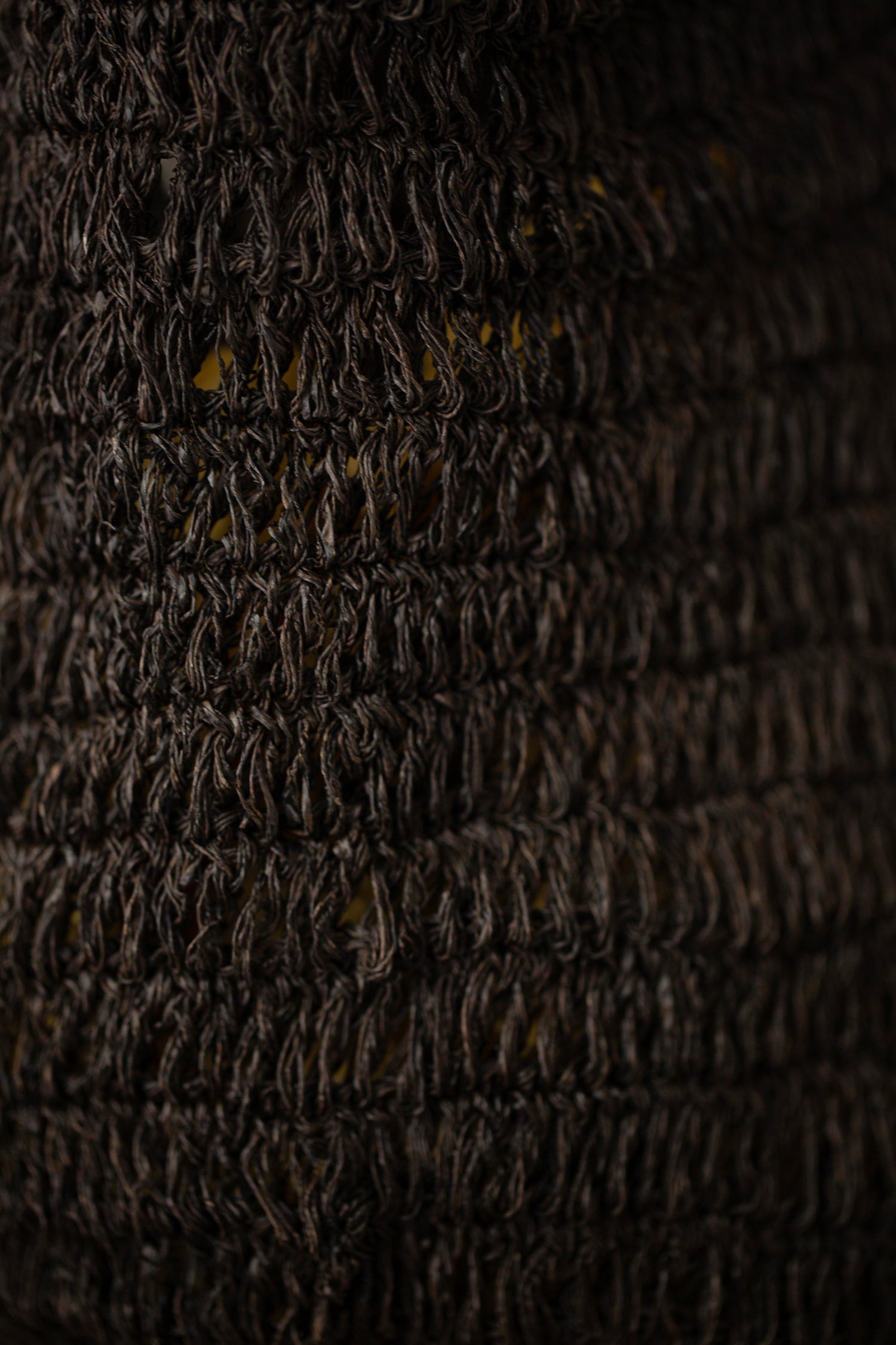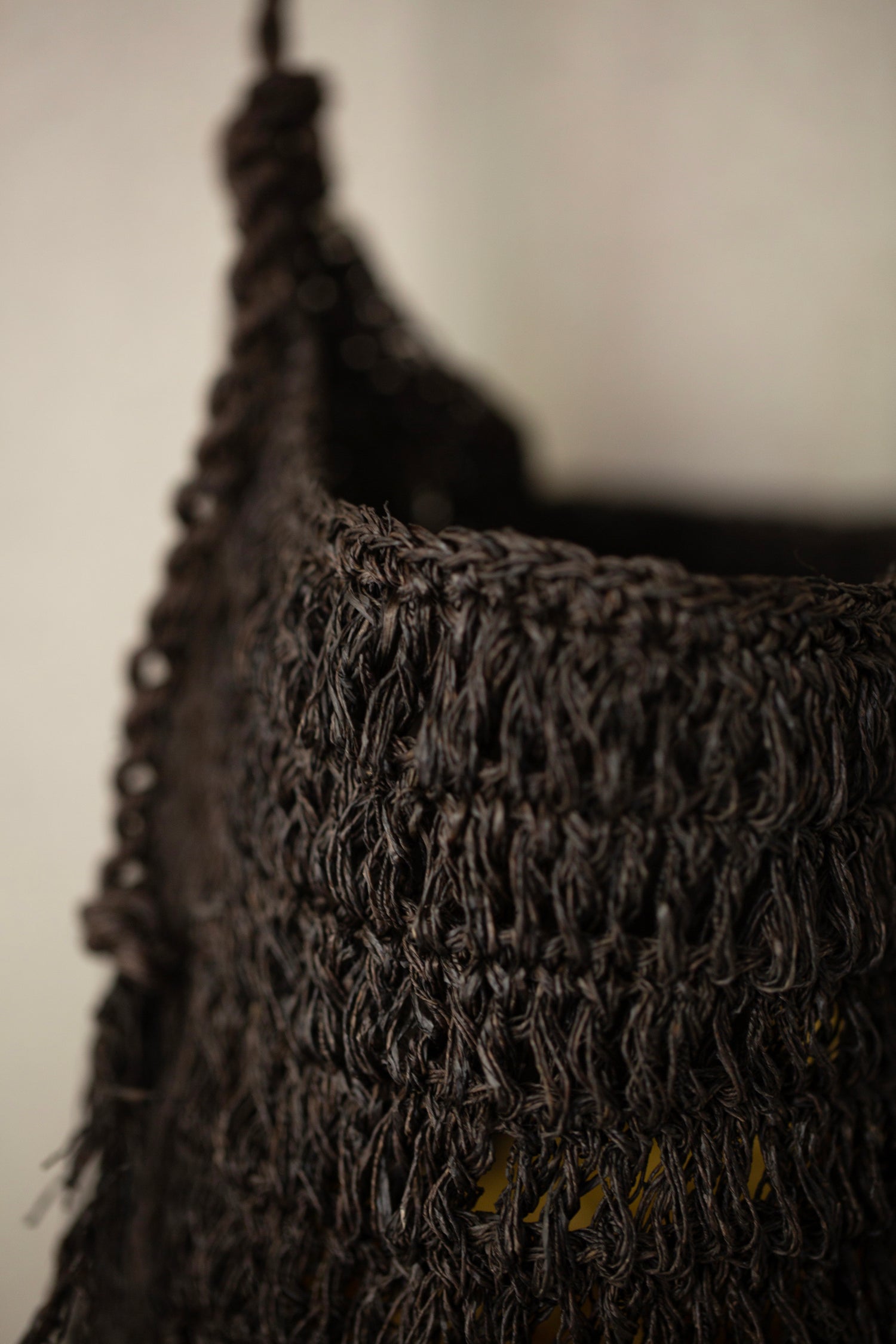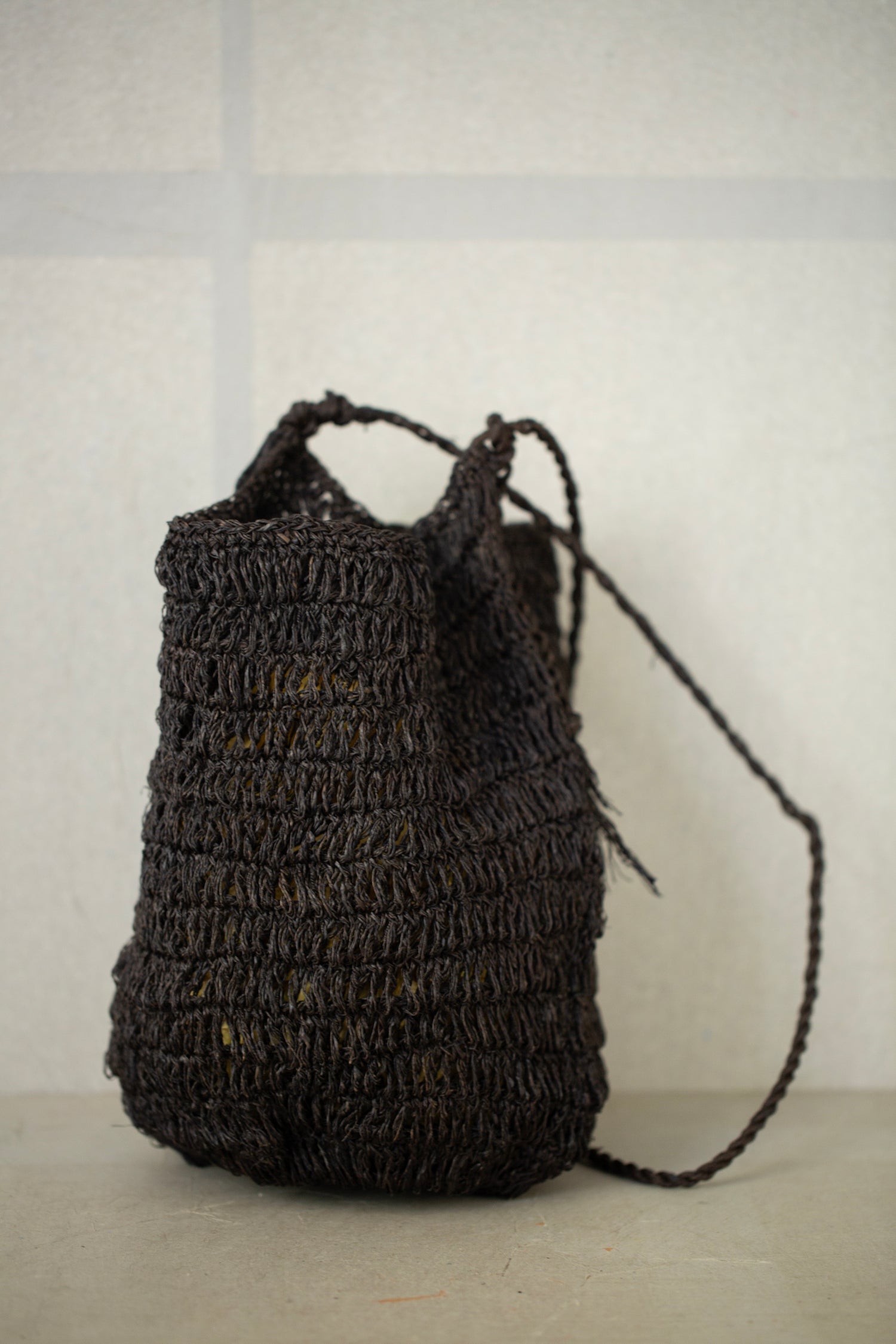 This bag is hand knitted with raw hemp grown by the Hmong tribe in Northern Thailand. It is dyed in Japan and Singapore with kaki shibu, using persimmons grown in the mountains of Kyoto. It is dyed and aged under the sun for a period of time. It might feel a little stiff initially but it will soften after time and use. Please hand wash it gently in warm water, using mild detergent. Be aware of acidic substances such as vinegar or citrus fruits as they may cause discoloration.