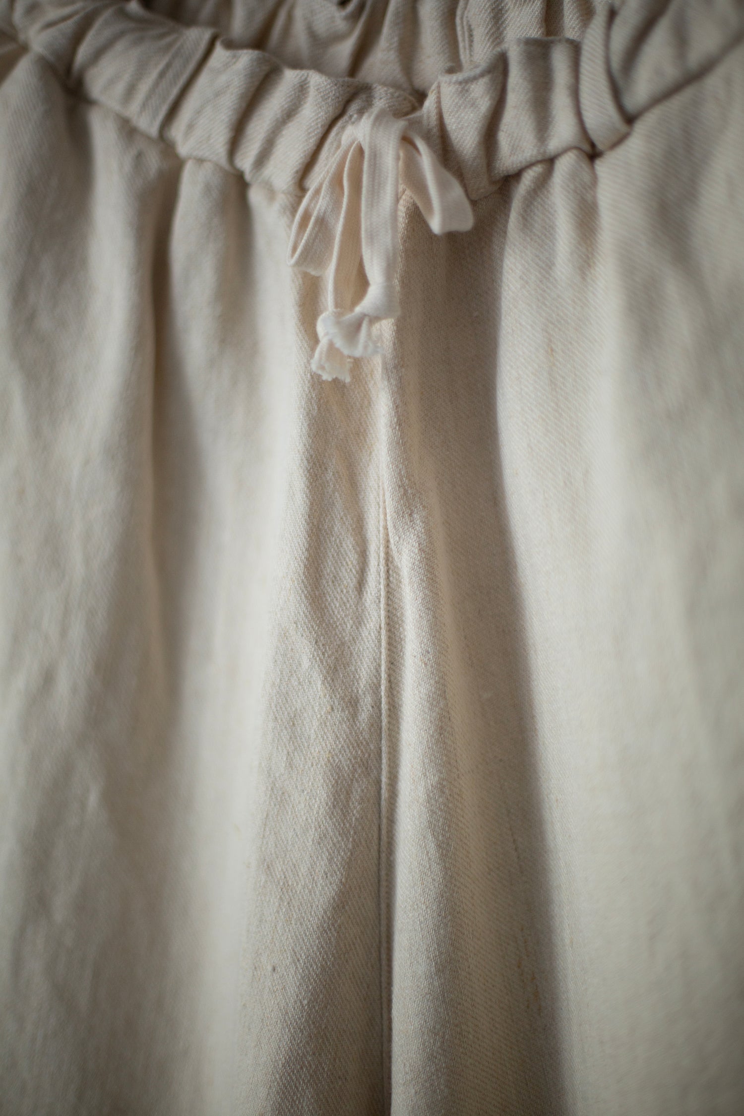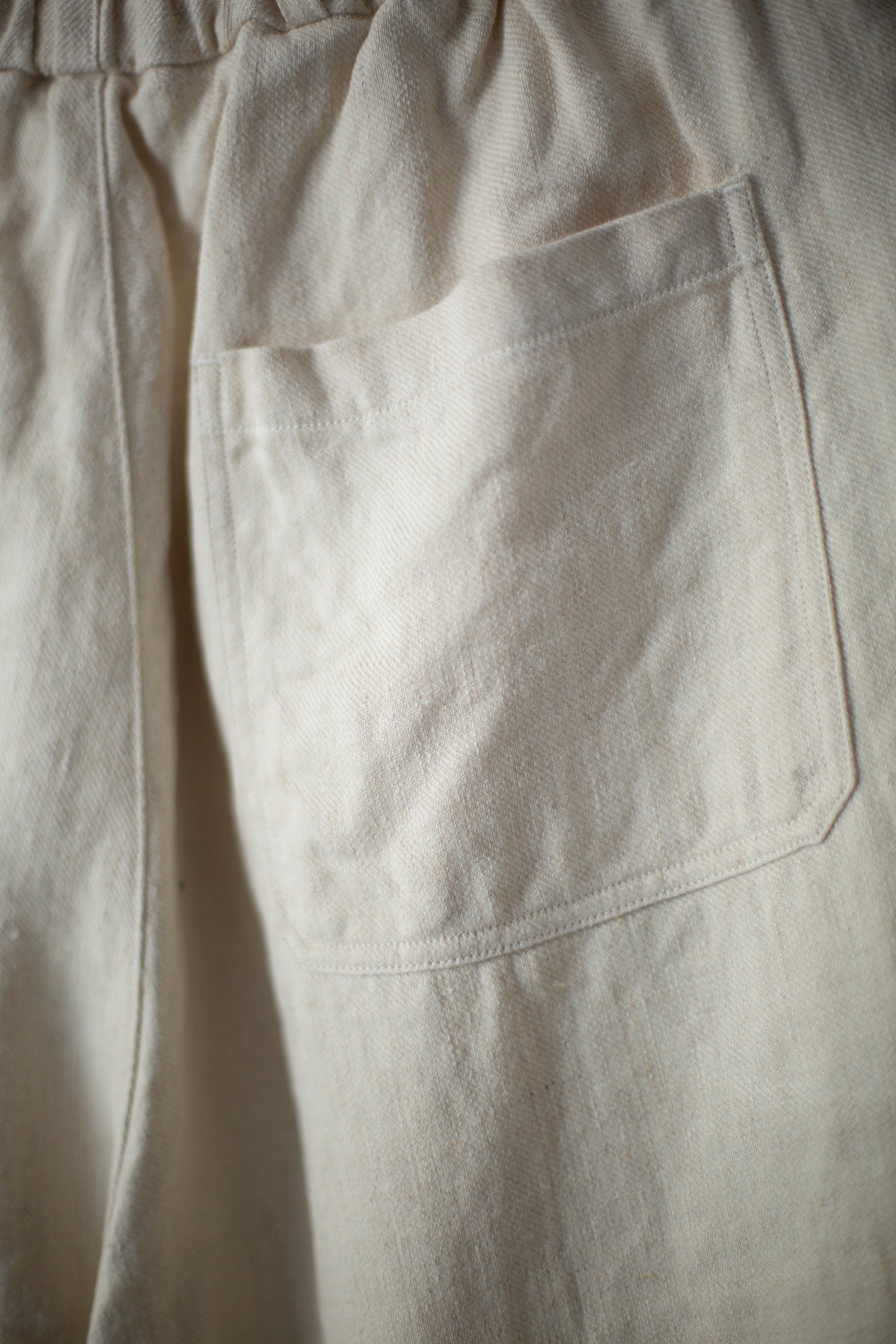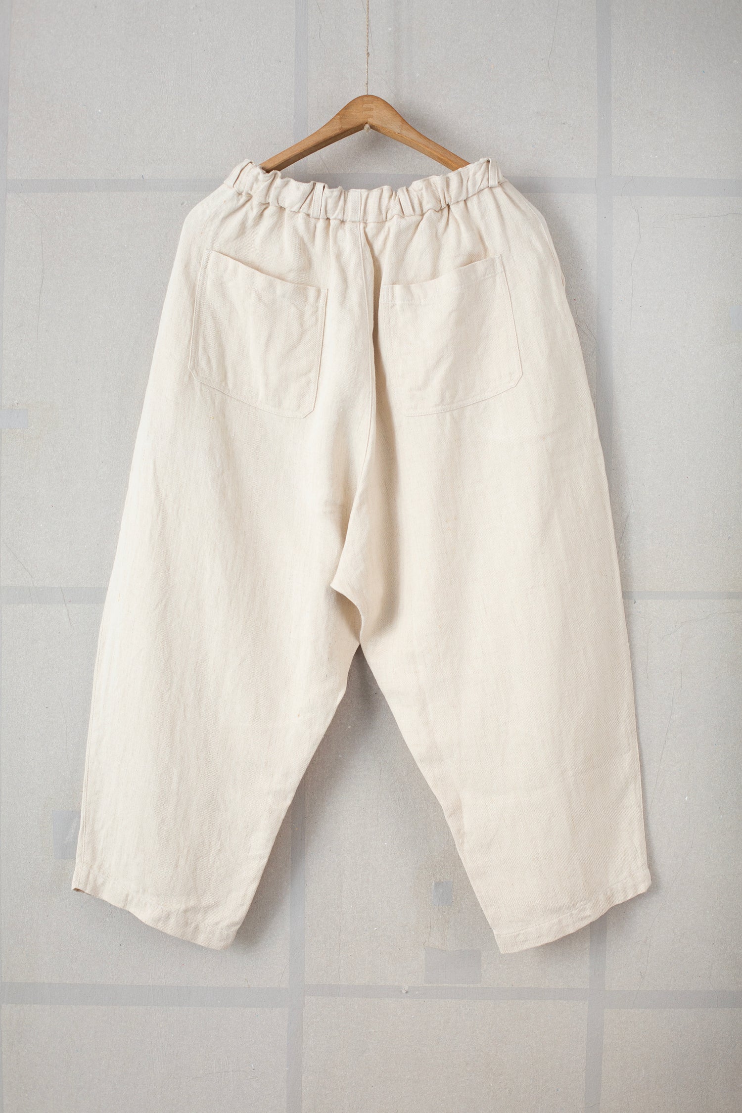 Comfortable tapered pants in natural white twill-woven hemp by MITTAN with a deep rise, side pockets, back pockets, elasticated waist band, belt loops and waist cord.