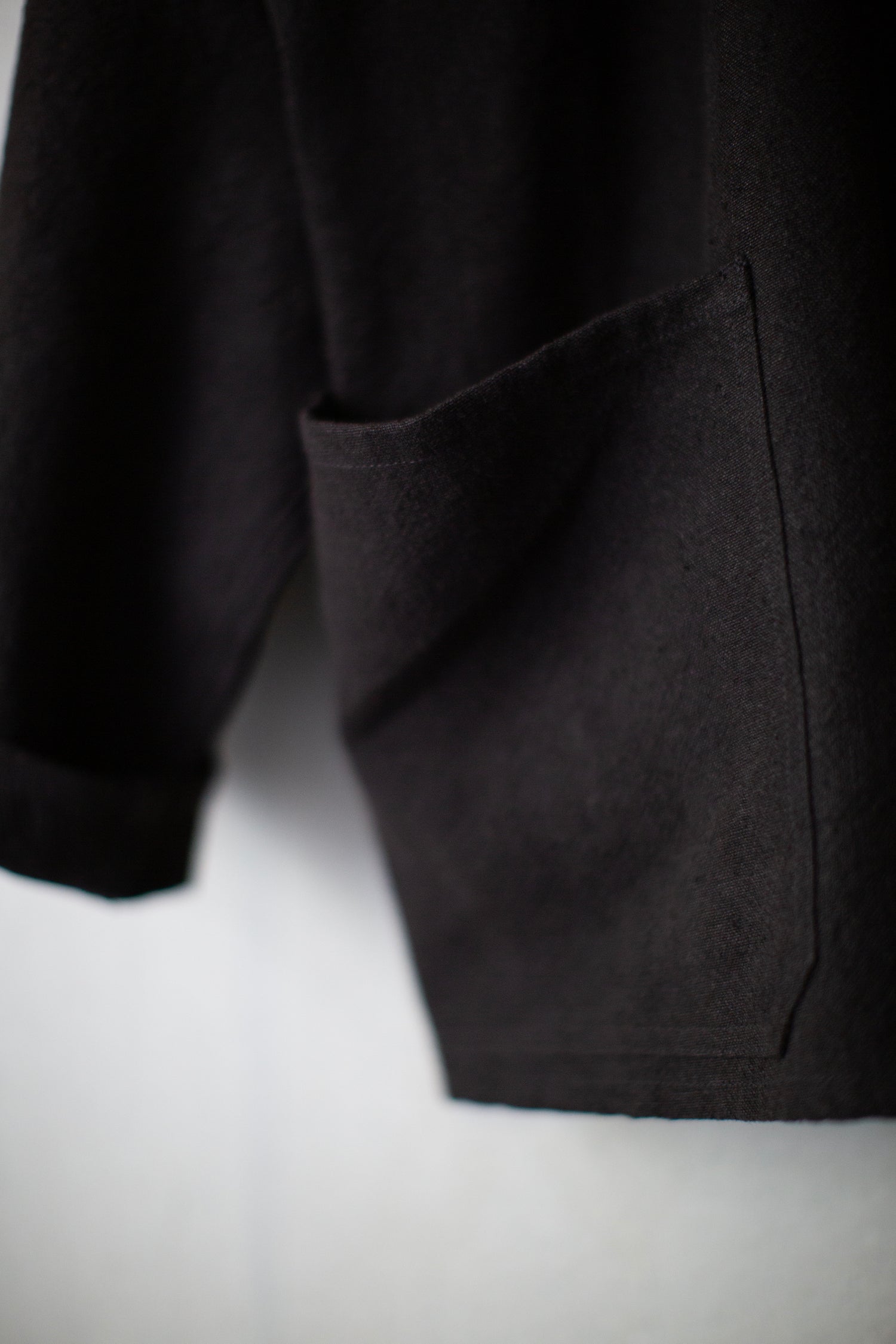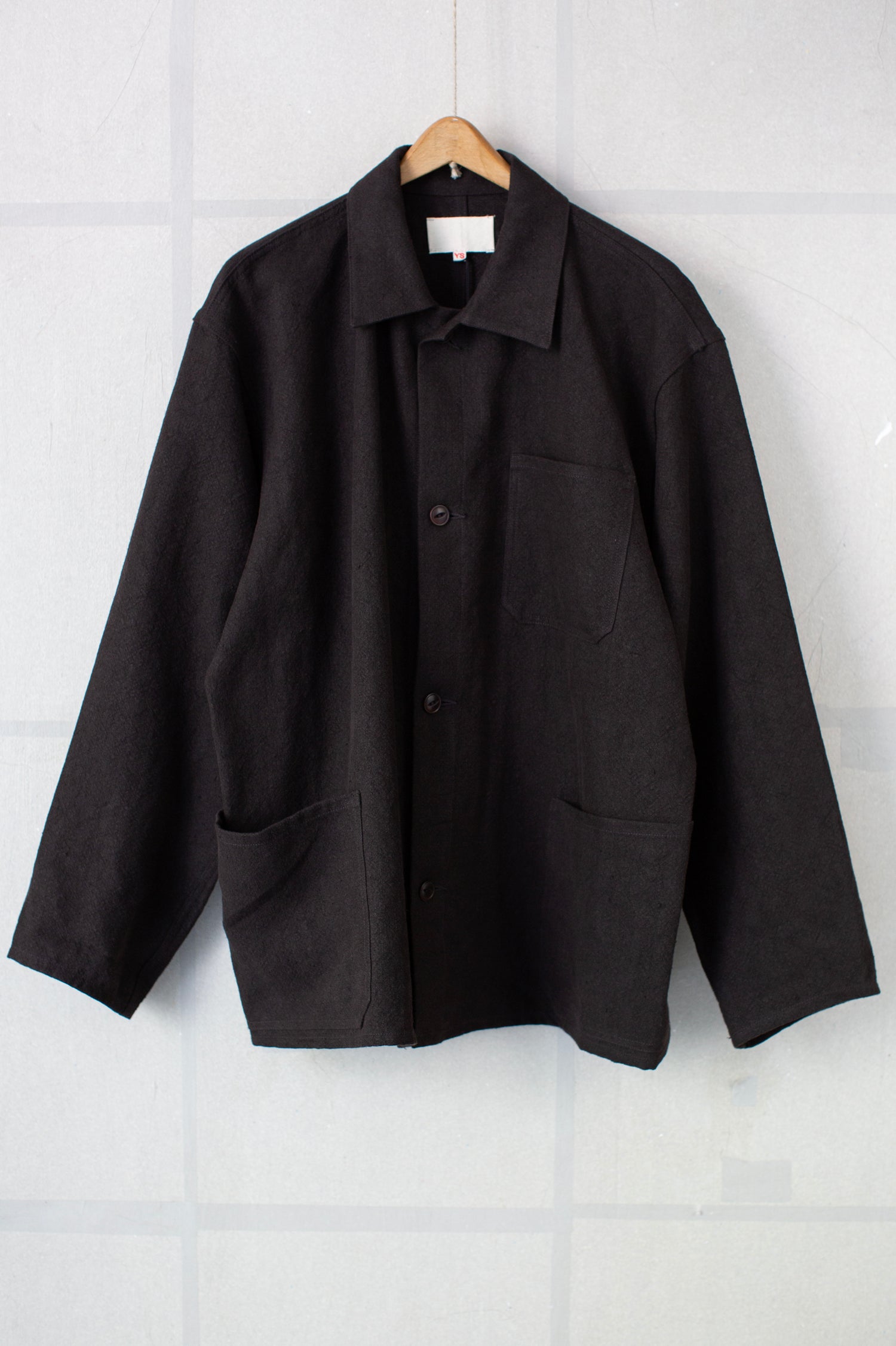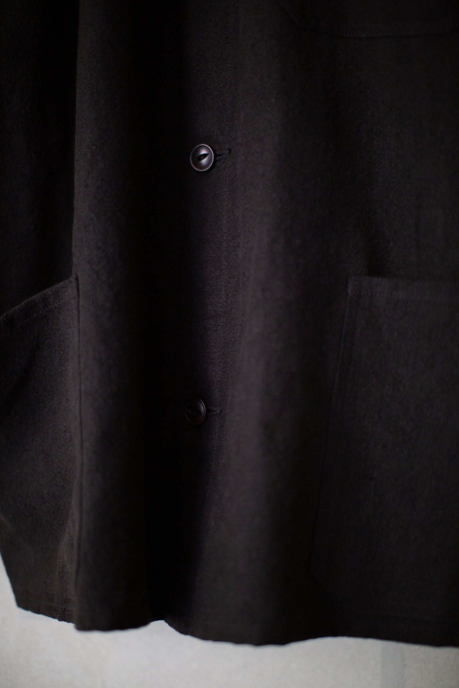 Coverall jacket by Yoko Sakamoto in brown max high count hemp with classic utilitarian inspired design and three generously sized patched front pockets.
