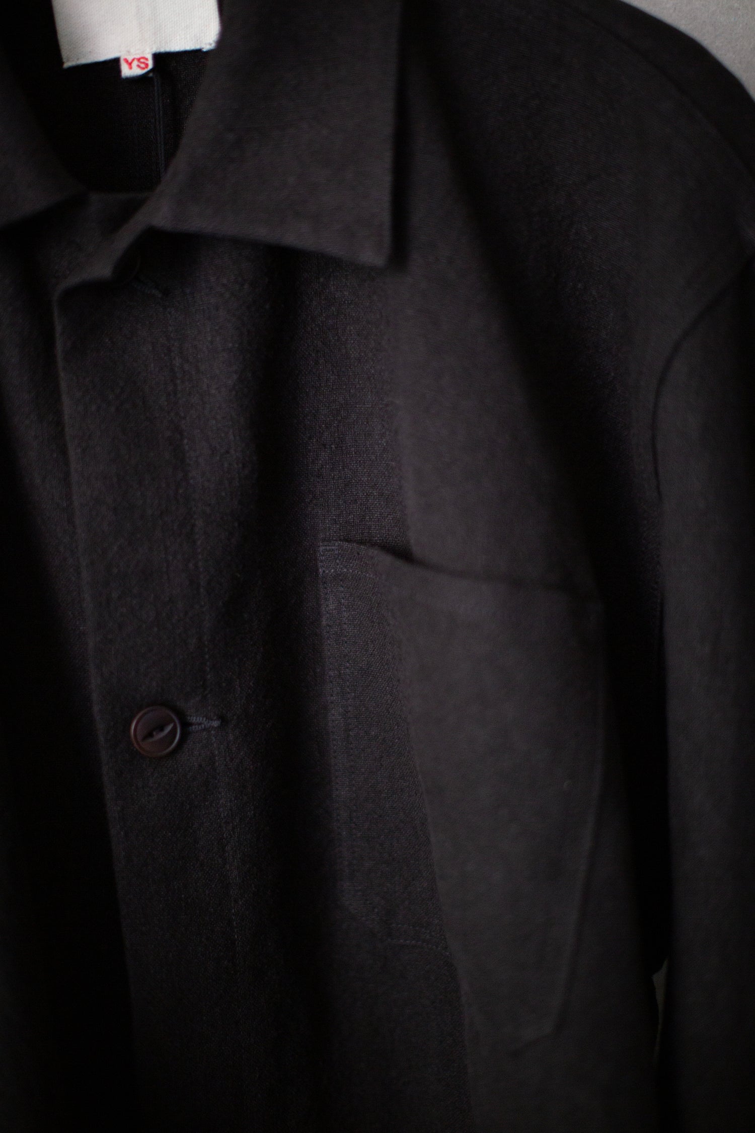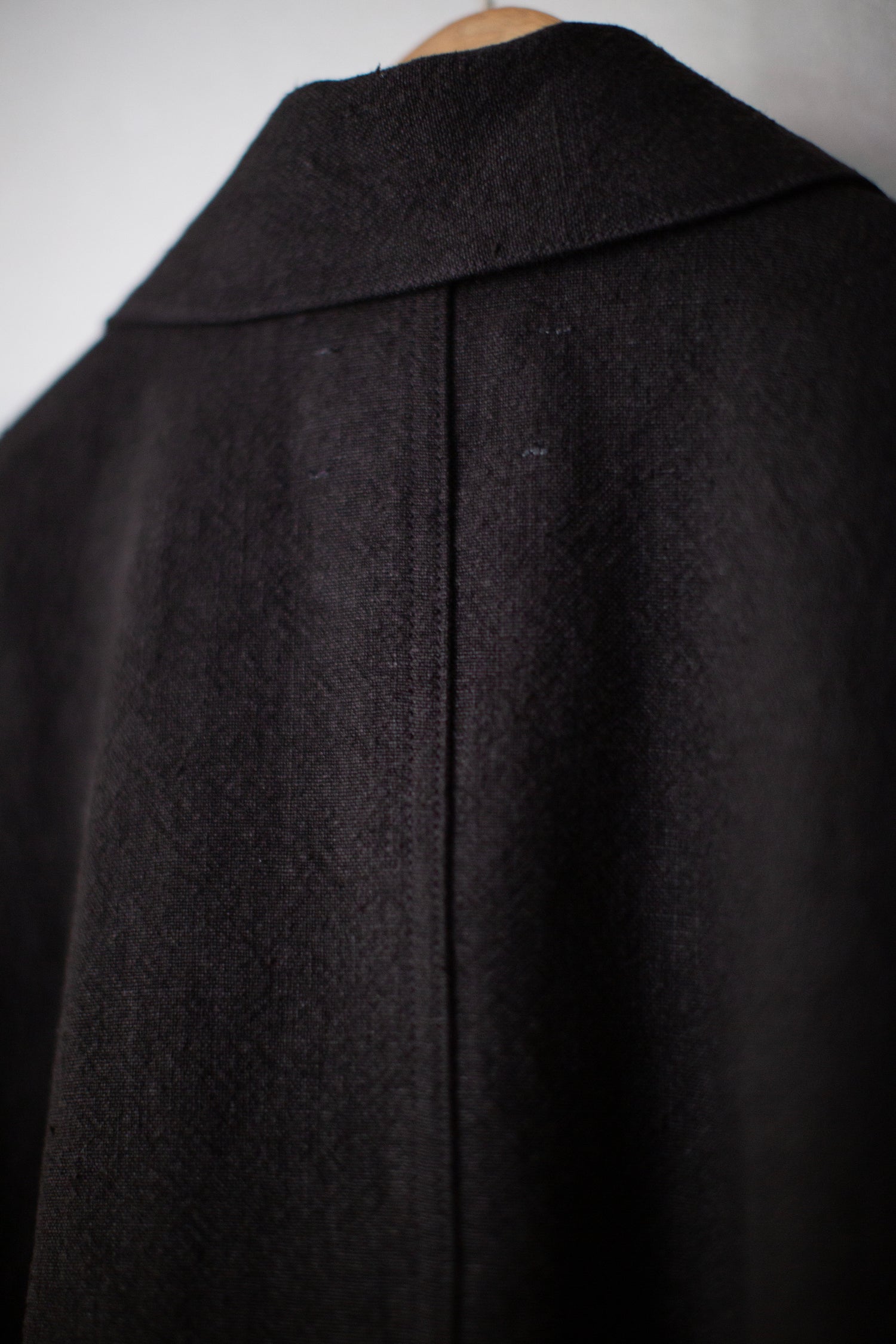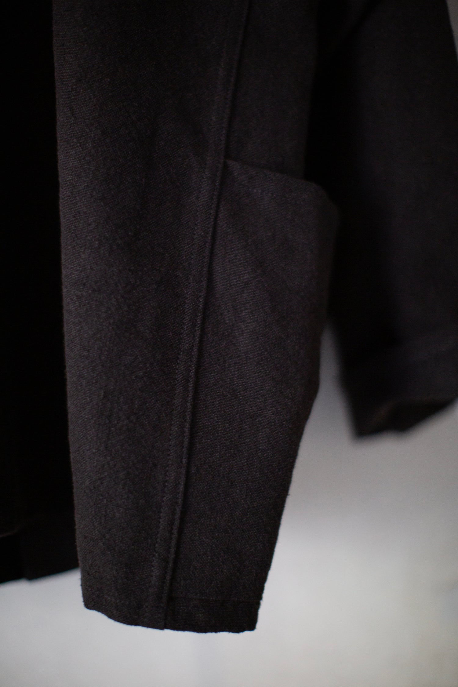Coverall jacket by Yoko Sakamoto in brown max high count hemp with classic utilitarian inspired design and three generously sized patched front pockets.