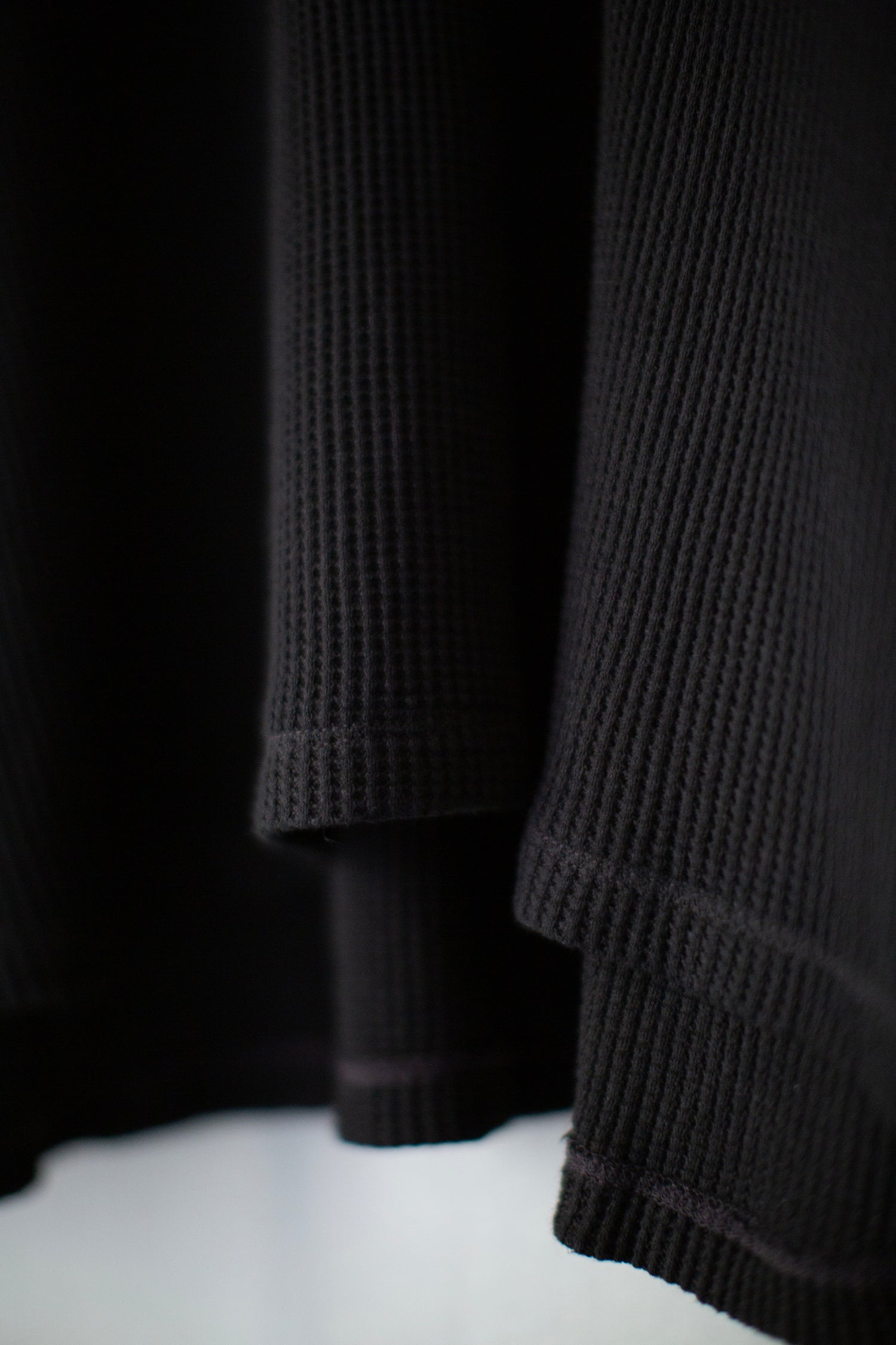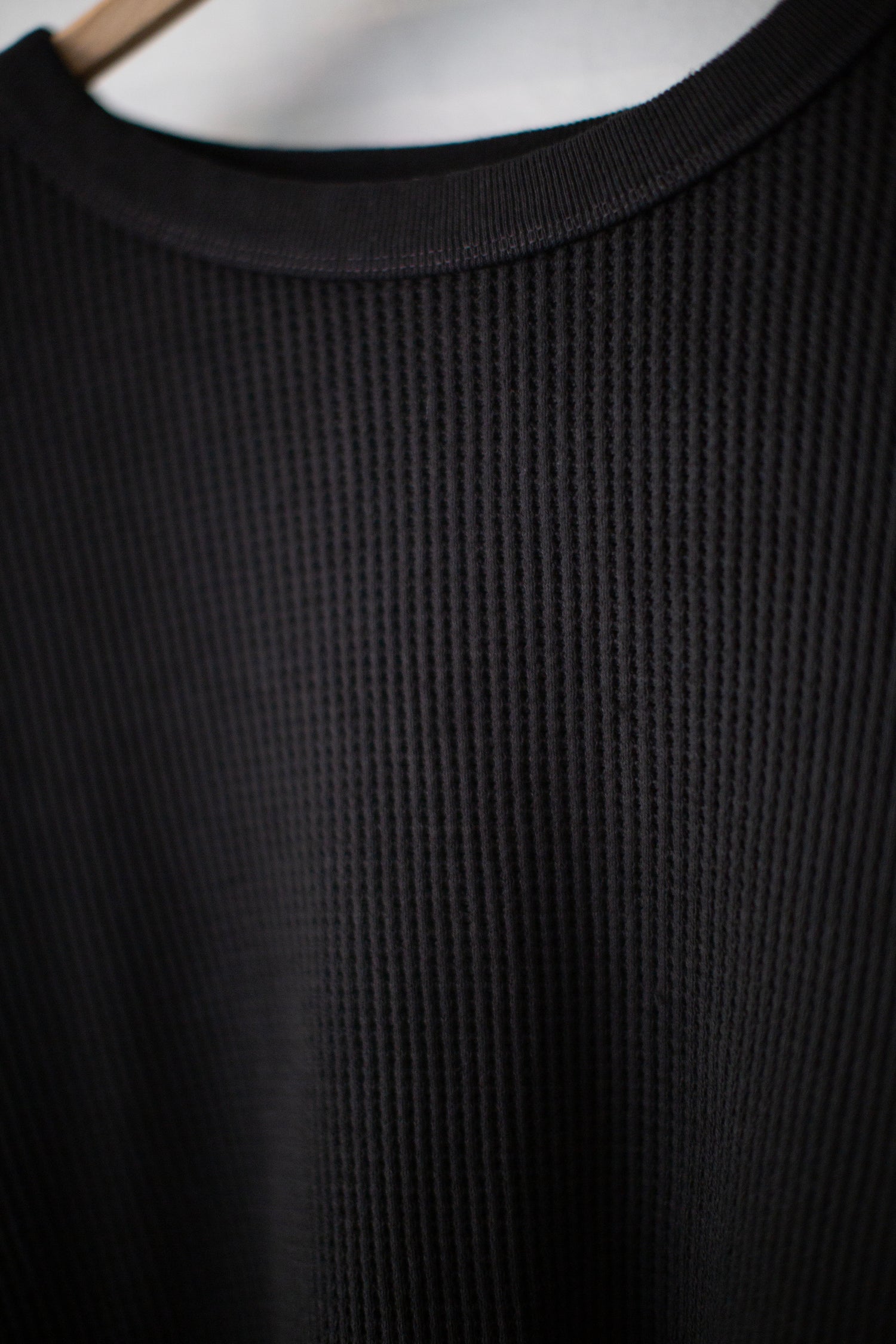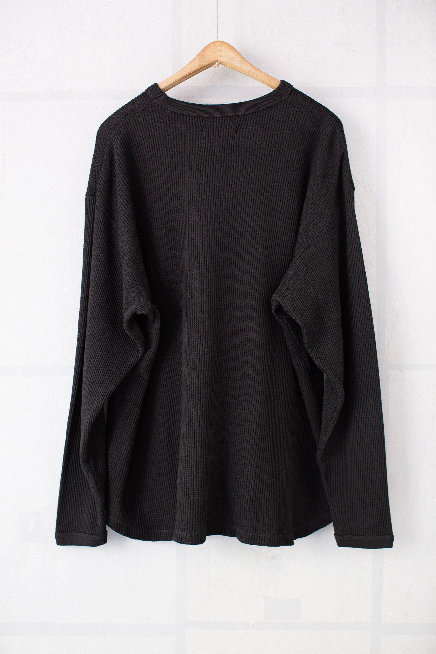 Long-sleeved crew neck pullover by Yoko Sakamoto in natural kakishibu (persimmon tannin) dyed mid weight thermal jersey with dropped shoulders, a loose silhouette and rib edged cuffs.