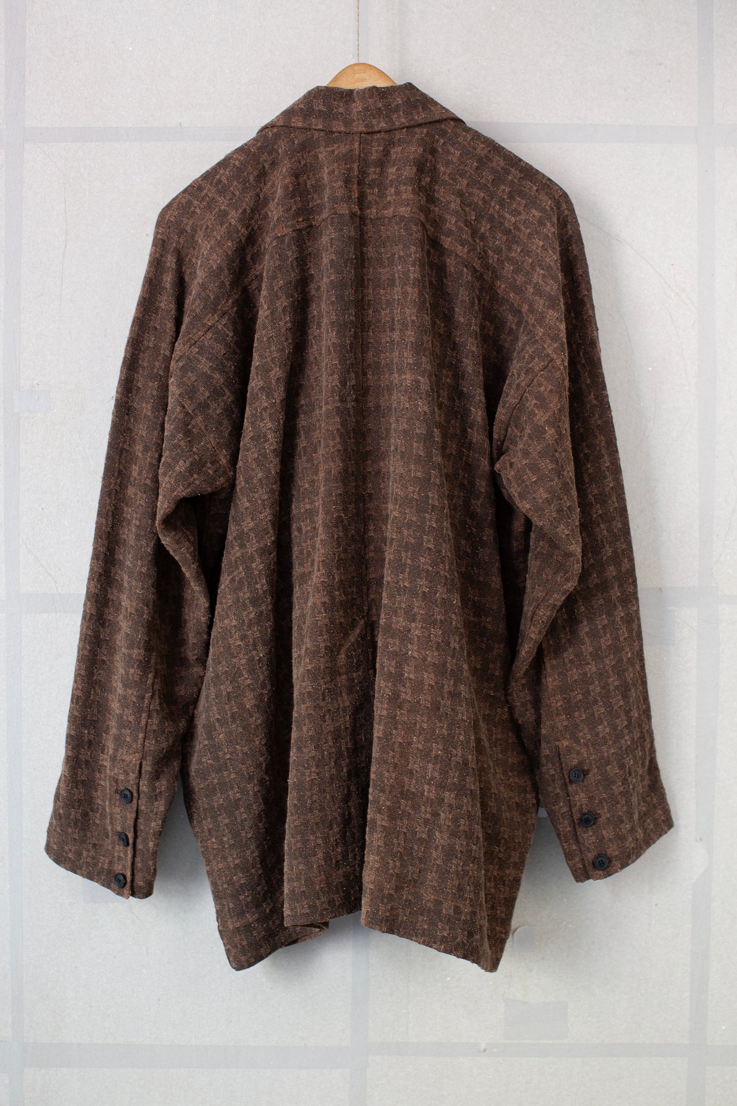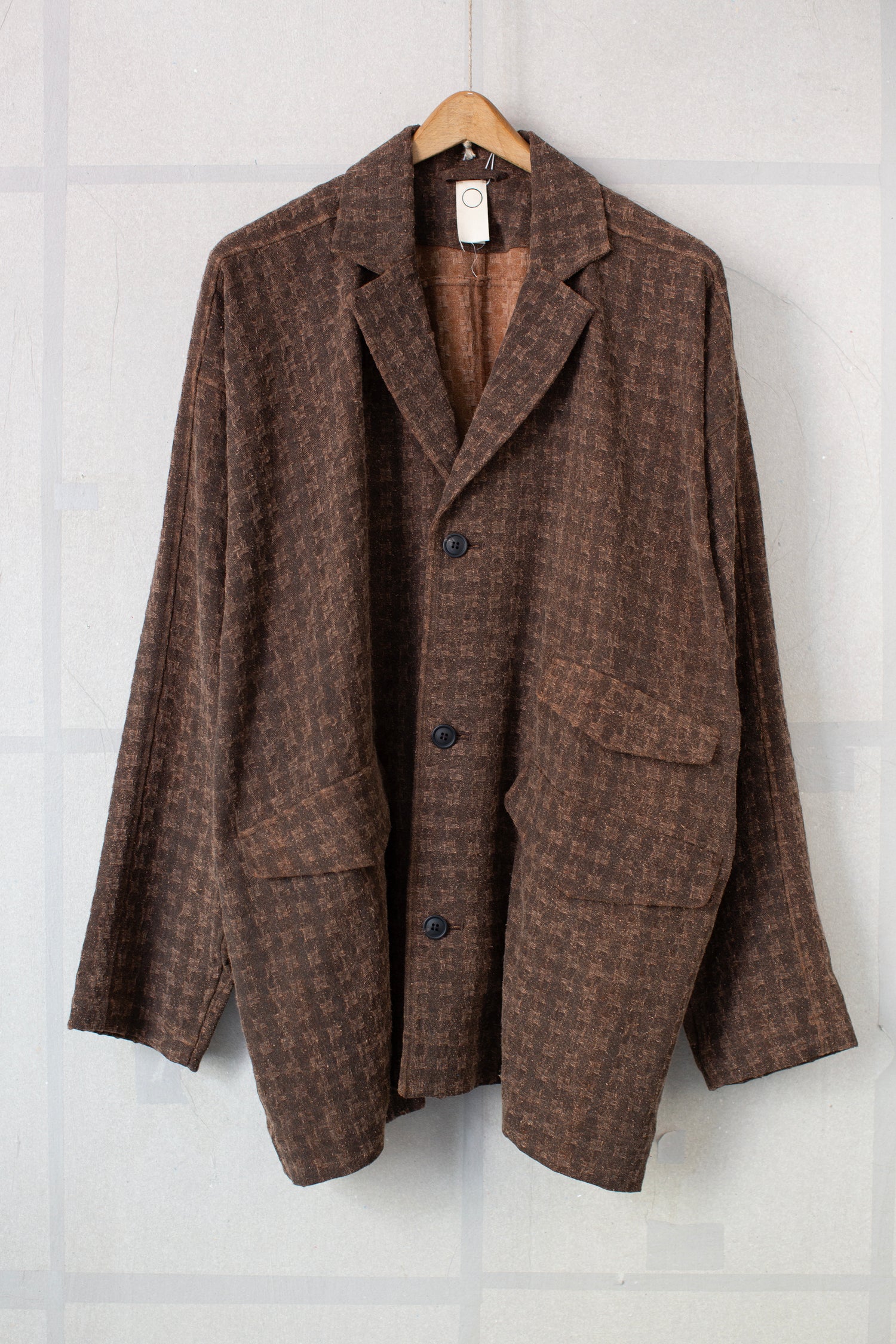 Unlined three button blazer jacket in dark brown doro (mud) dyed silk cotton with three flap closure front pockets and one split in back.