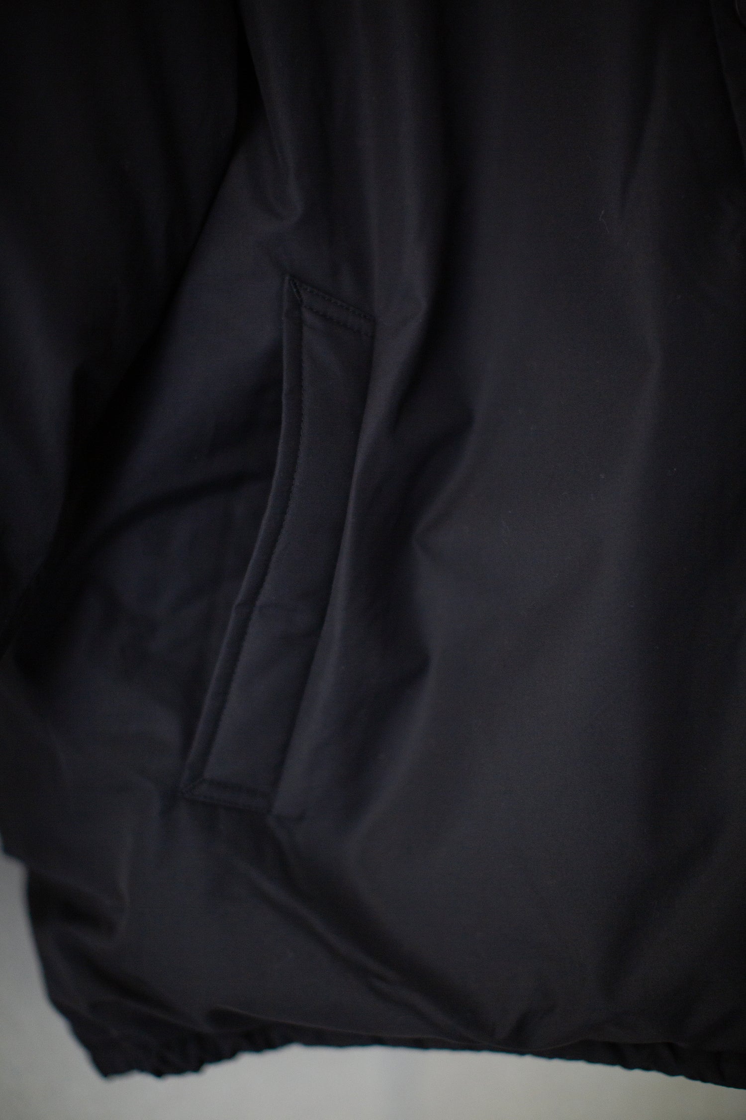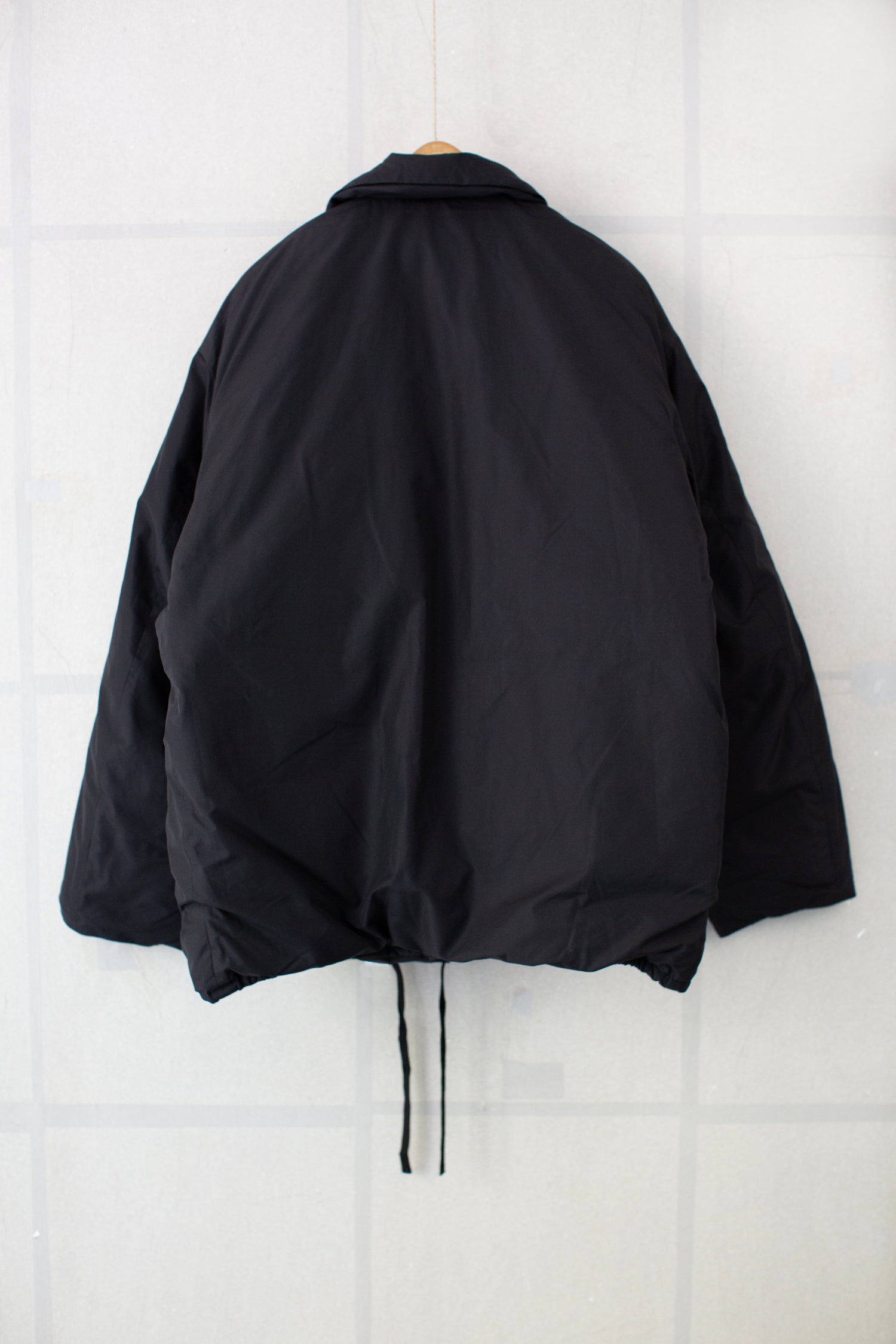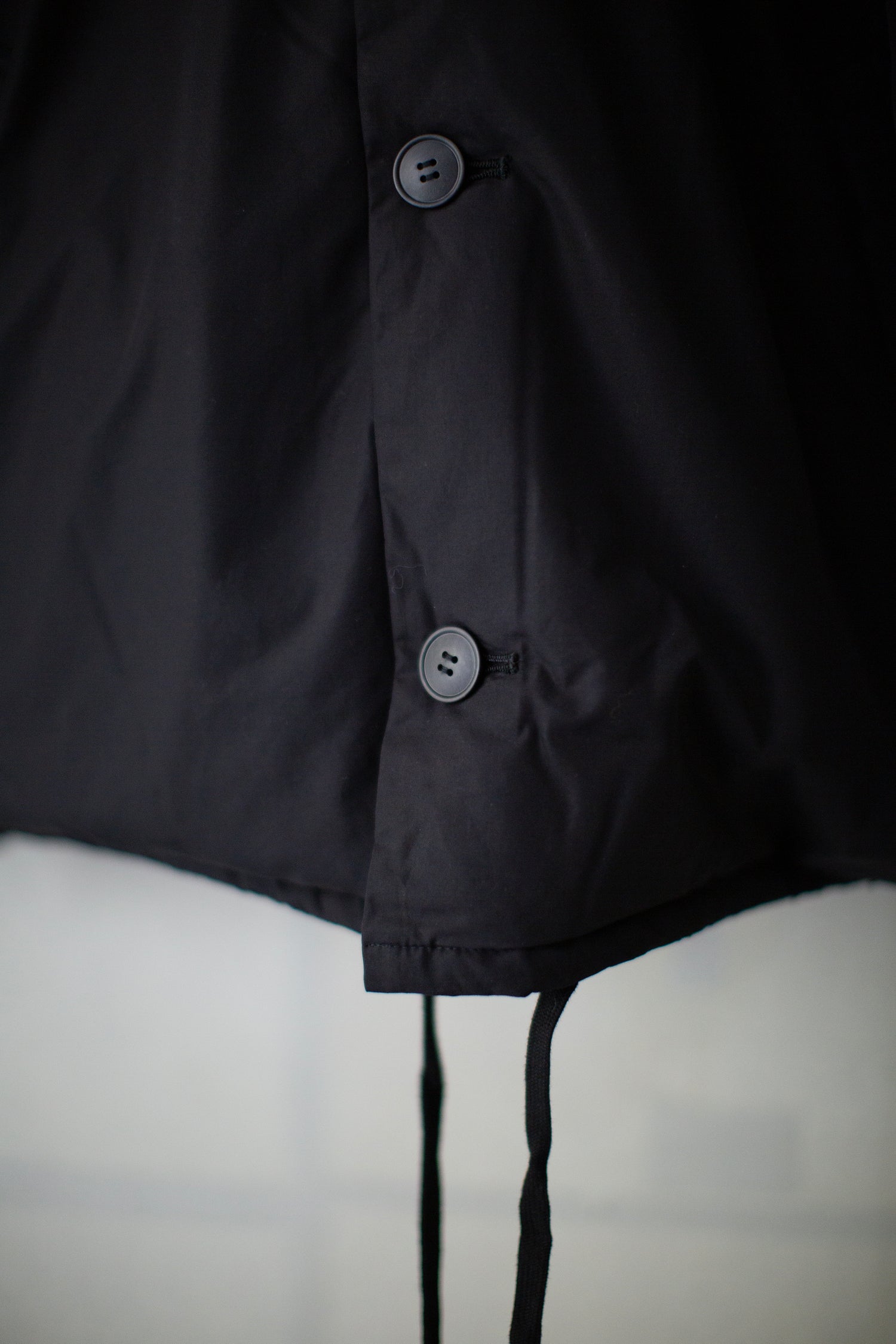 Down coach jacket by Yoko Sakamoto in black max high count weather cloth with a relaxed fit, stand-up collar, two welt pockets, two inside pockets and drawcord hem.