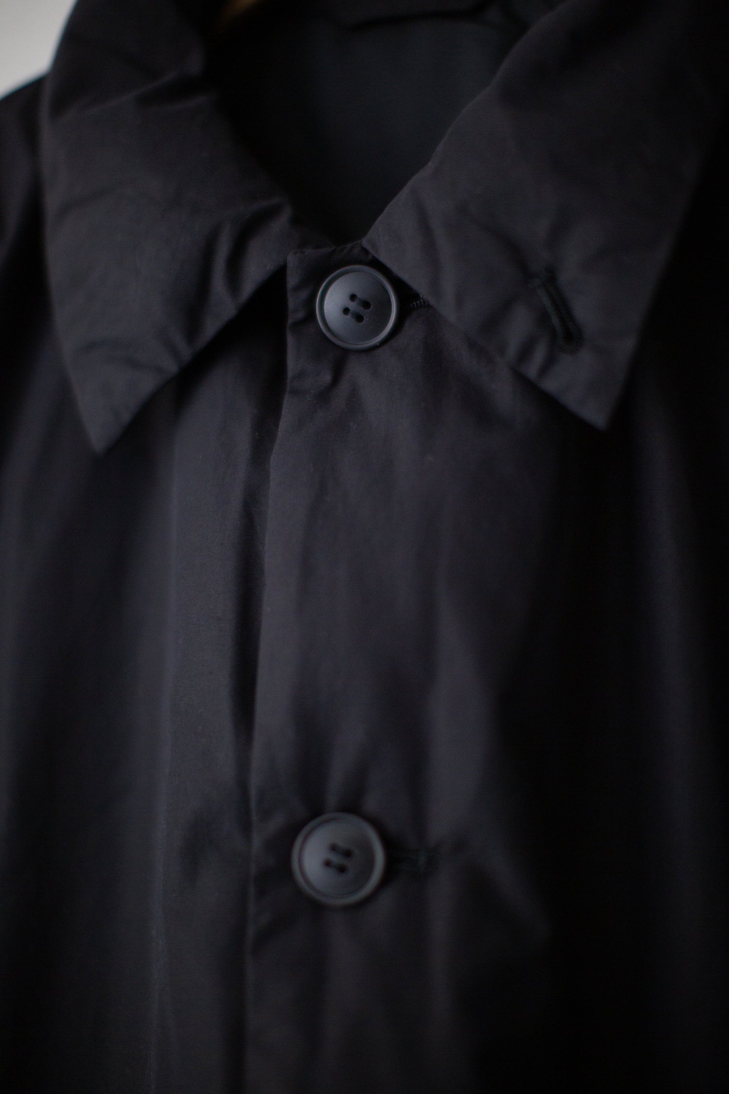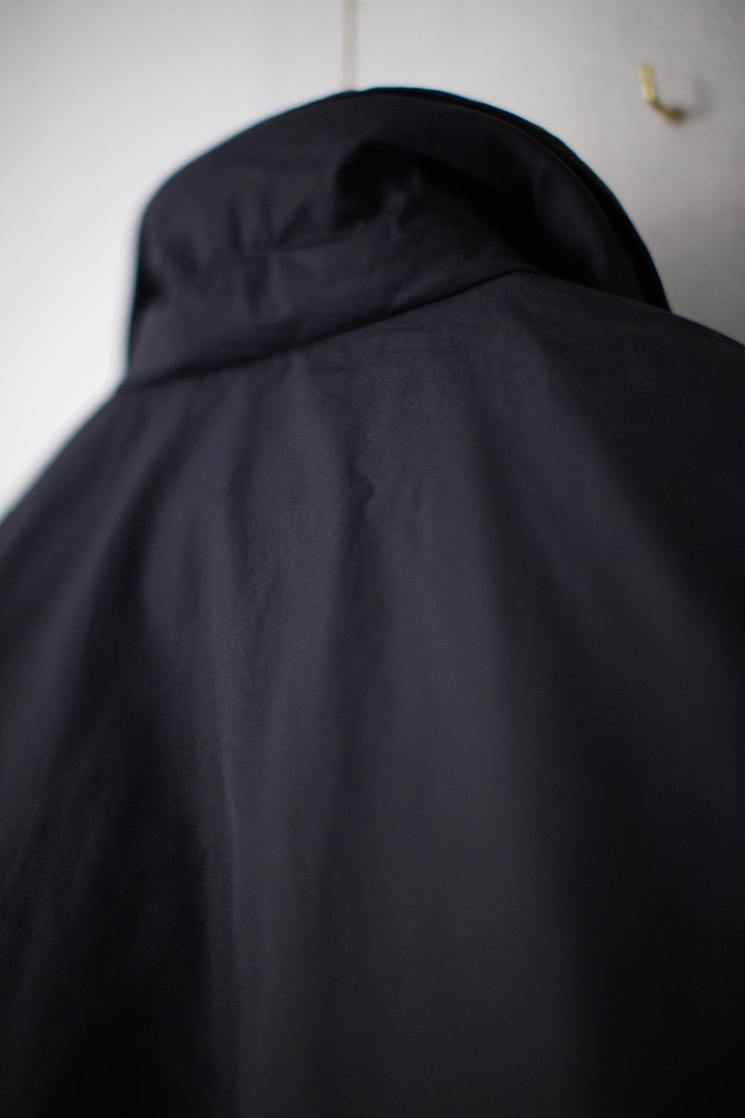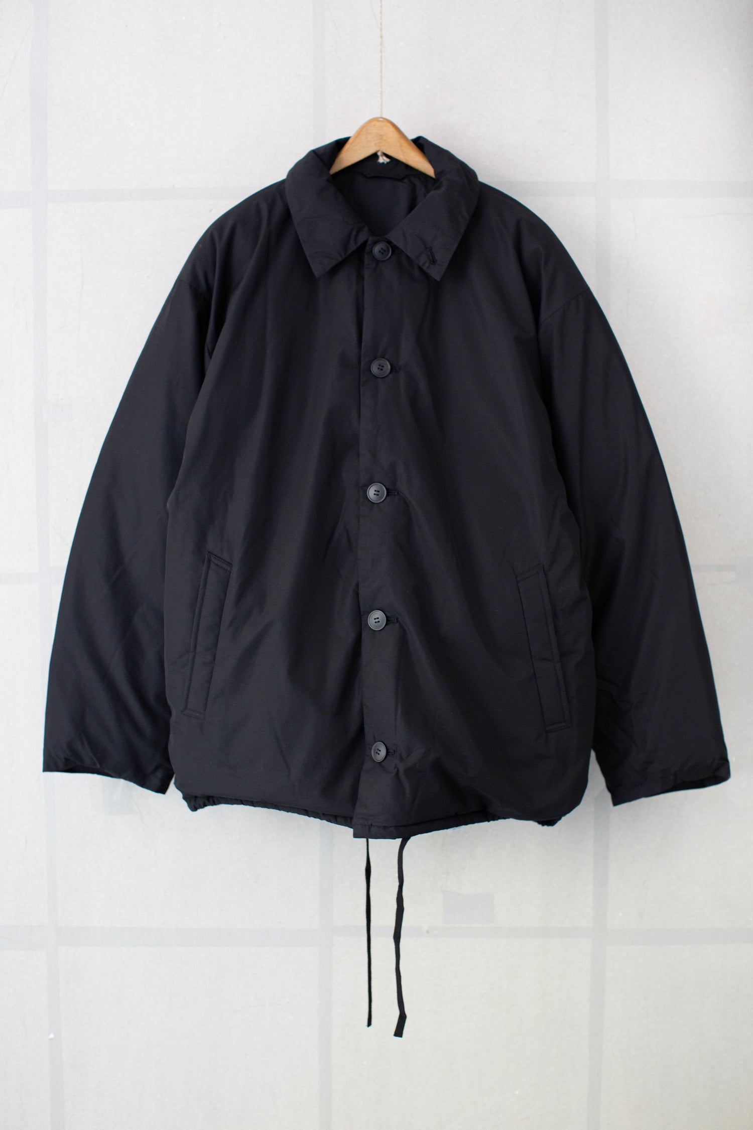 Down coach jacket by Yoko Sakamoto in black max high count weather cloth with a relaxed fit, stand-up collar, two welt pockets, two inside pockets and drawcord hem.