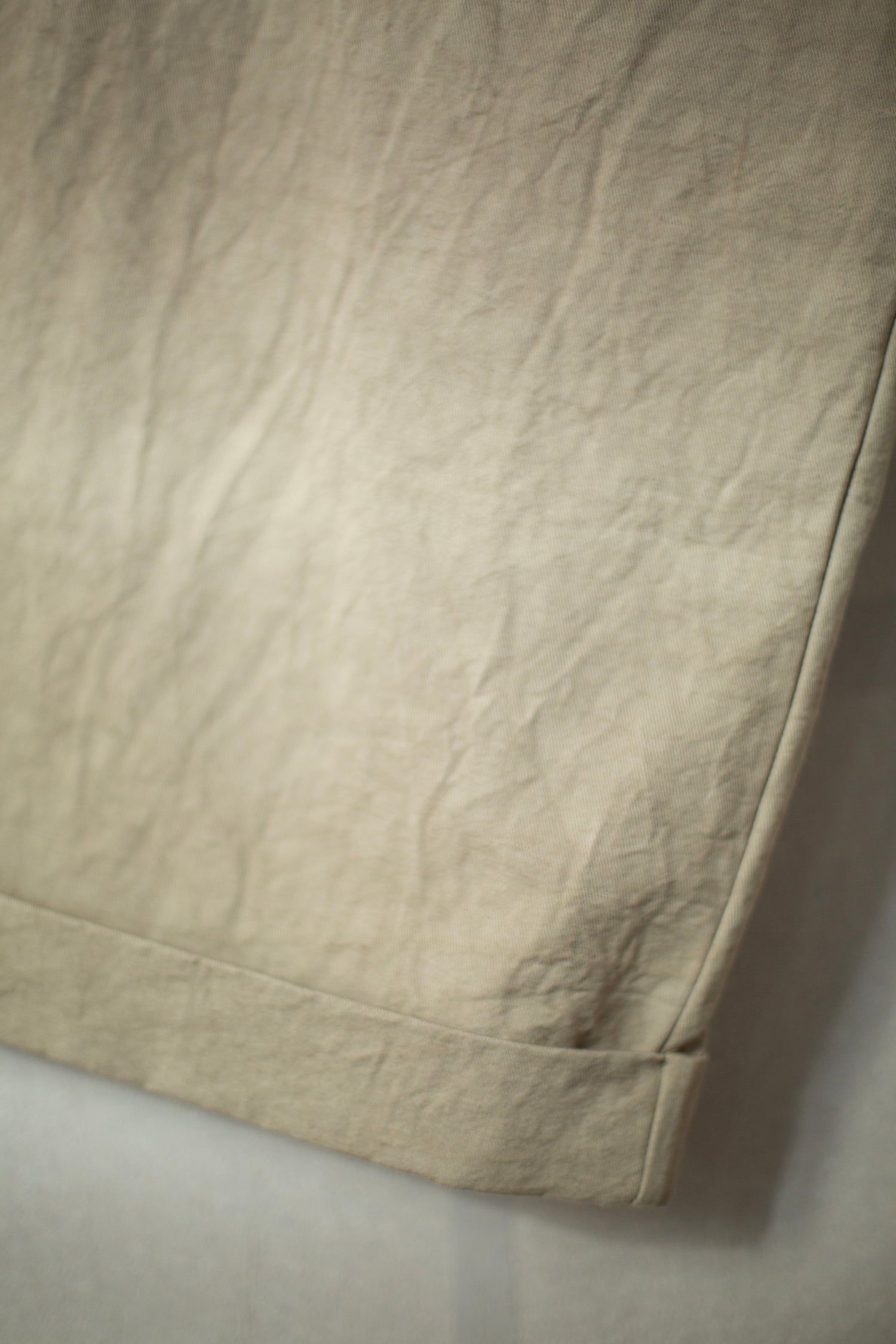 With single pleat, elasticated waistband, ribbon in waist, side pockets and fixed folded cuffs.