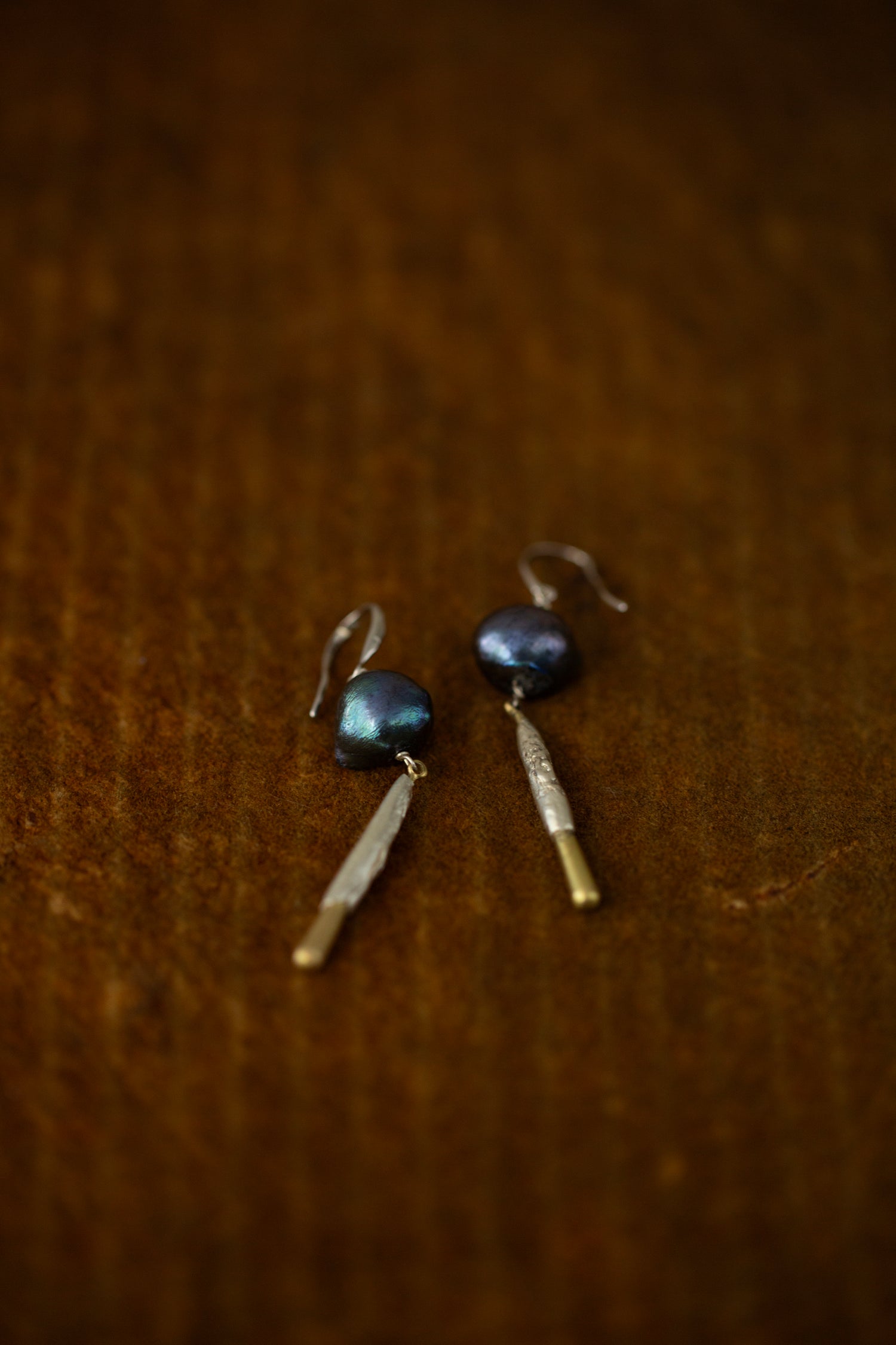 Pair of earrings with black keshi pearl and bronze/silver pendant by Atelier Inscrire.