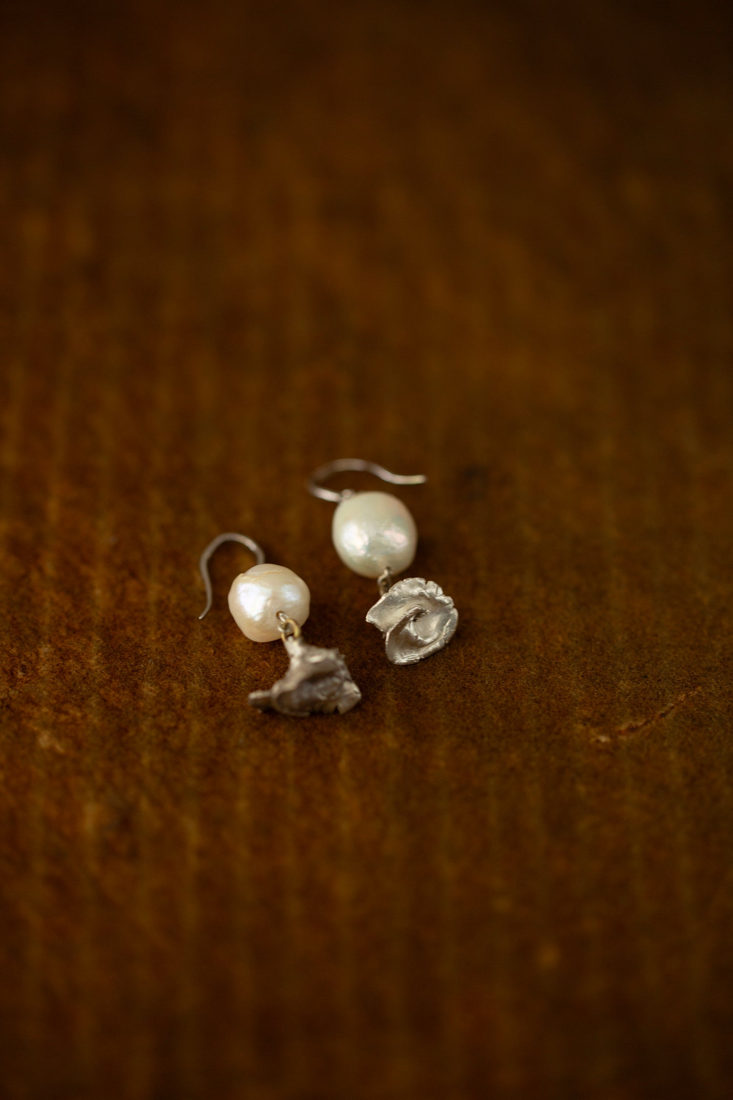Pair of earrings with pearls and handsculpted silver rose by Atelier Inscrire.
