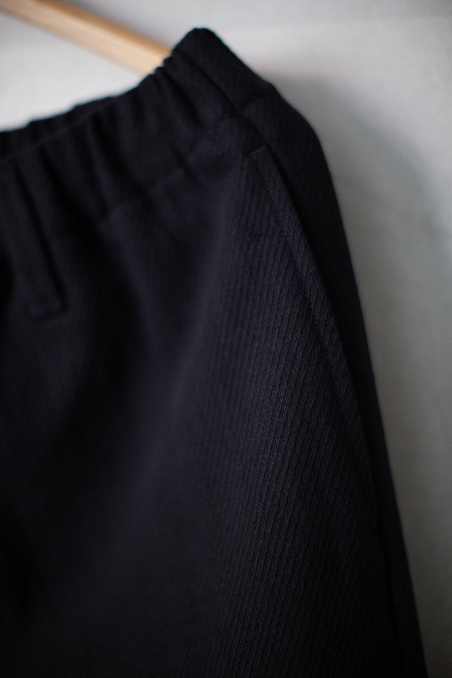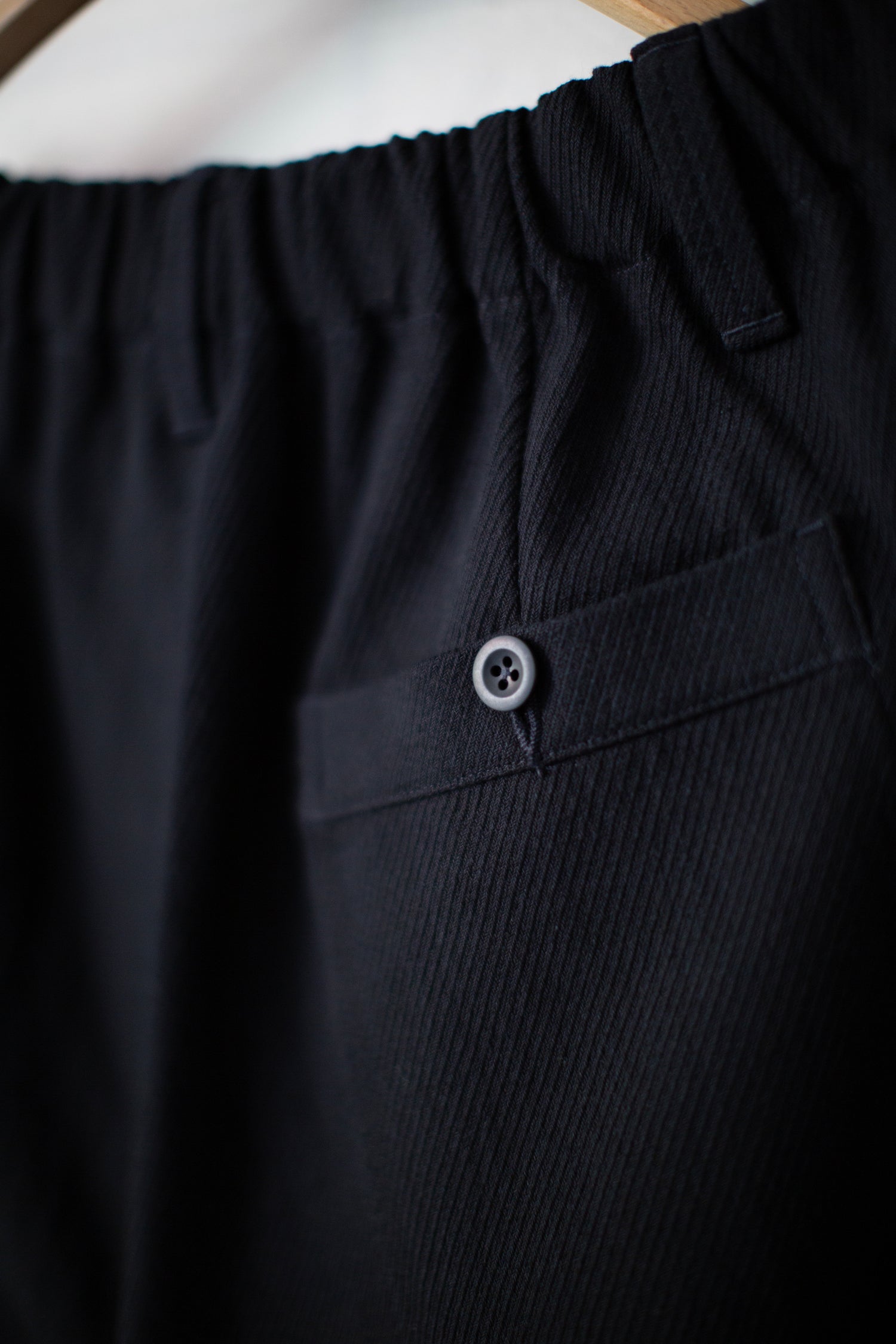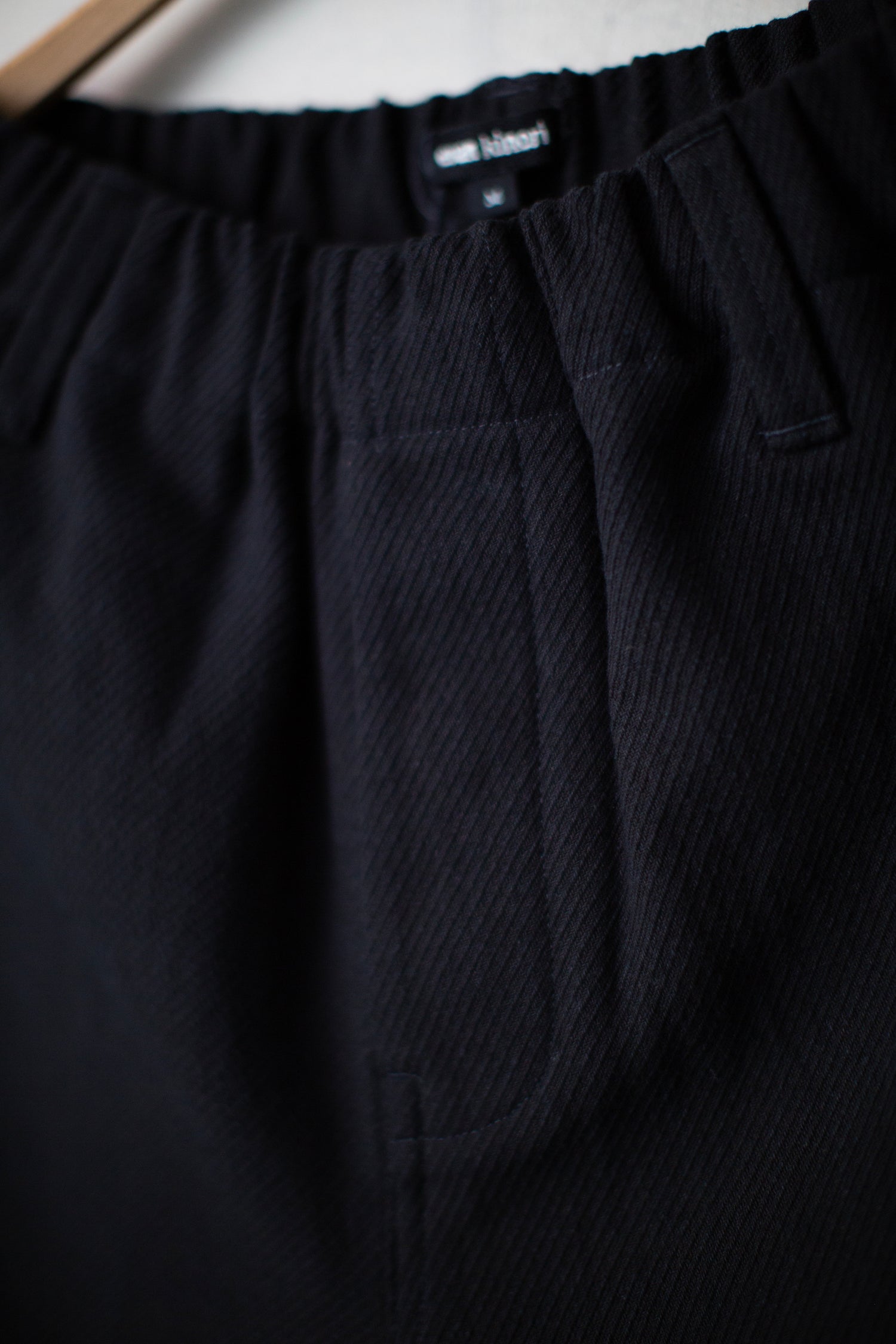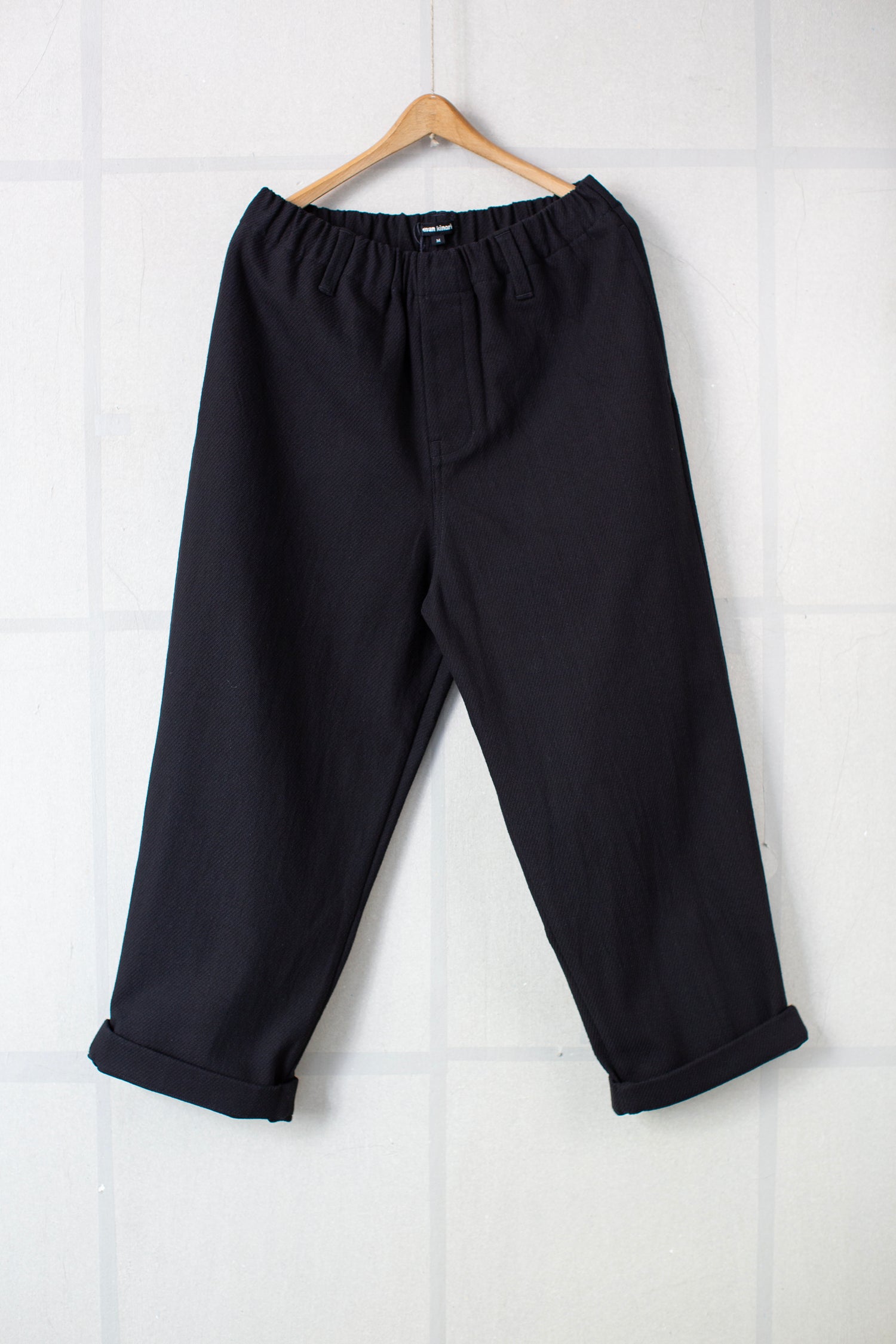 Straight leg pant in Black Cotton Kersey by Evan Kinori with elasticated waistband, belt loops, on-seam front pockets, single back pocket with button closure, clean finish button fly and corozo buttons.