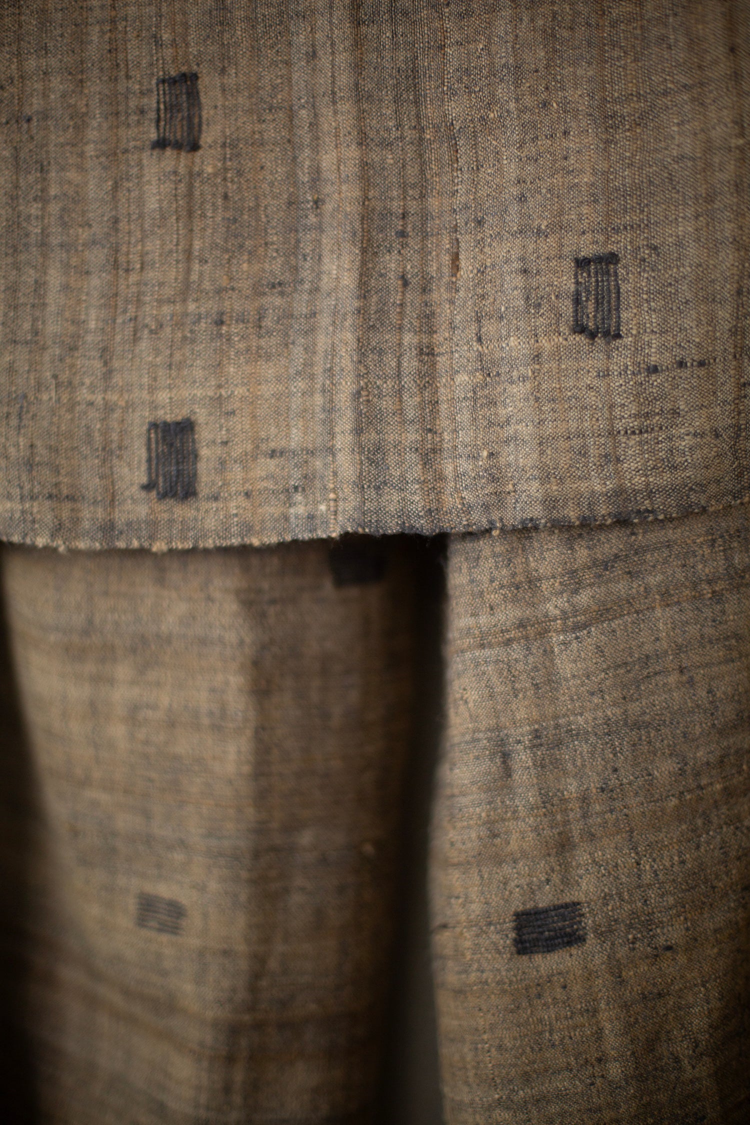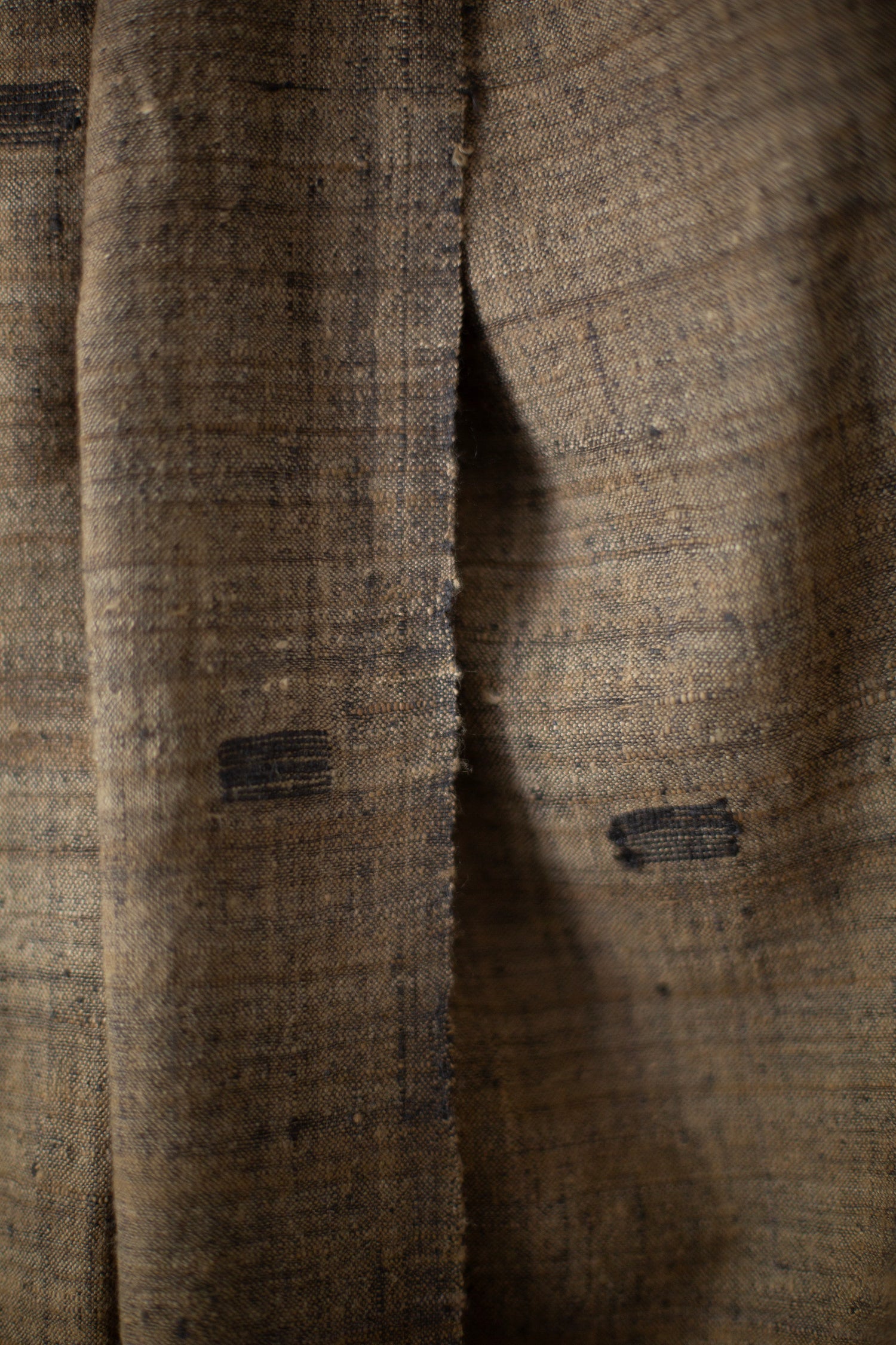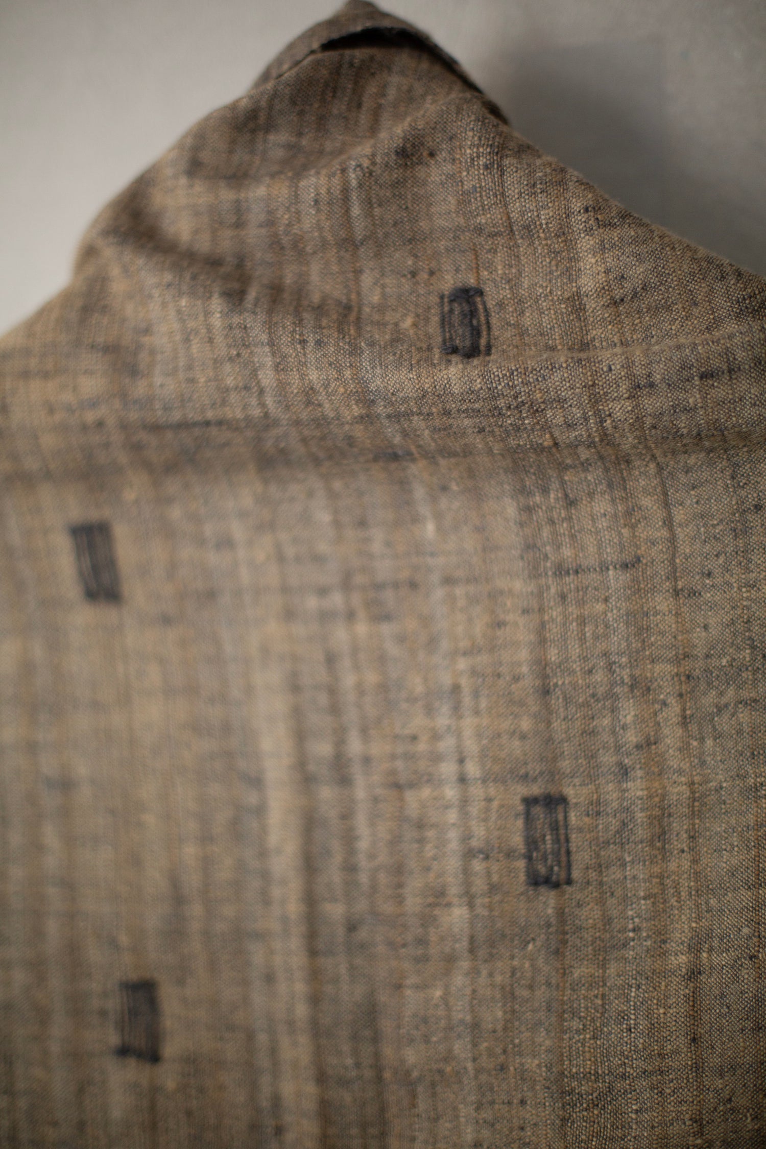Crisp Eri silk scarf with inlay weave details and fringes, naturally dyed with tea for the light tones and jaggery for the dark ones.