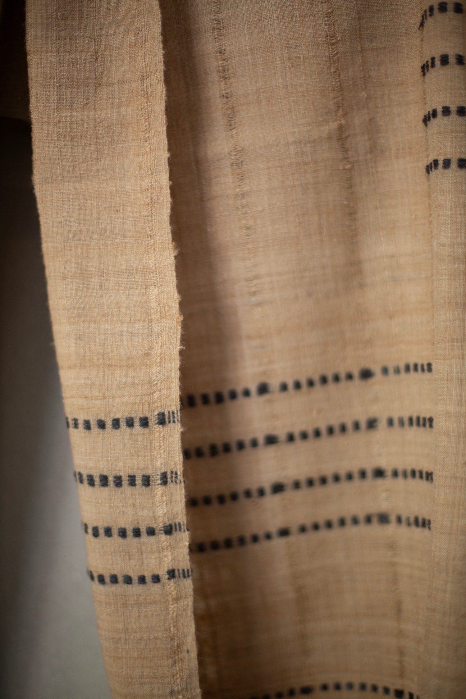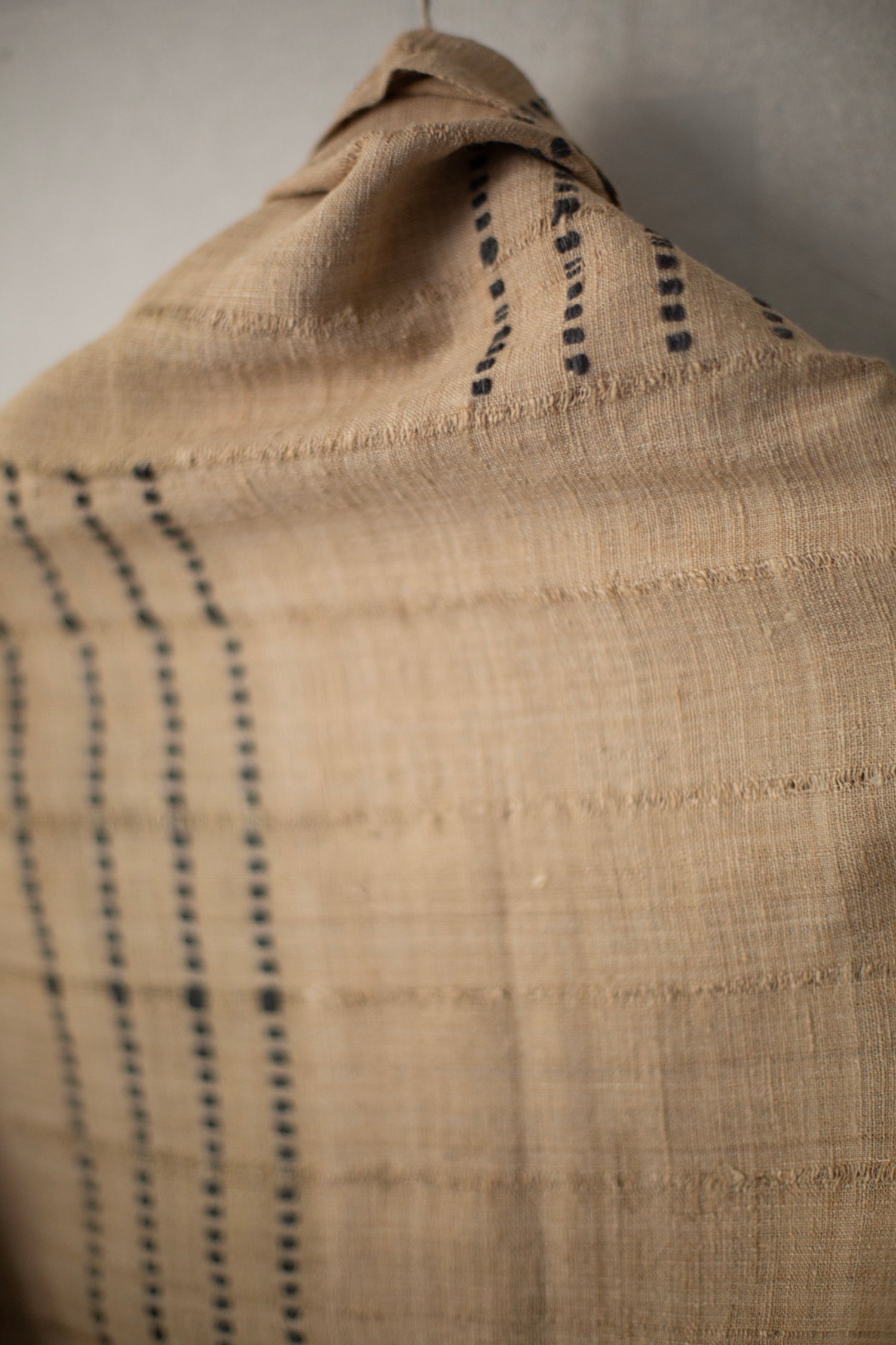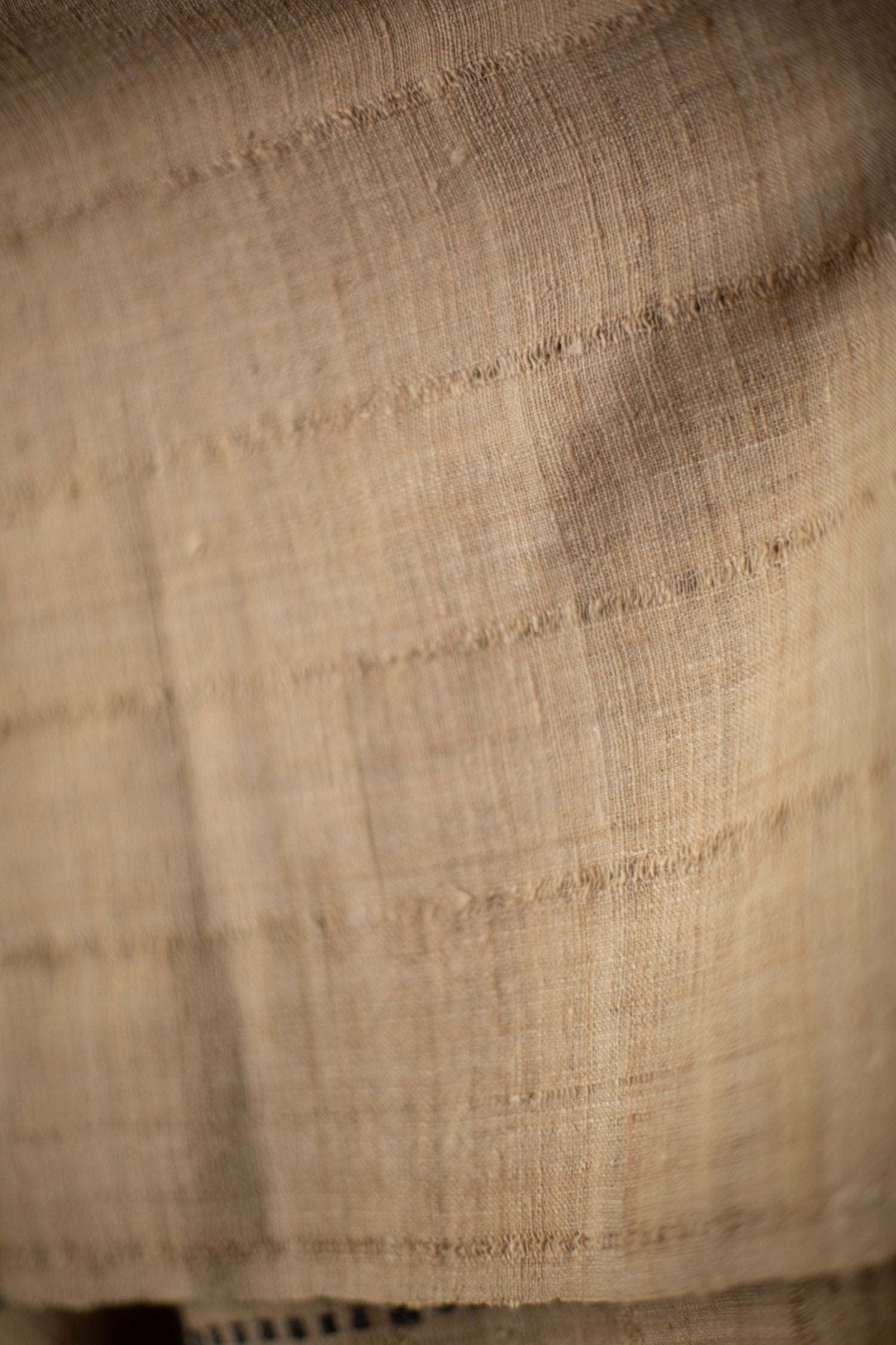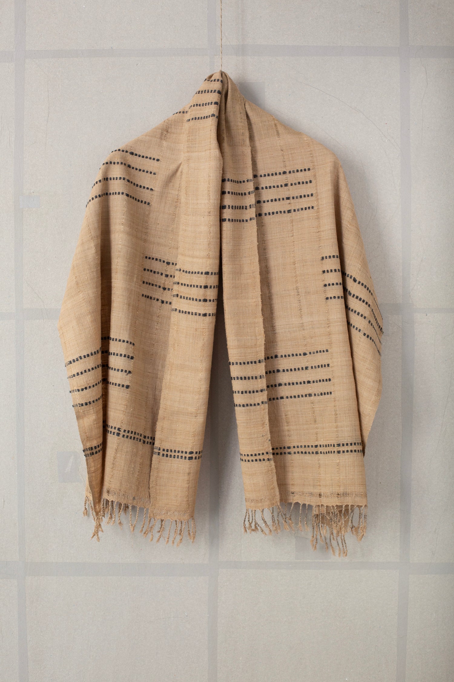 Crisp Eri silk scarf with extra weave details and fringes, naturally dyed with tea for the light tones and jaggery for the dark dashes.