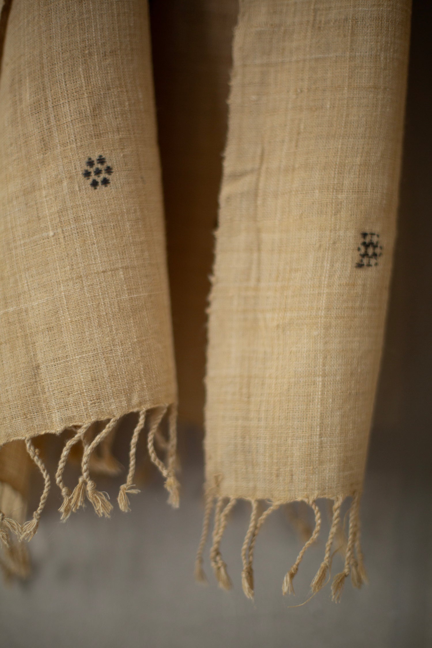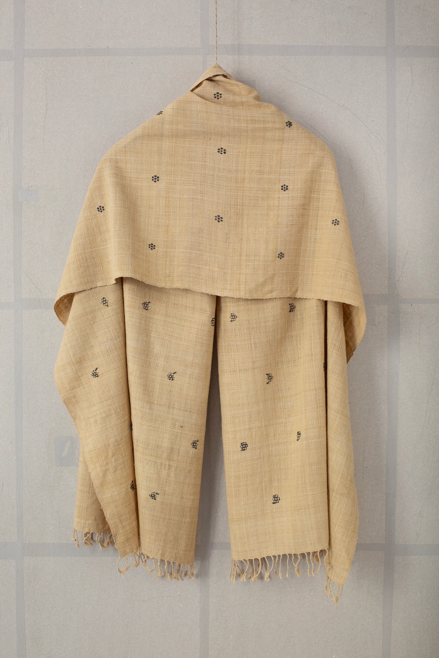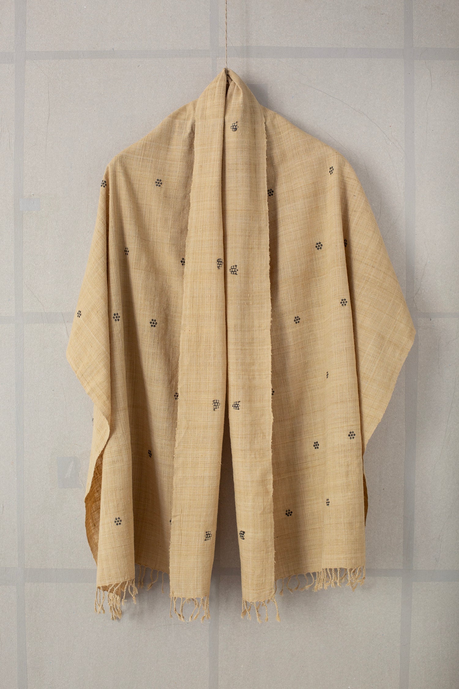 Crisp Eri silk scarf with tangaliya weave details and fringes, naturally dyed with bamboo shoots for the light tones and jaggery for the dark dots