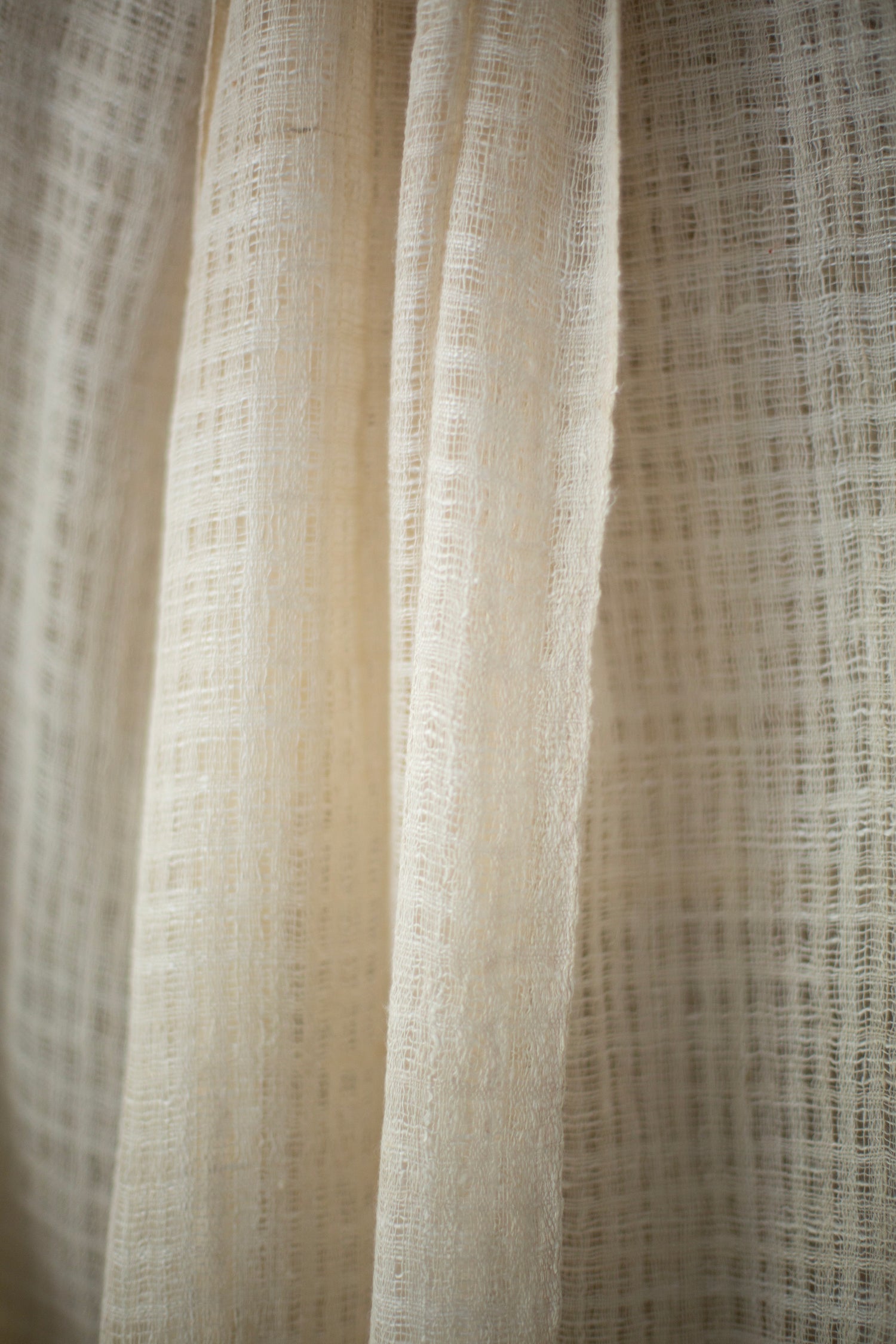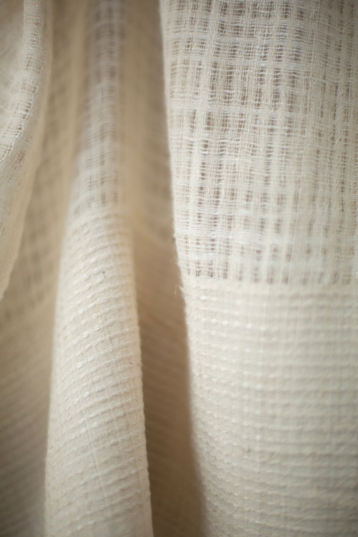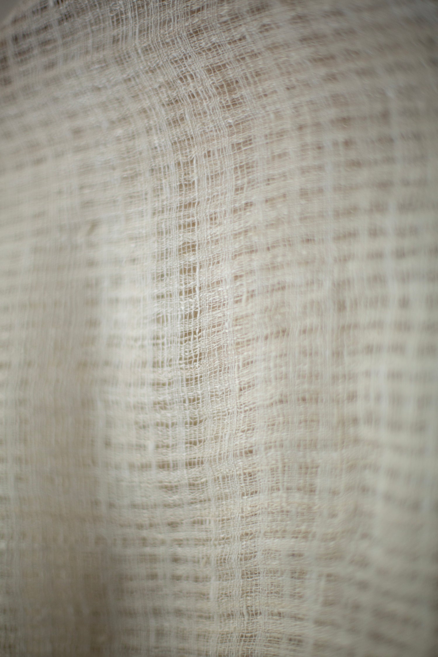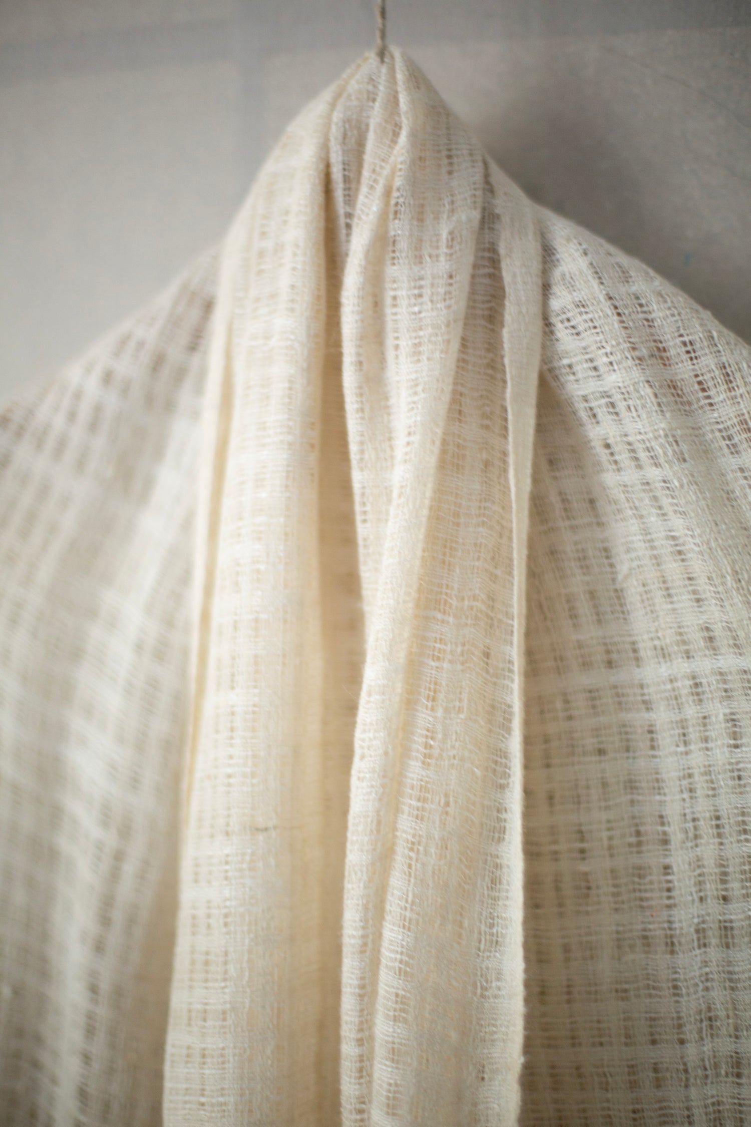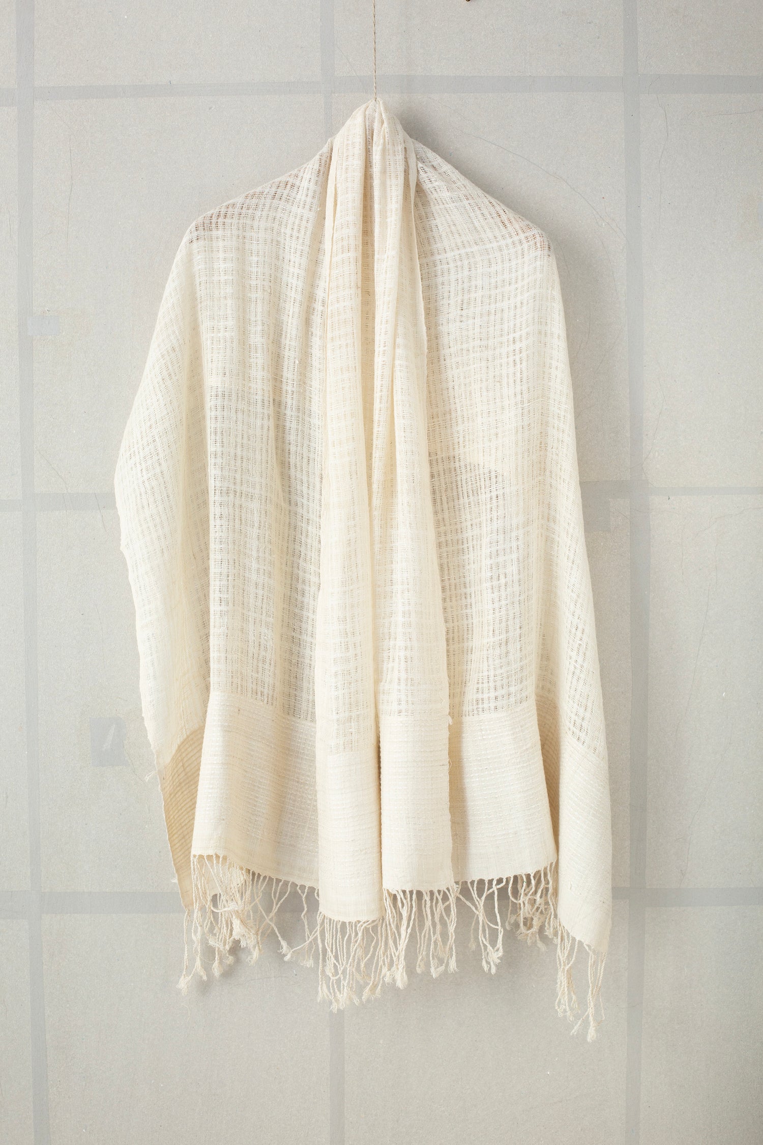 Soft undyed Eri silk scarf with tone-on-tone extra weave details and fringes.