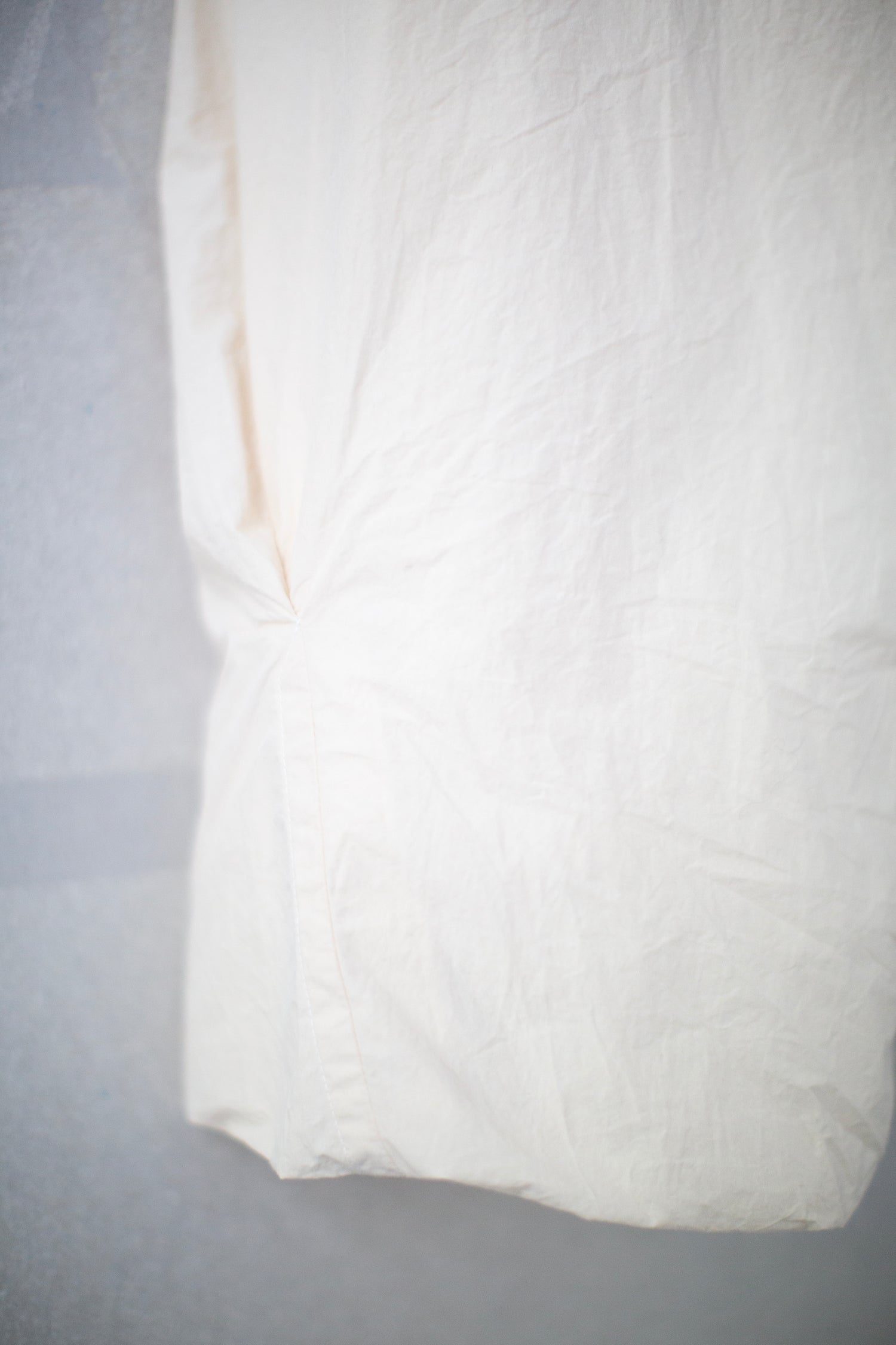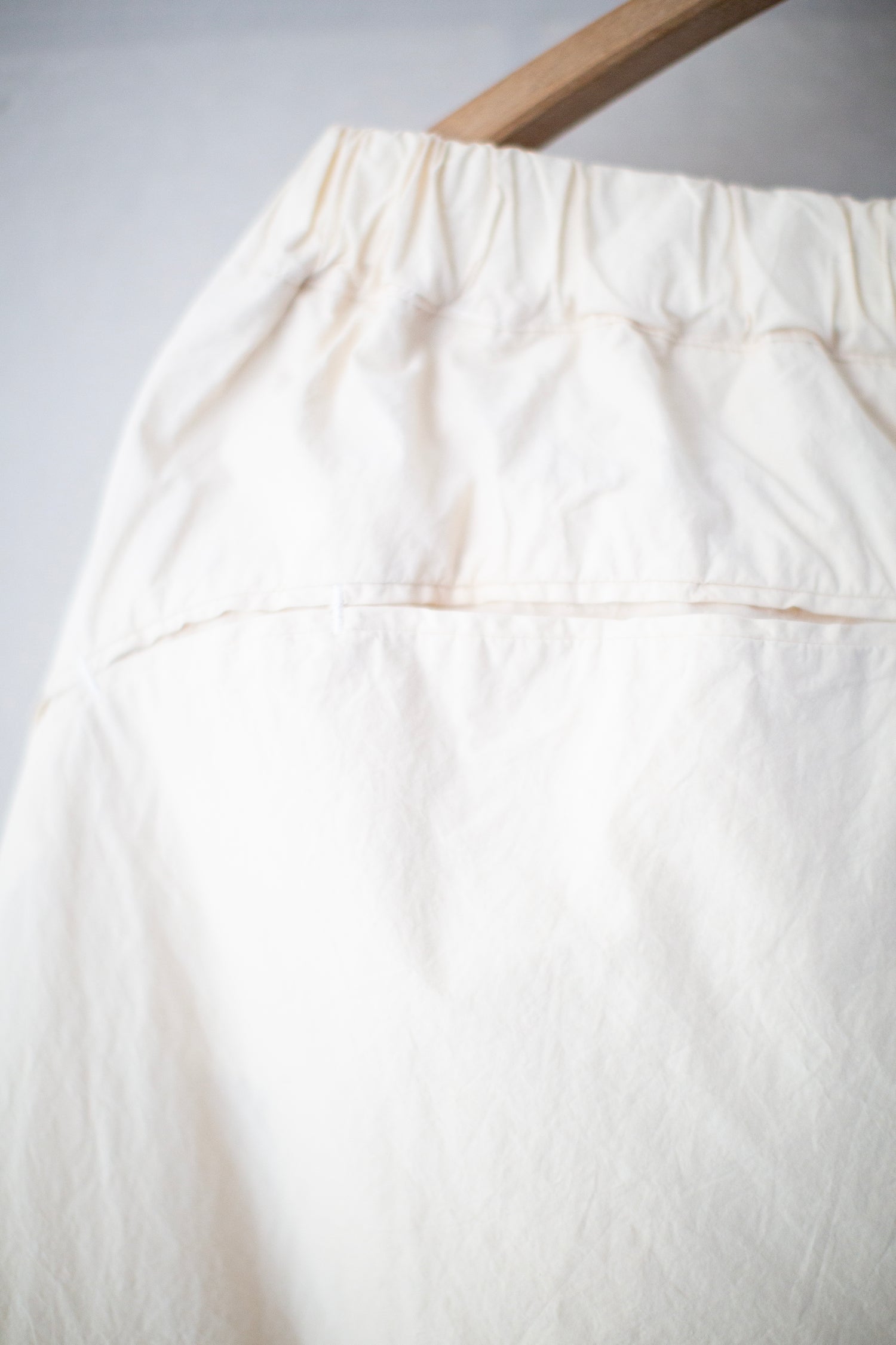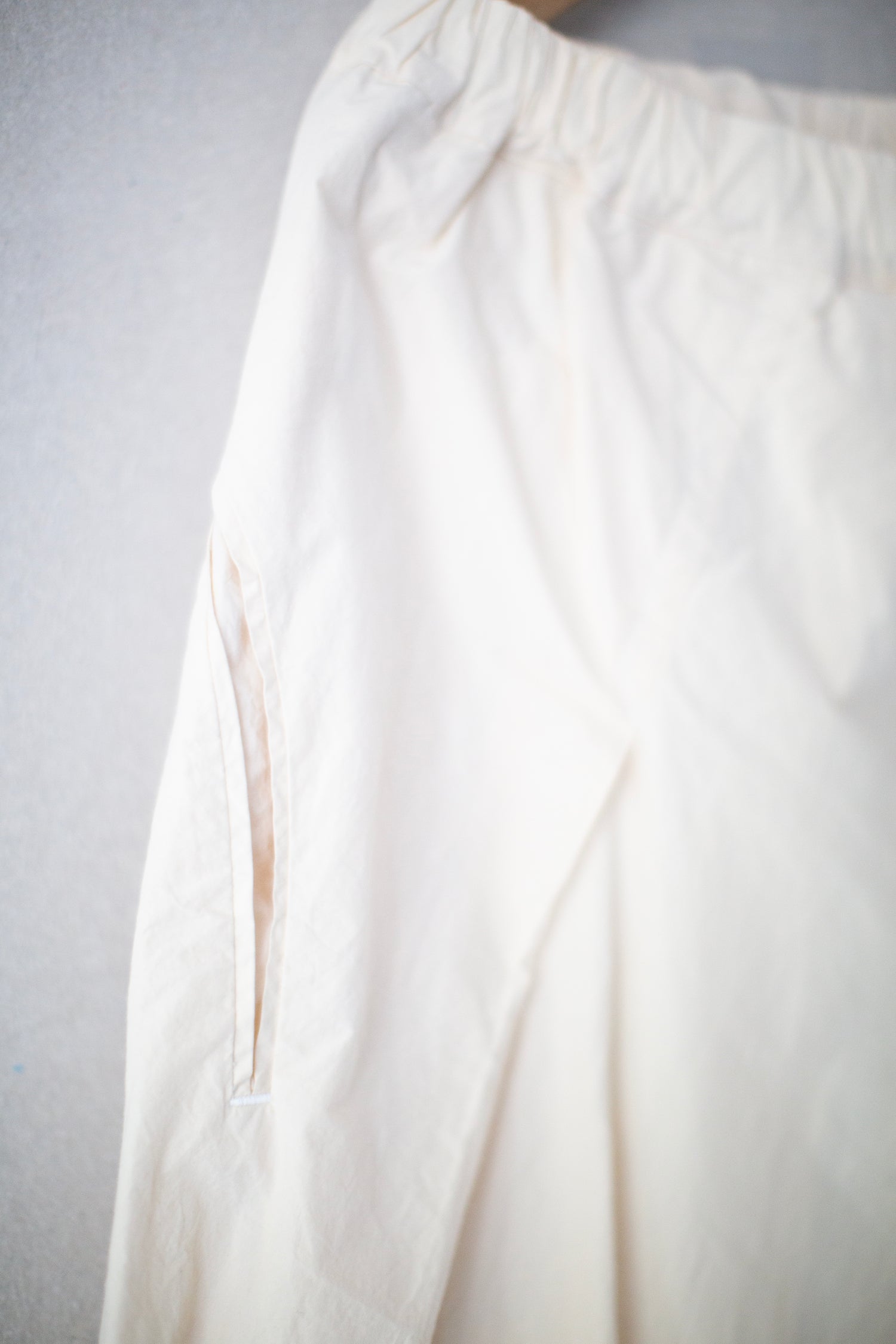 Double layer, tapered, fabric forming twist pants by Amachi in undyed off white with intricate pattern, twisted pleats, two side pockets, four back pockets, elasticated waist and ribbon inside waist.