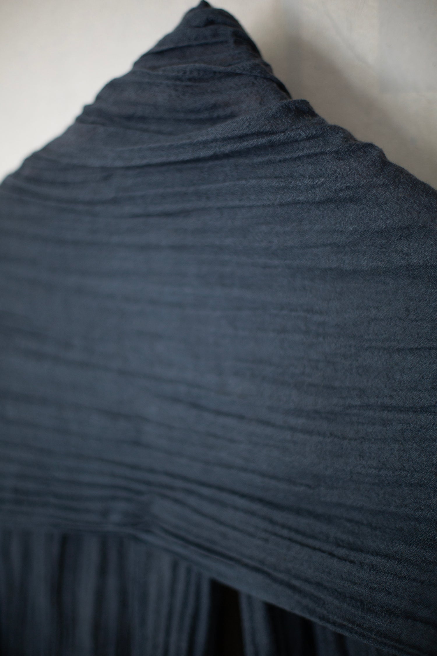 A softly textured yak khullu and silk-blend scarf. Its distinctive design features a centre panel of naturally pleated fabric, an effect which is created by the balance between the yak wool and silk in its weave. The scarf’s side panels have a higher concentration of silk, which tightens the weave, creating a smoother surface. In lightly contrasting shades, this scarf has a light sheen owing to its high percentage of silk.