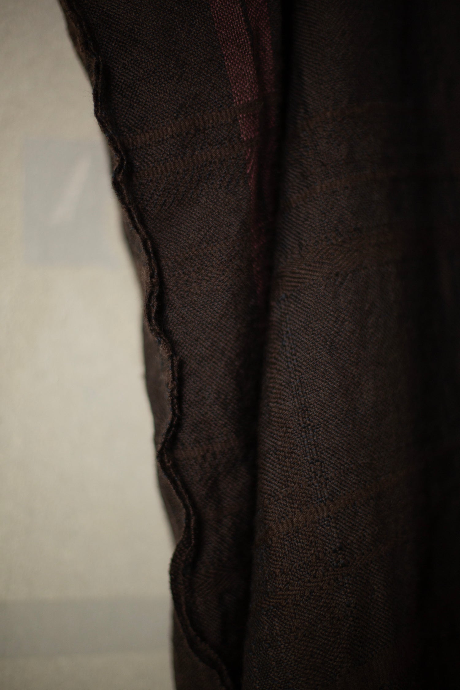 The fine wool is woven in various structures throughout the garment - twill, crepe, tabby and weft faced.