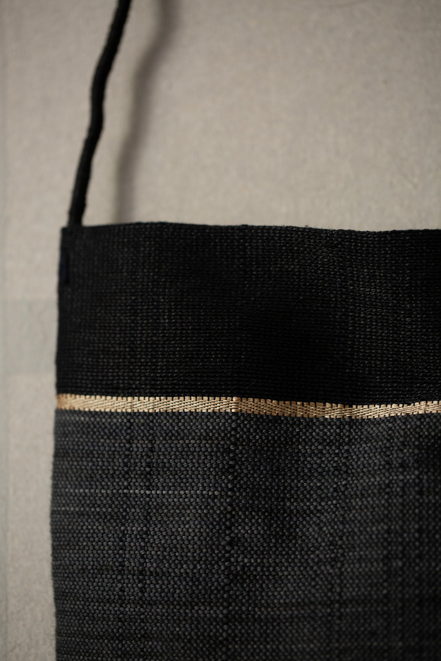 A hand woven small carrier bag, self lined with linen whipped straps and attached tassels by contemporary weaver Christopher Duncan.
