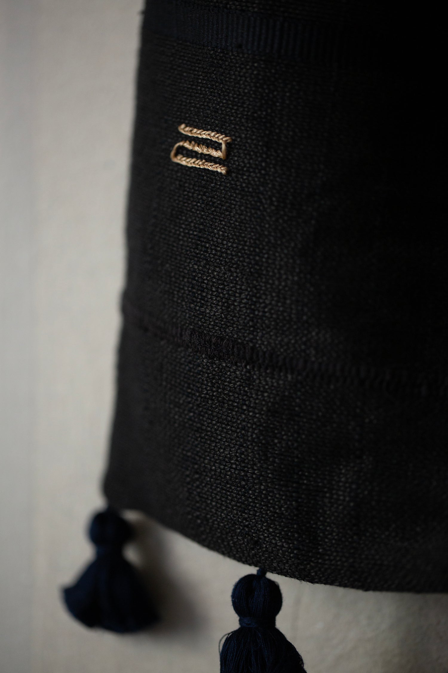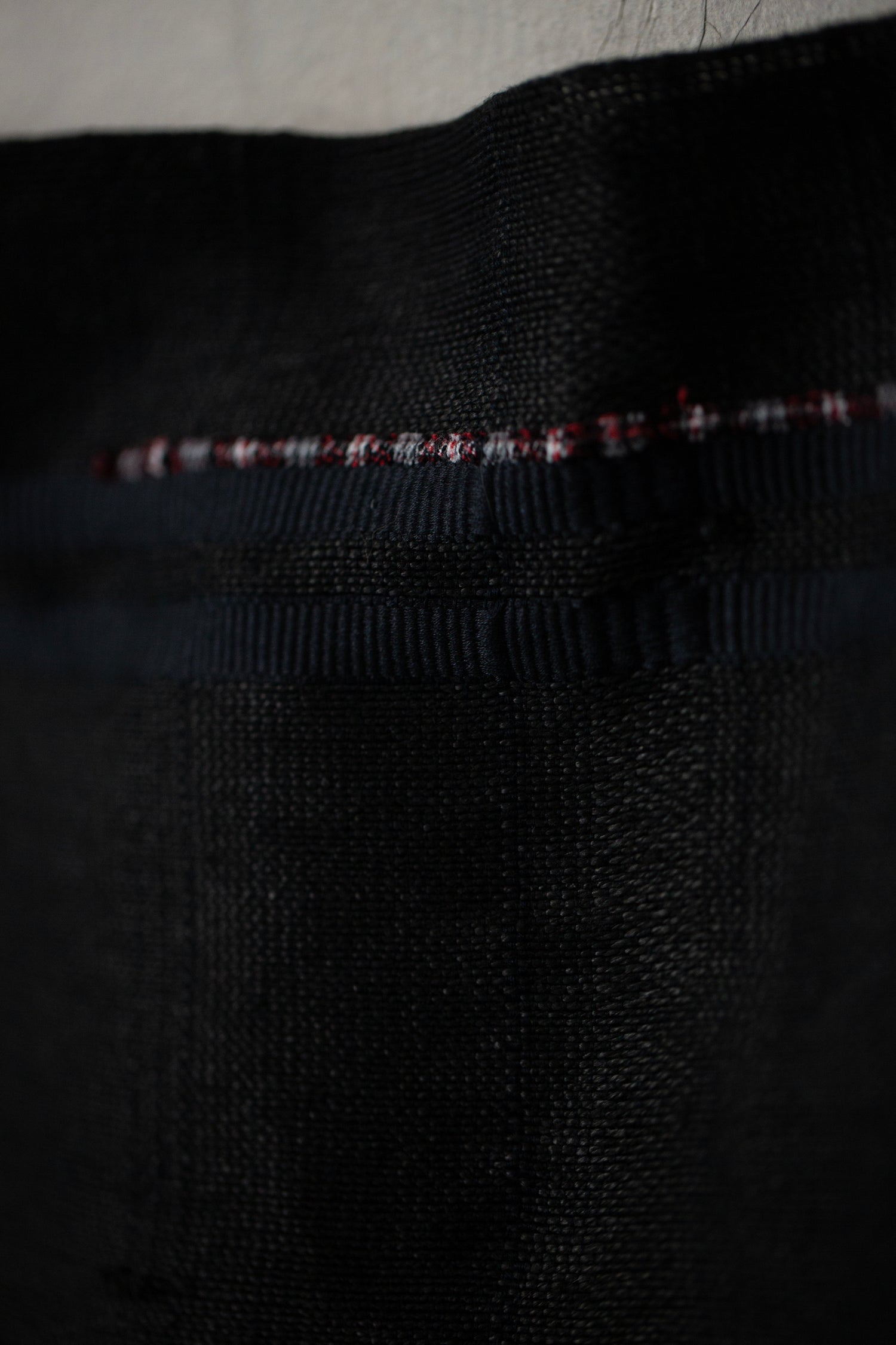 In linen and cotton, woven in various structures, with details in muga silk from Assam.