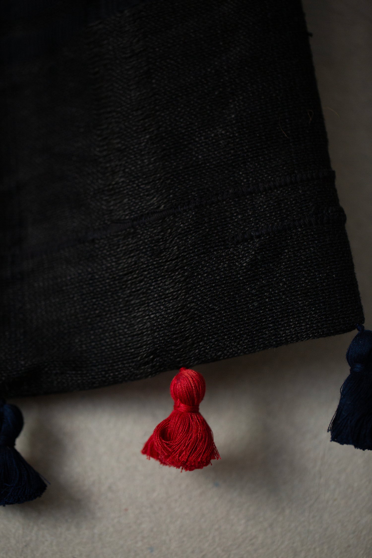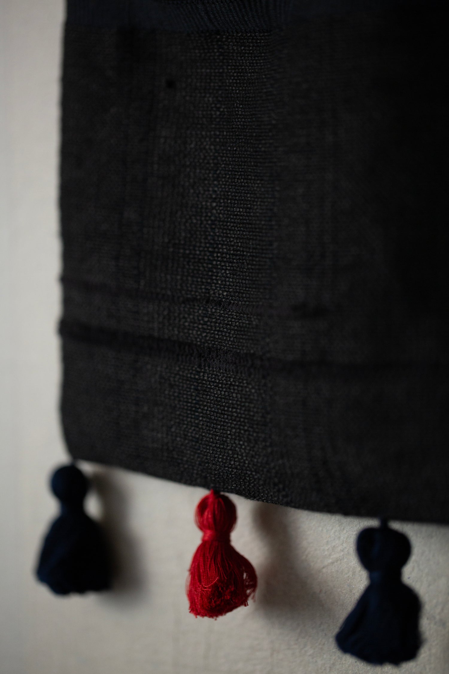 A hand woven small carrier bag, self lined with linen whipped straps and attached tassels by contemporary weaver Christopher Duncan.