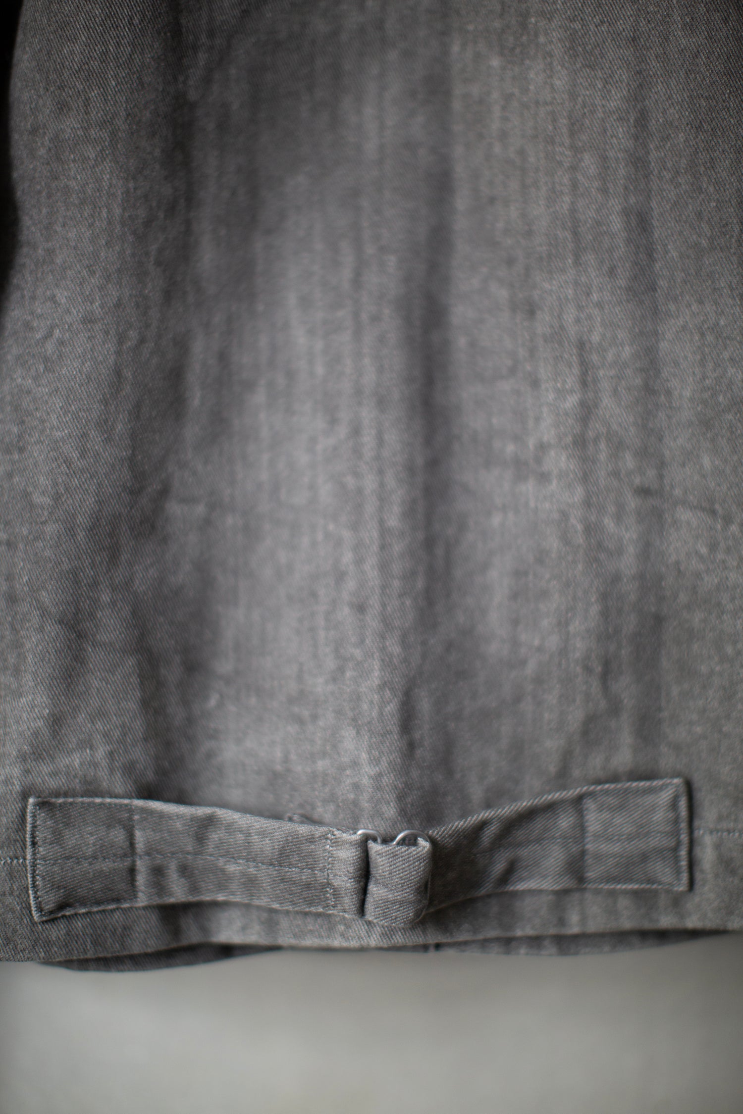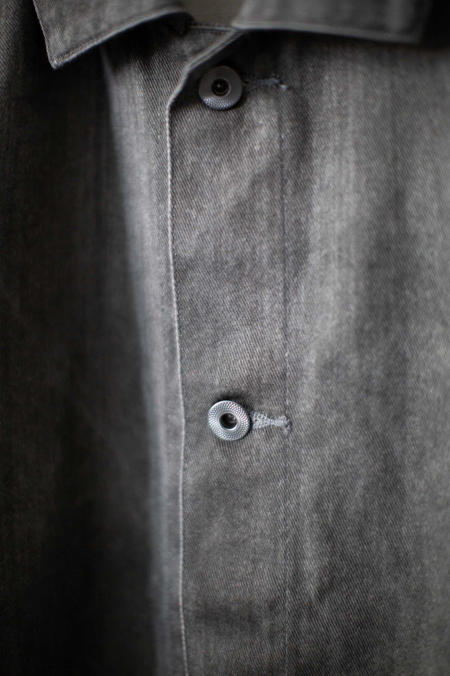 Hand drawn sumi coverall jacket by Taiga Takahashi with engraved unplated metal buttons, patched front pockets and belt buckle in back.
