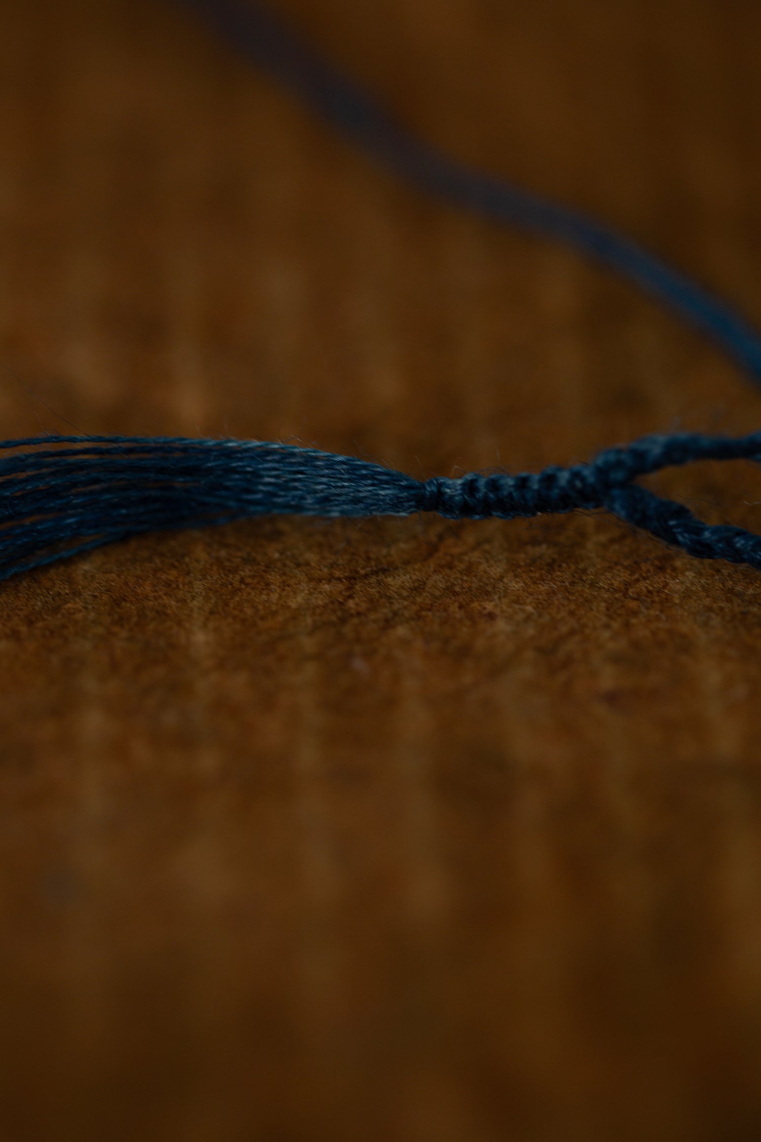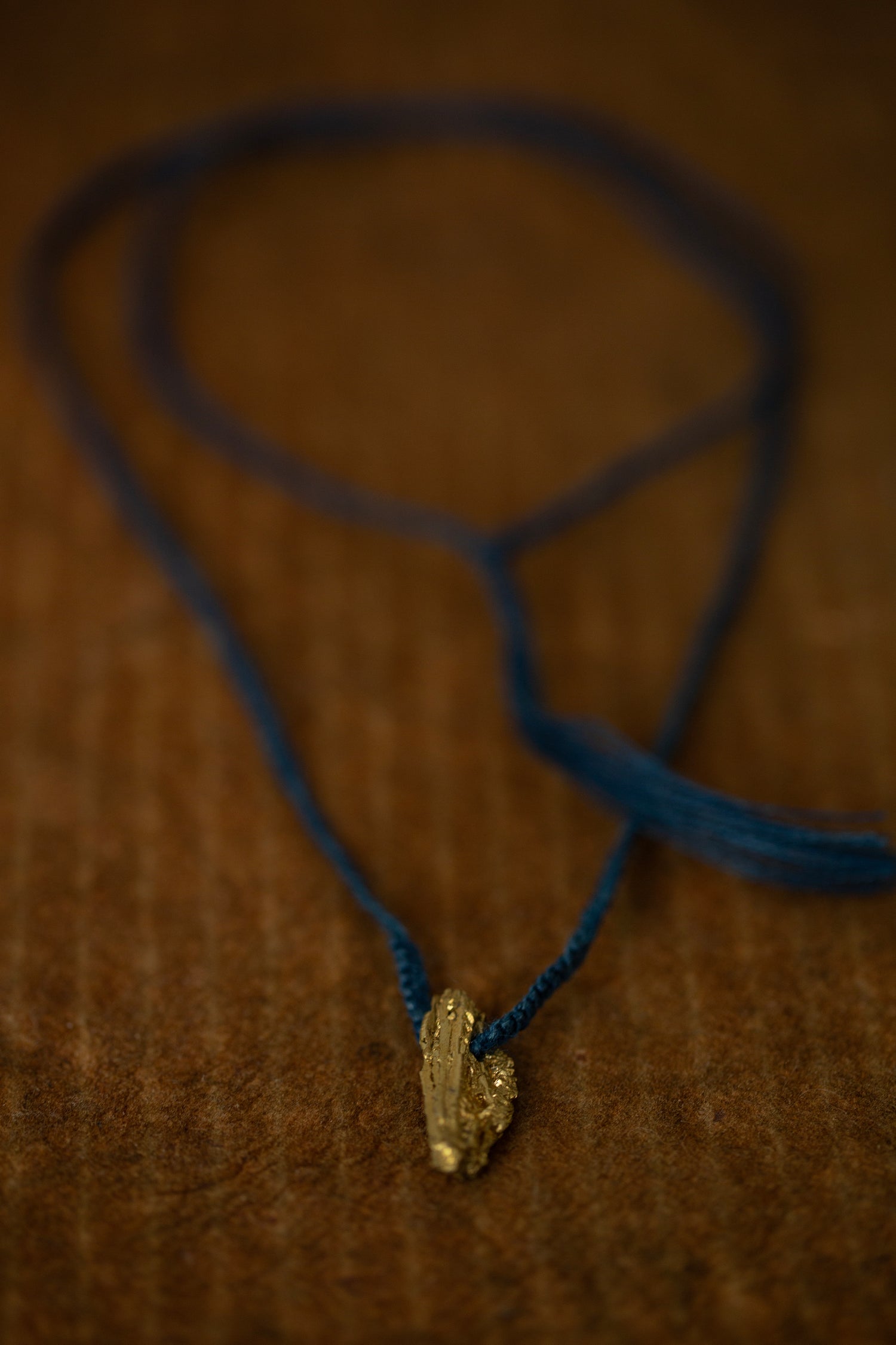 Hand made brass fragment necklace with aizome (indigo) hand yarn dyed linen cord.