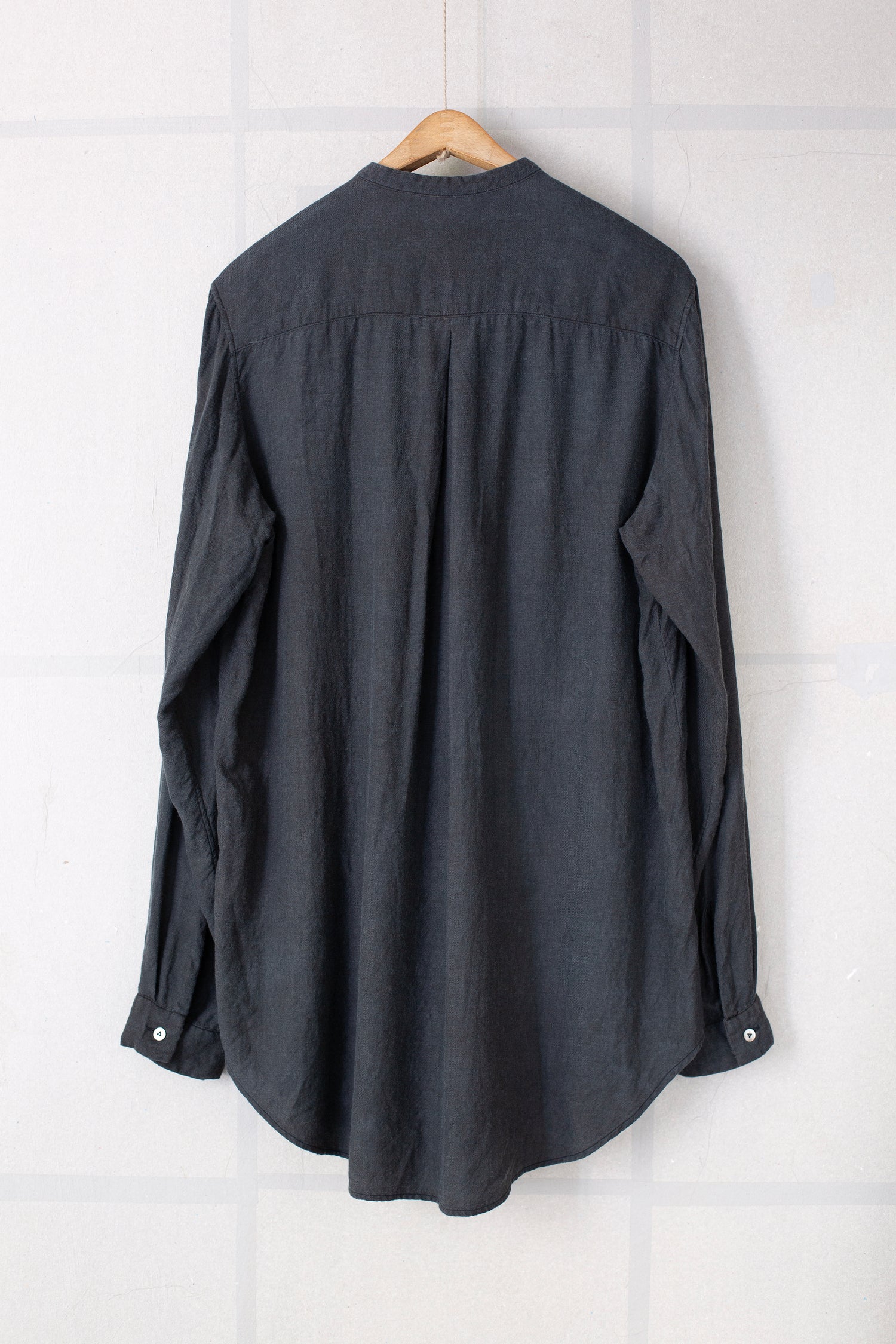 Hand spun and hand woven wool side slit shirt by Amachi in Natural Dye navy black with no collar, mother of pearl buttons, inverted box pleat in back and rounded hem.