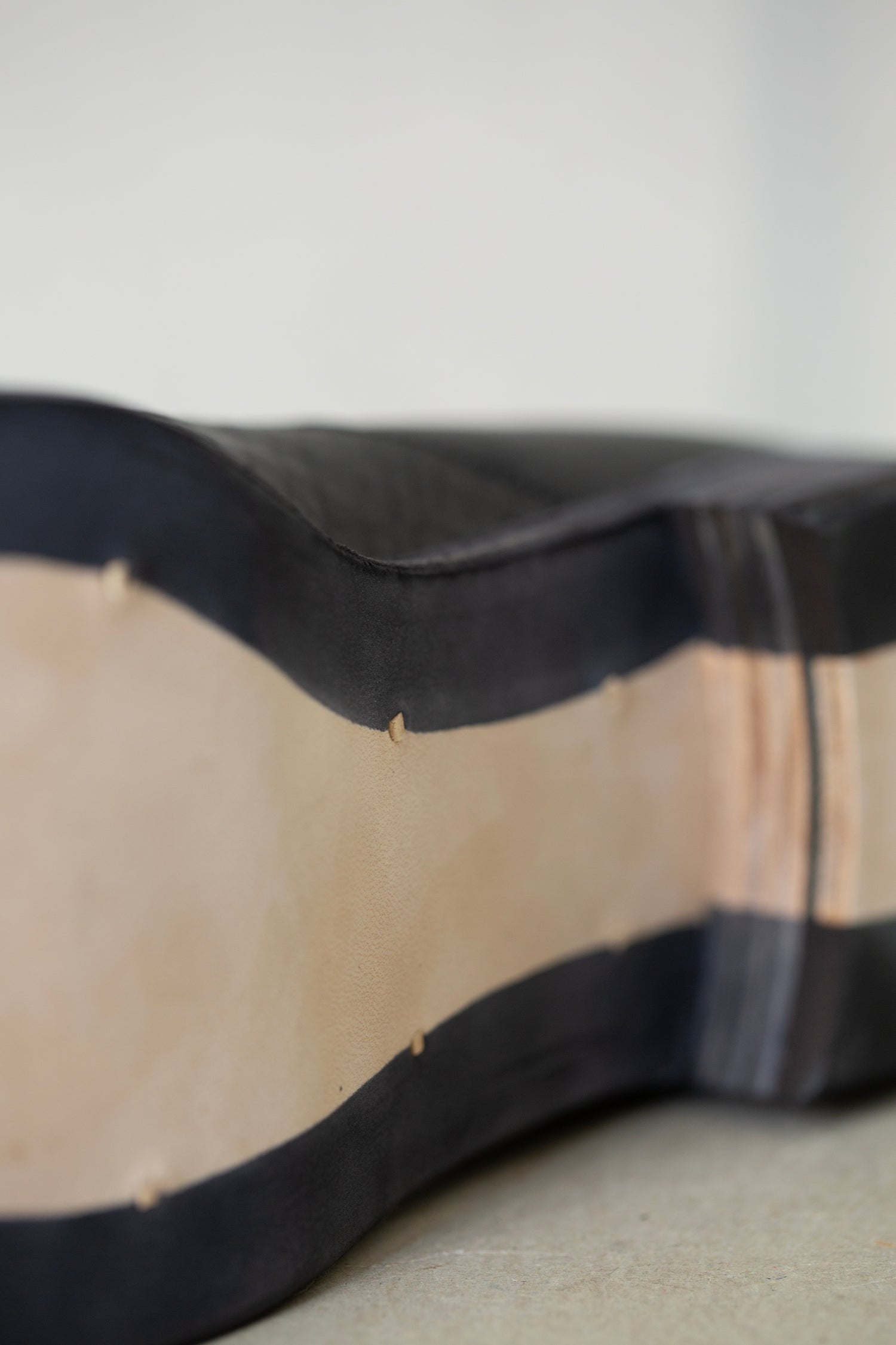 Black leather ankle Mckay ankle boots with slightly highered sole, waxed cotton laces and back slit, handmade by Petrosolaum in collaboration with Jan-Jan Van Essche for the PROJECT#11 - RITE (AW2R) collection.
