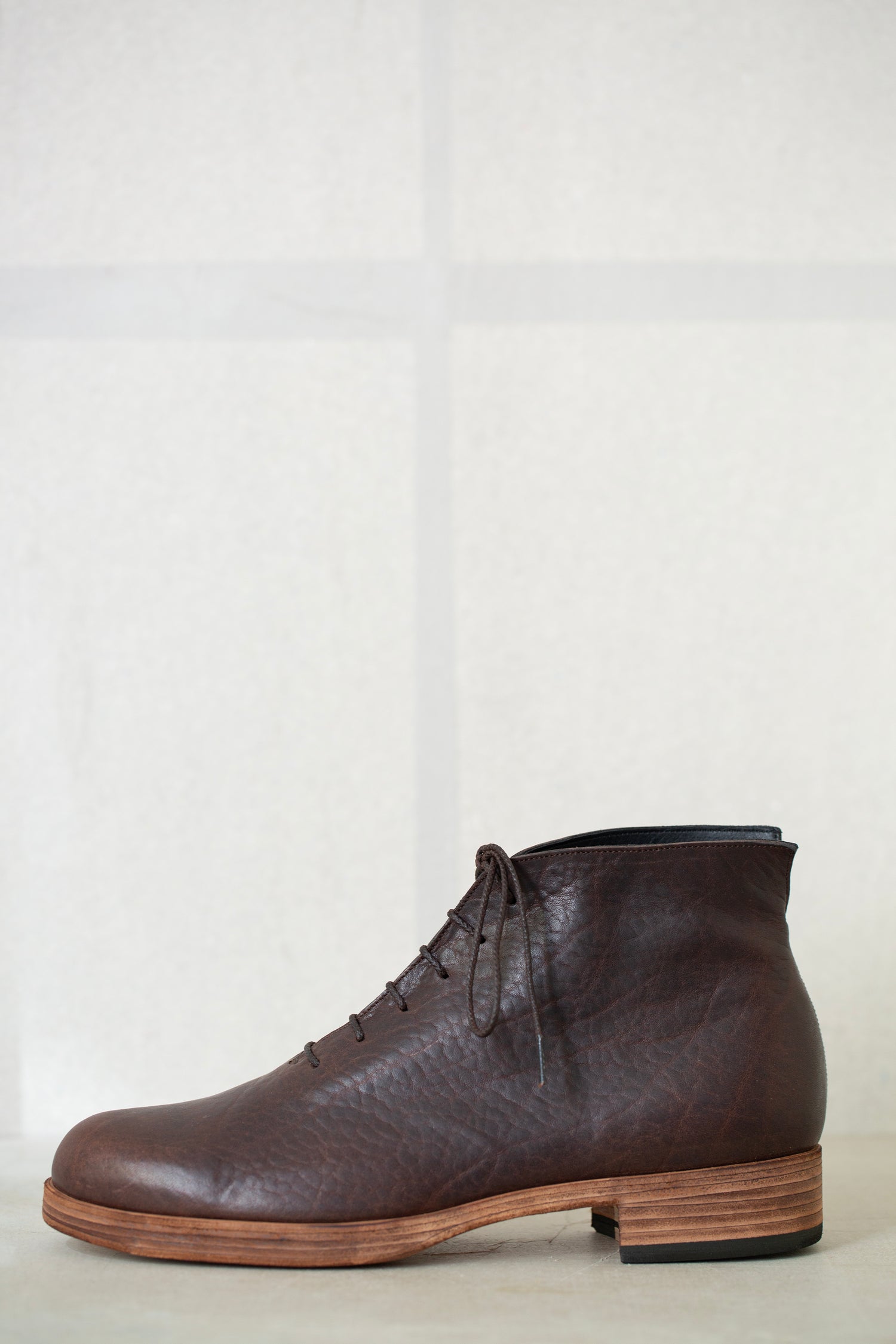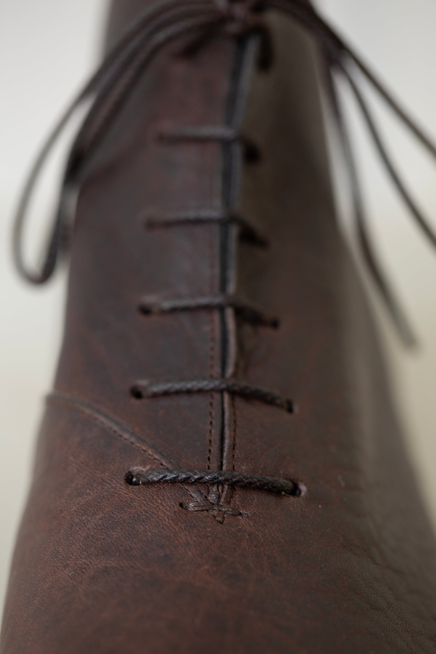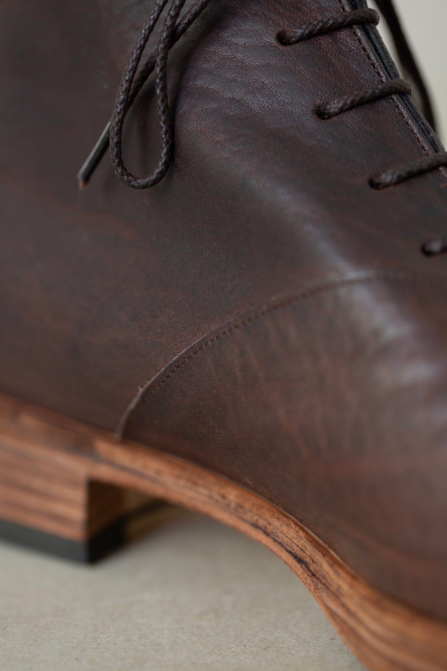 Dark Brown leather ankle Mckay ankle boots with slightly highered sole, waxed cotton laces and back slit, handmade by Petrosolaum in collaboration with Jan-Jan Van Essche for the PROJECT#11 - RITE (AW2R) collection.