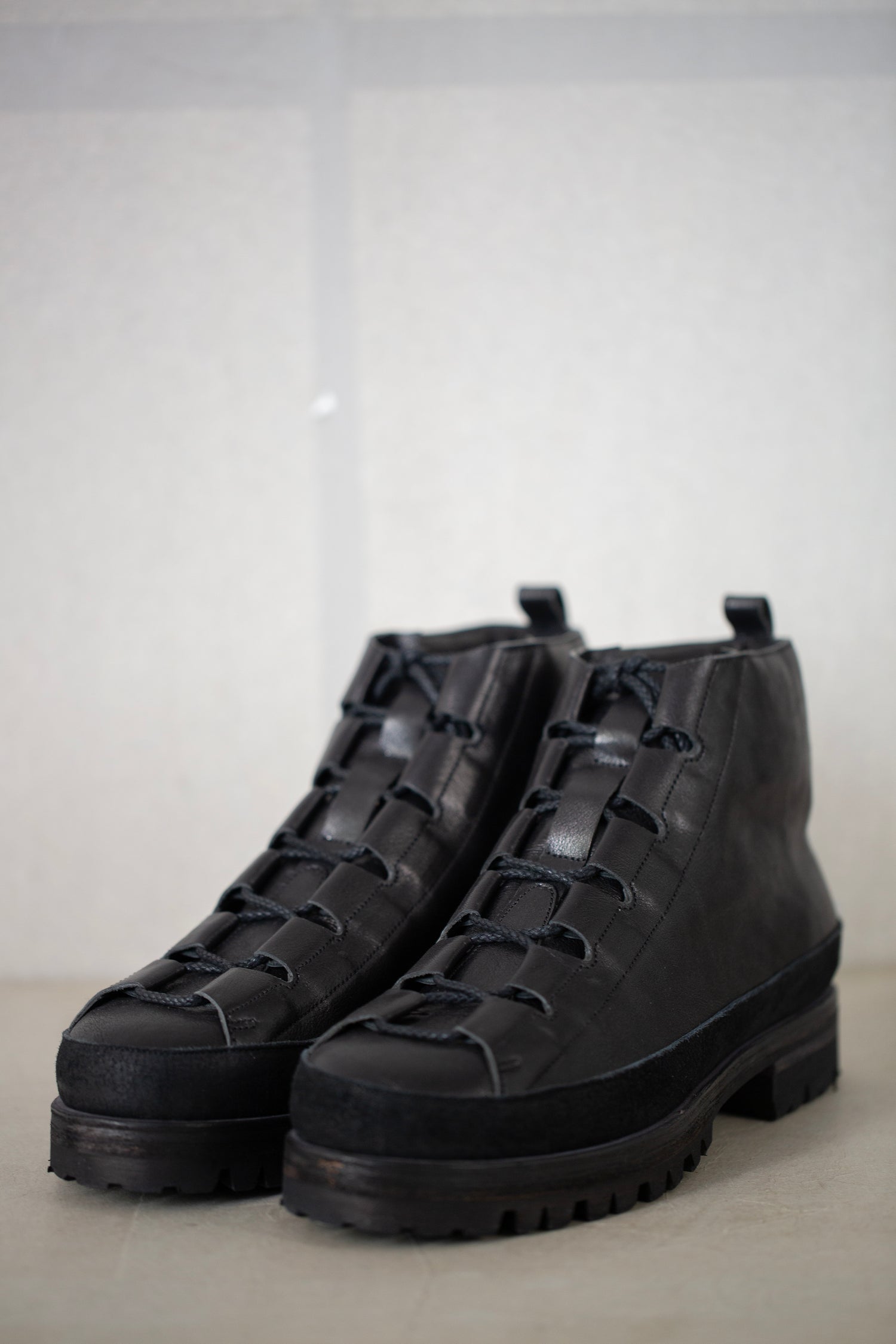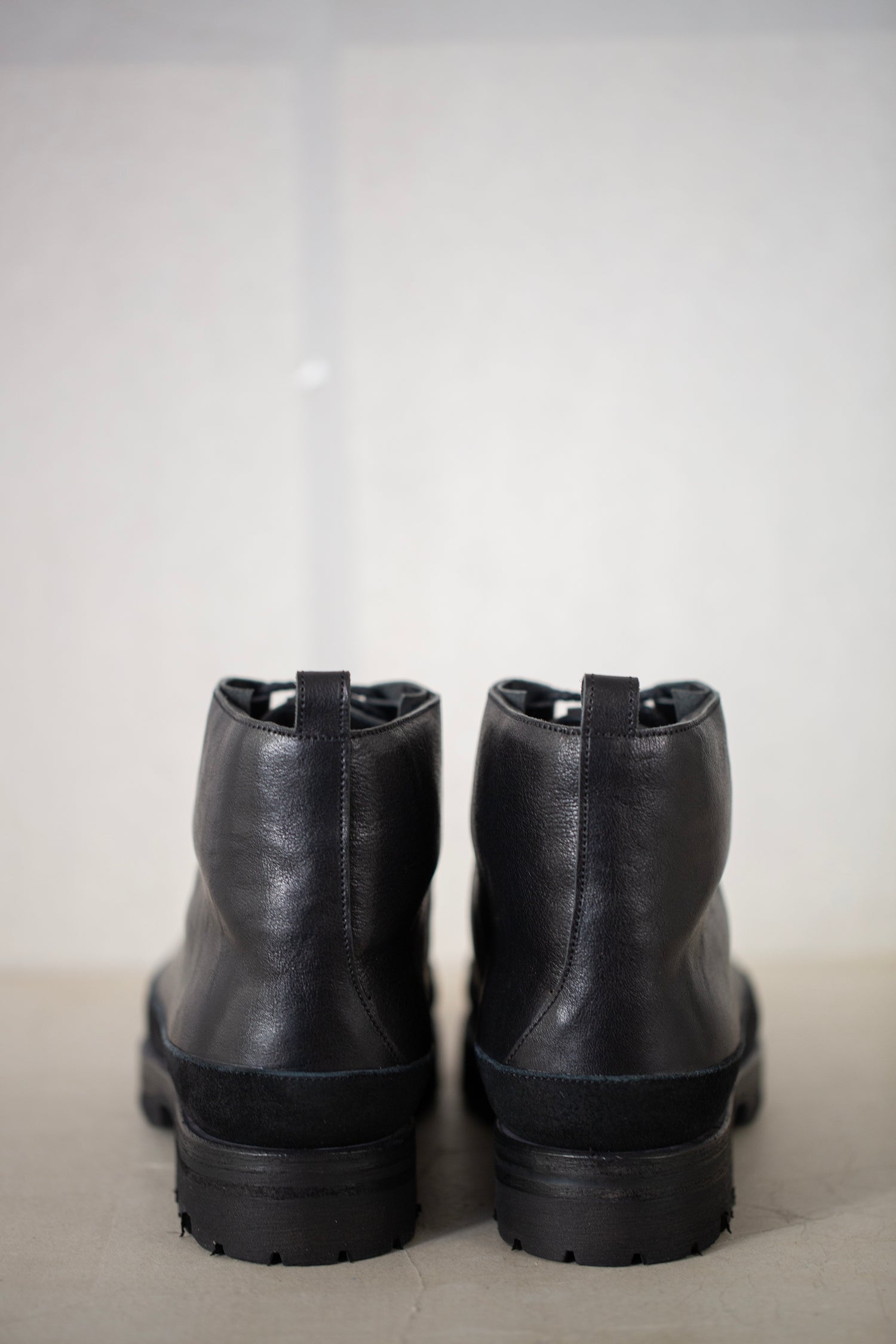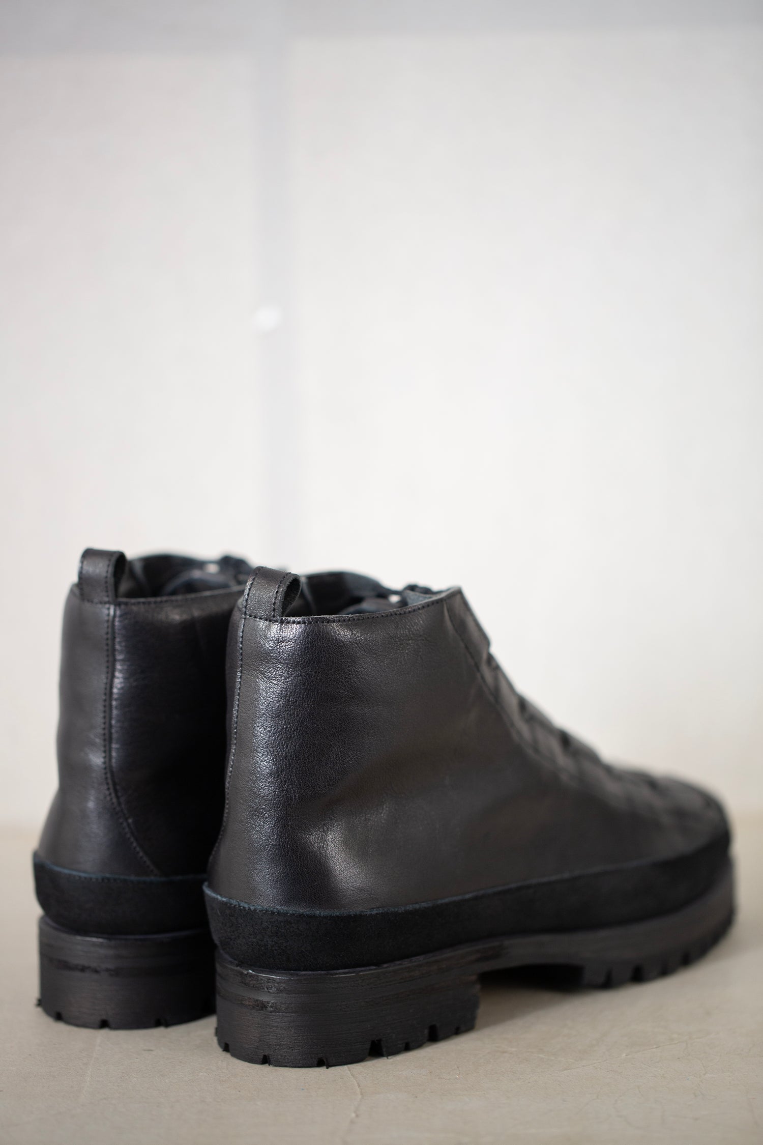 Pit-dyed cow and horse leather trekking shoes with Vibram sole and leather lining, handmade by Petrosolaum in collaboration with Jan-Jan Van Essche.