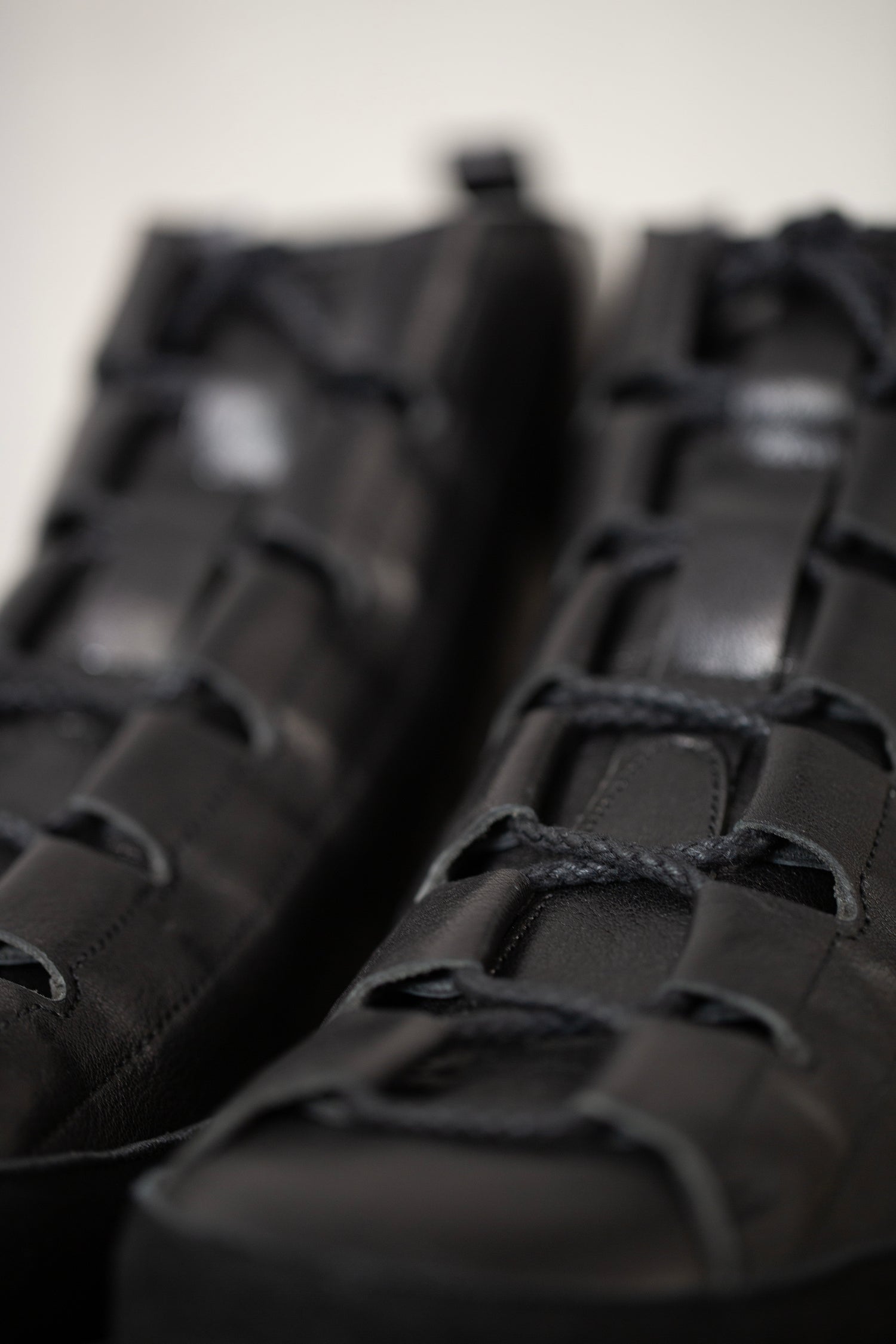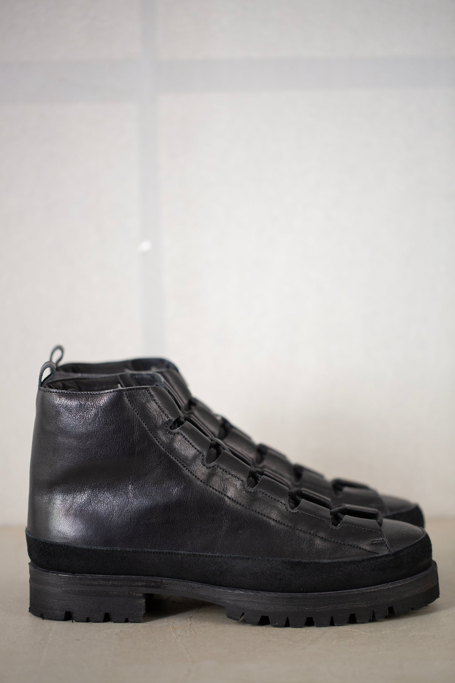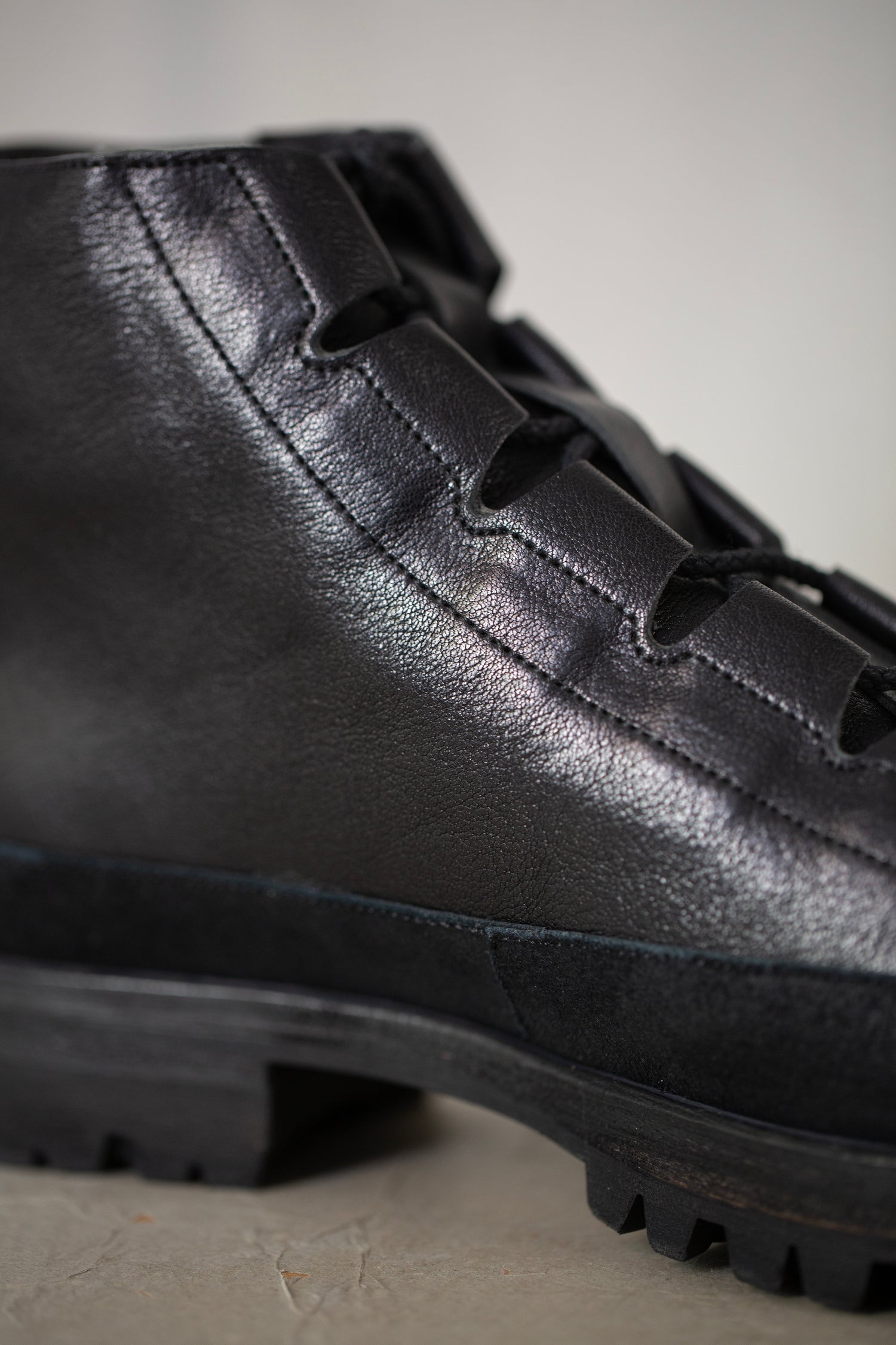 Pit-dyed cow and horse leather trekking shoes with Vibram sole and leather lining, handmade by Petrosolaum in collaboration with Jan-Jan Van Essche.